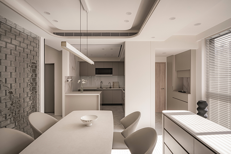 绕过楼梯来到餐厅,这道玻璃砖牆便成用餐场域最具表情的背景——砖面折射的粼粼光泽,为素淨空间注入细緻的肌理变化。天花採层叠弧线柔化结构存在,一盏纤长的线性吊灯垂悬而下,精准地为浅色石面餐桌标定出聚拢的中心;一侧 L 型厨房顺势延展,藉由半高中岛吧台衔接餐区,让炊食、餐叙与客厅的光线在同一条动线上自然流动。午后暖光顺着窗沿漫入桌面,铺开一层细密明暗韵律,共同编织出恬澹明朗的餐叙时光。