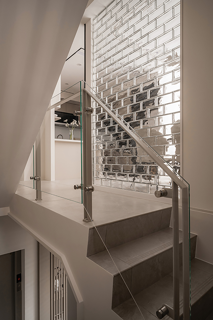 拾级而上,整面玻璃砖牆如清透冰晶般层层堆叠,日光穿透砖体后化为柔润漫射,一路沿阶梯向下蔓延至公领域深处,也顺势补足了楼梯间原本容易忽略的採光层次。金属支架搭配透明玻璃扶手,纤细的结构感护持动线,又不争抢视觉份量,垂直场域裡的轻盈通透因此能够完整保留。