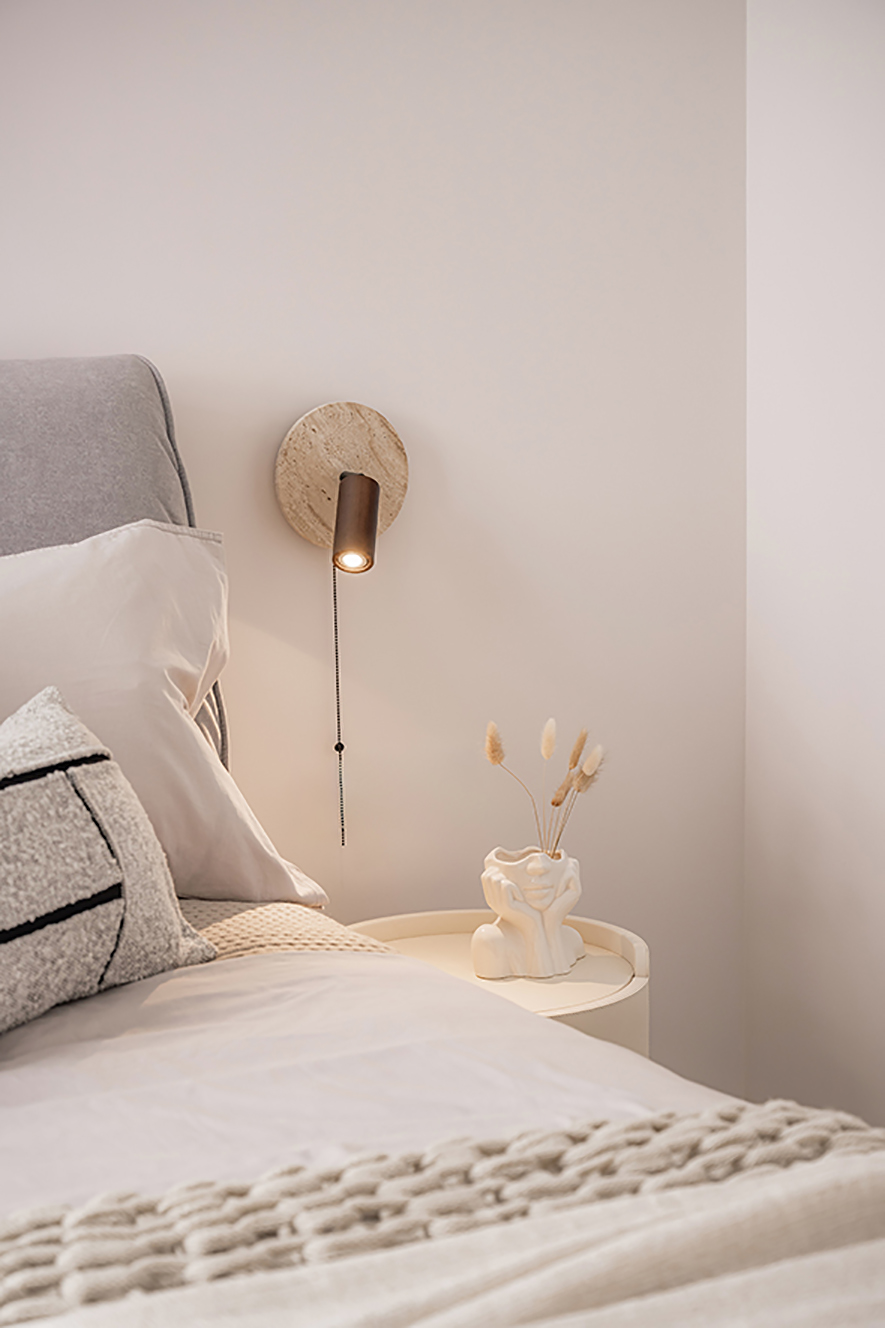 延续全室的淡雅气质,卧房以灰调布质床头靠背带入一丝沉静的色彩温差,布艺软包结合石材底座,既是触感的温柔起点,也悄悄为床头立面勾勒出从容轮廓。床侧一盏石材底座的拉绳壁灯,投射出一束收敛而亲密的暖光,恰好落在床头柜一方小小角落,构成入睡前最后凝视的温柔静物。