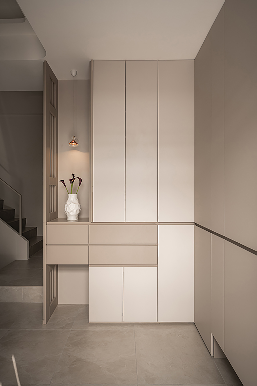 达誉设计团队 用浅灰米调铺陈全室,班杰明涂料细腻的色泽,令每一面牆都化作承接日光的柔软画布;牆面顺着婉转弧度串起空间节奏,一路引领视线自在流转,也同步担起动线导引与结构收边的双重角色;遍布各处的无把手柜体,将平整面板与牆面齐平共融,生活琐碎尽隐其后。从色调到材质、从光线到轮廓,一室安宁暖意层层铺叙,为归家时刻轻声写下最舒心的注脚。