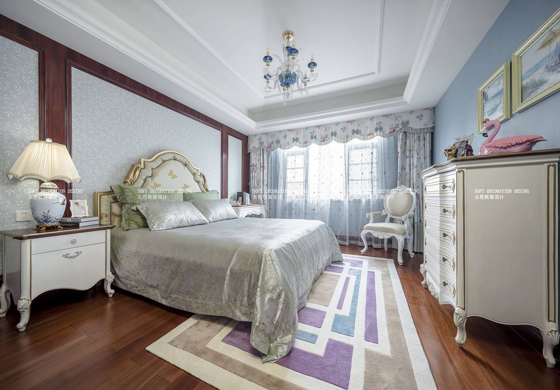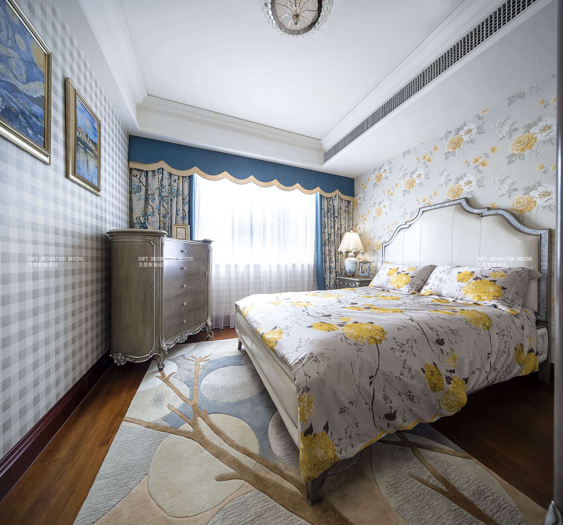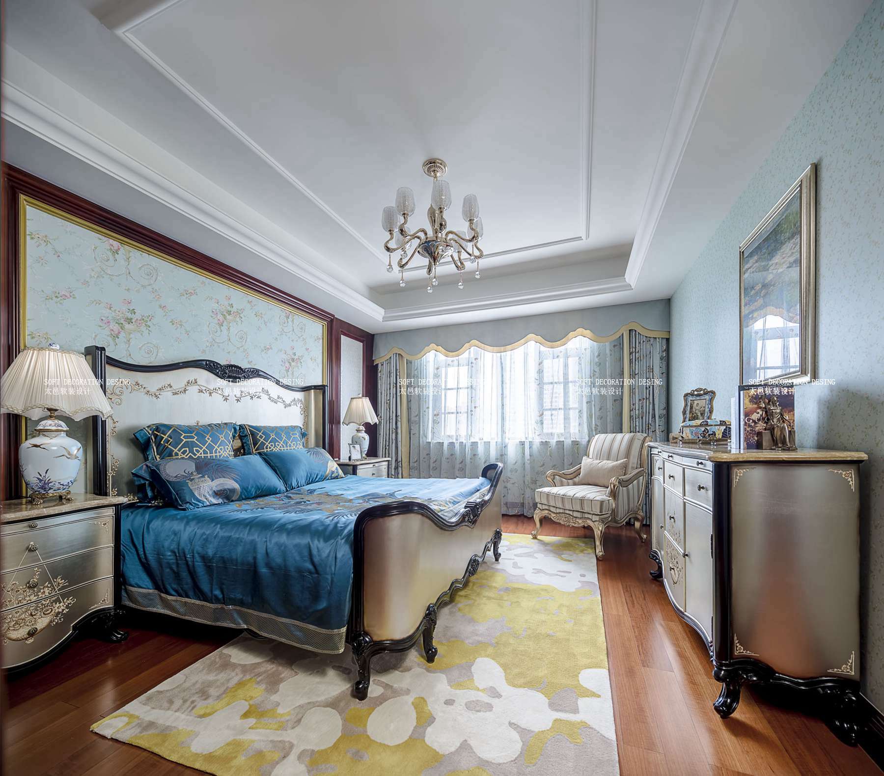 用户体验:设计师打破了以往成熟稳重的长亲房模式,选用极具英伦气质的墙纸做背景,搭配内敛灰色古典家具,典雅且高贵,舒适的白色真皮背靠在花式床品以及繁华背景之间保持着整体的平衡。稳重大气且不失空间动感。