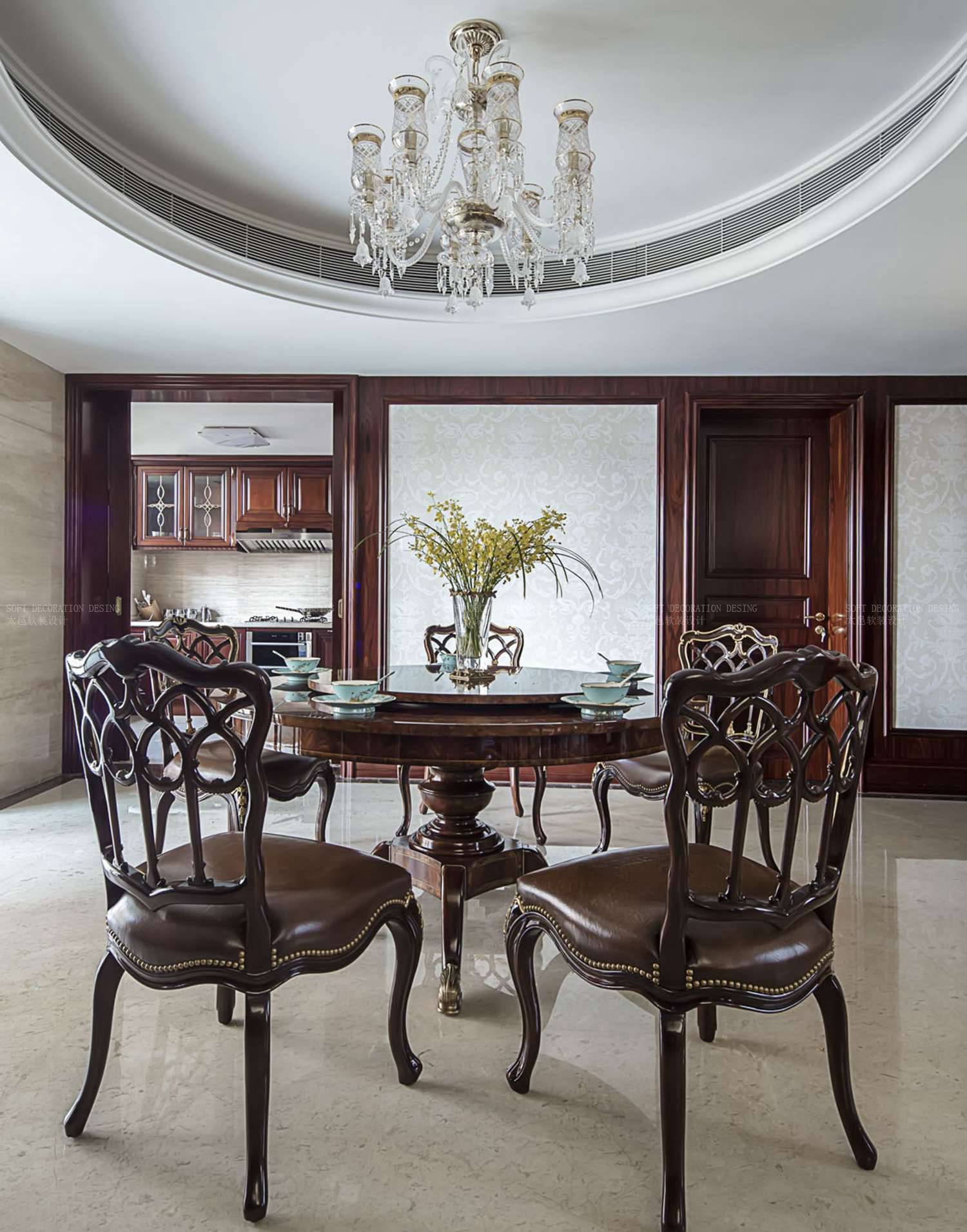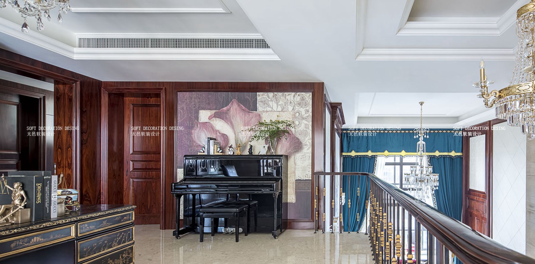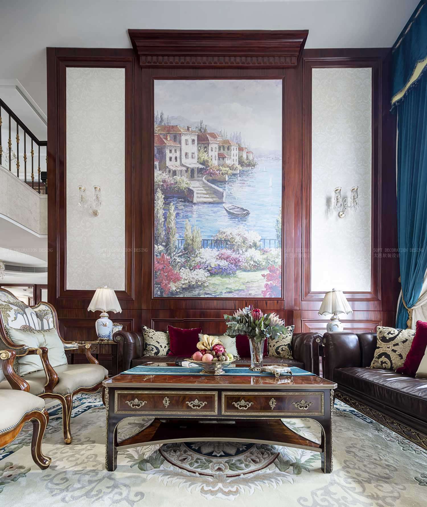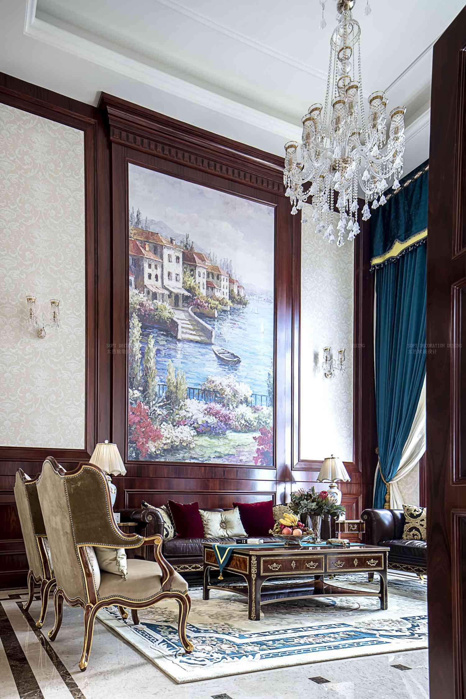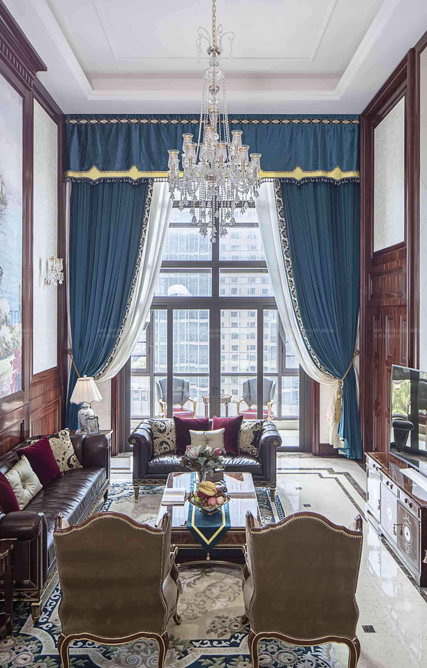 设计选材:6米高的挑空客厅采用古典美式的轻奢格调,通过极致的品质感来呈现。皇家级超高品质的真皮沙发搭配一火焰纹饰纯铜镶边的长方形茶几,在赋有权利象征的翼背椅的交相呼应下,将整个空间的仪式感支撑起来。艳丽的酒红色抱枕与瀑布般的古典绿窗帘相互映衬,给整个空间给予了充分的活力与平衡感。高定的手工地毯与意大利纯手工吹制的Moollona风铃吊灯将客厅内的仪式感推向高潮,在此处静静的享受温馨的幸福时光。