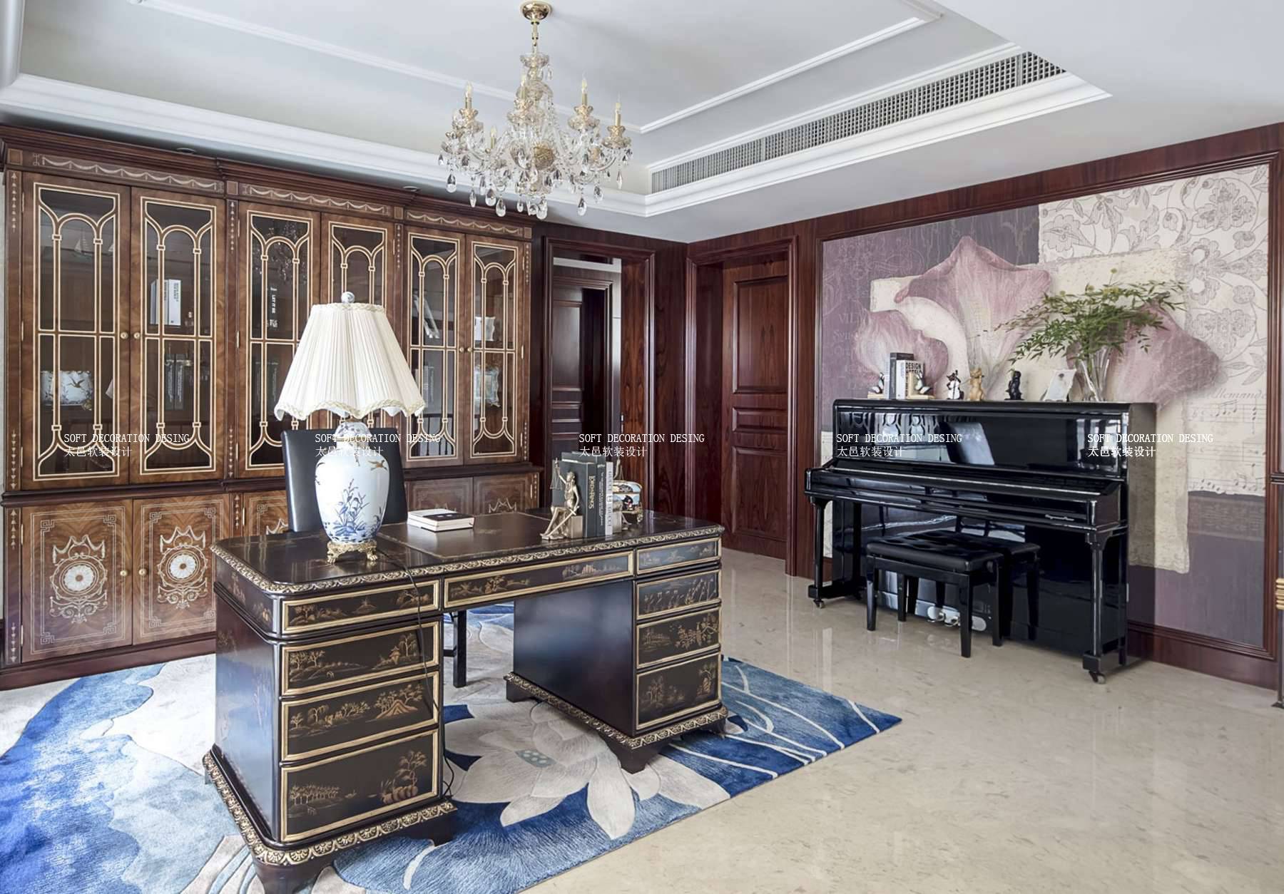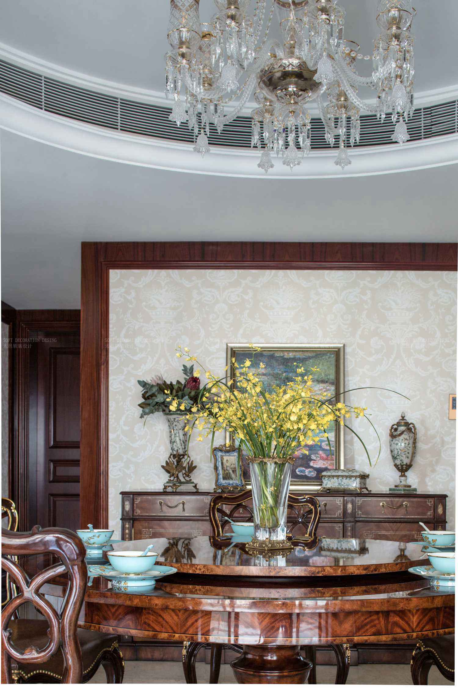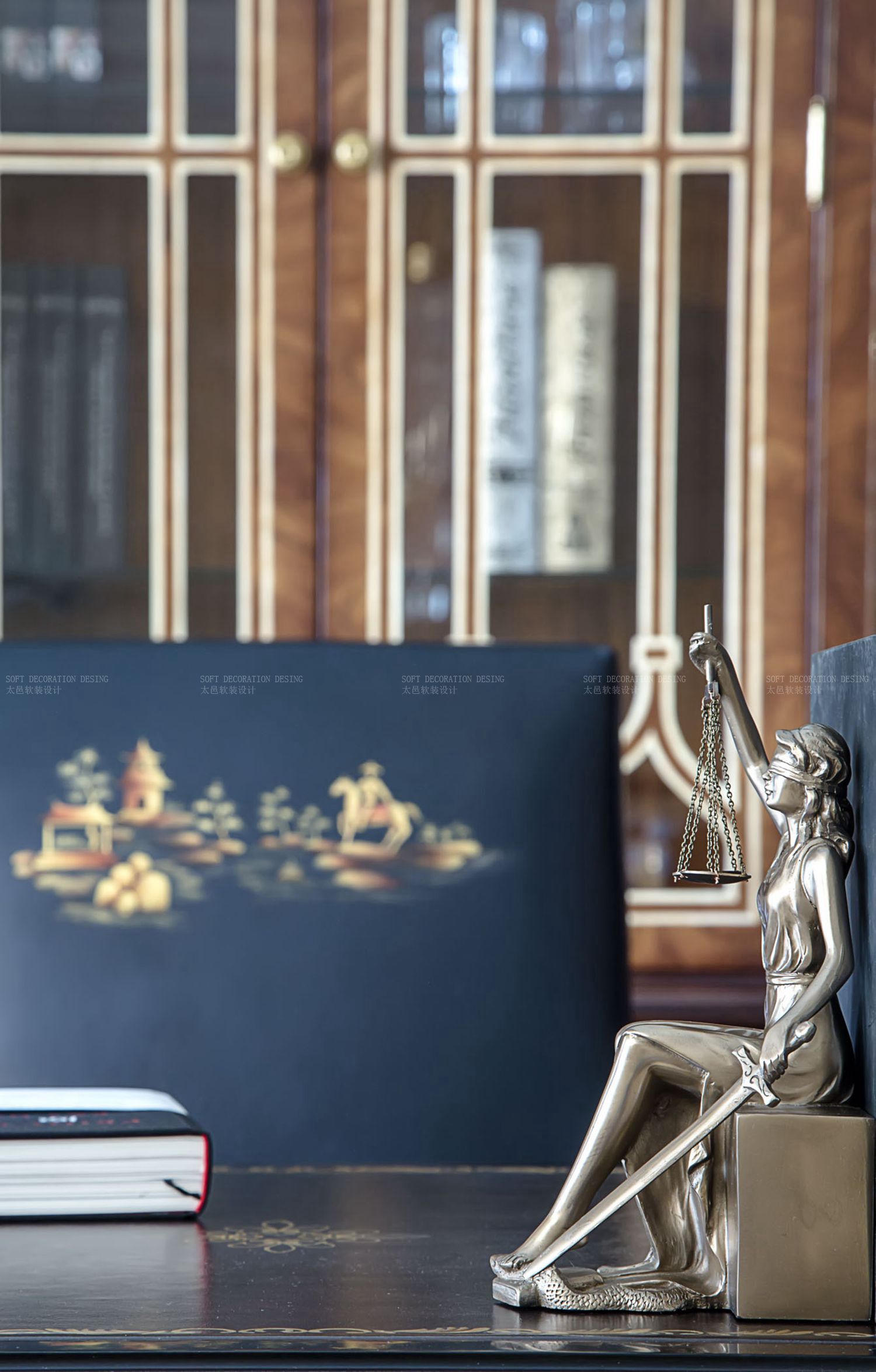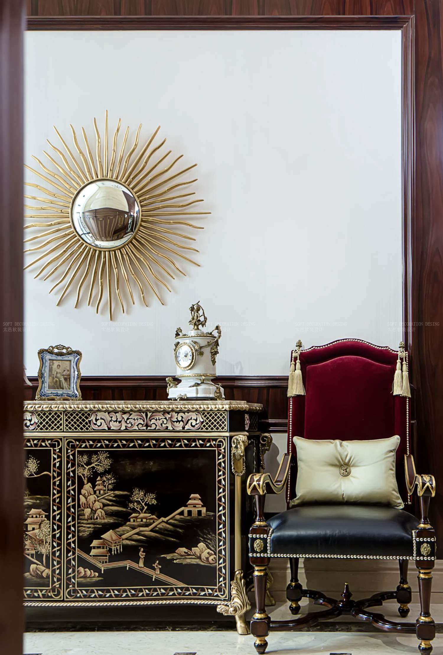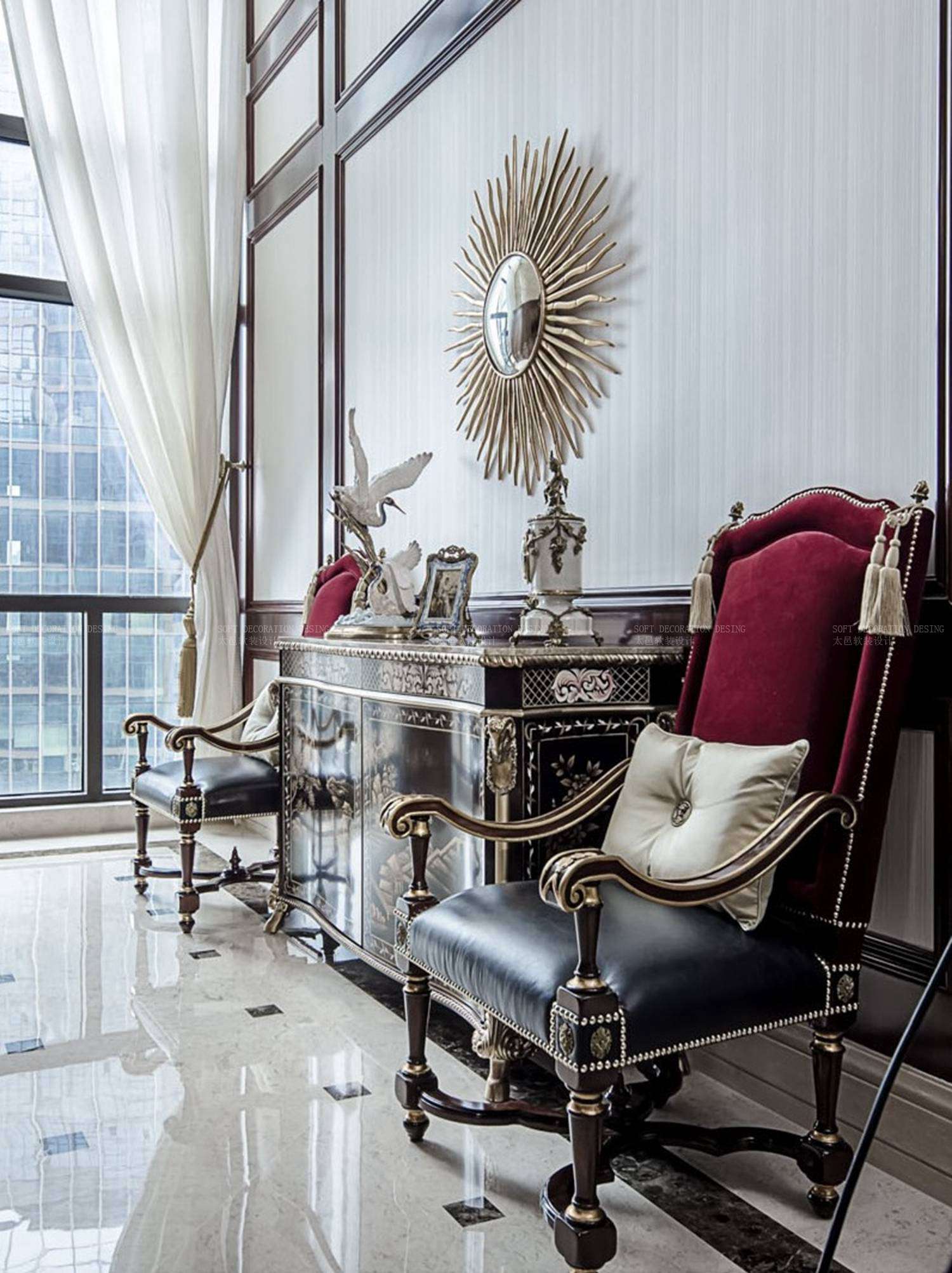 空间意境:轻盈灵动的纱帘有效烘托了空间庄重典雅高贵的氛围,端庄的巴洛克风格高背椅与中式手绘古铜雕刻边柜相互结合,不仅增添了空间的整体氛围感,更体现了空间内深厚的文化底蕴。