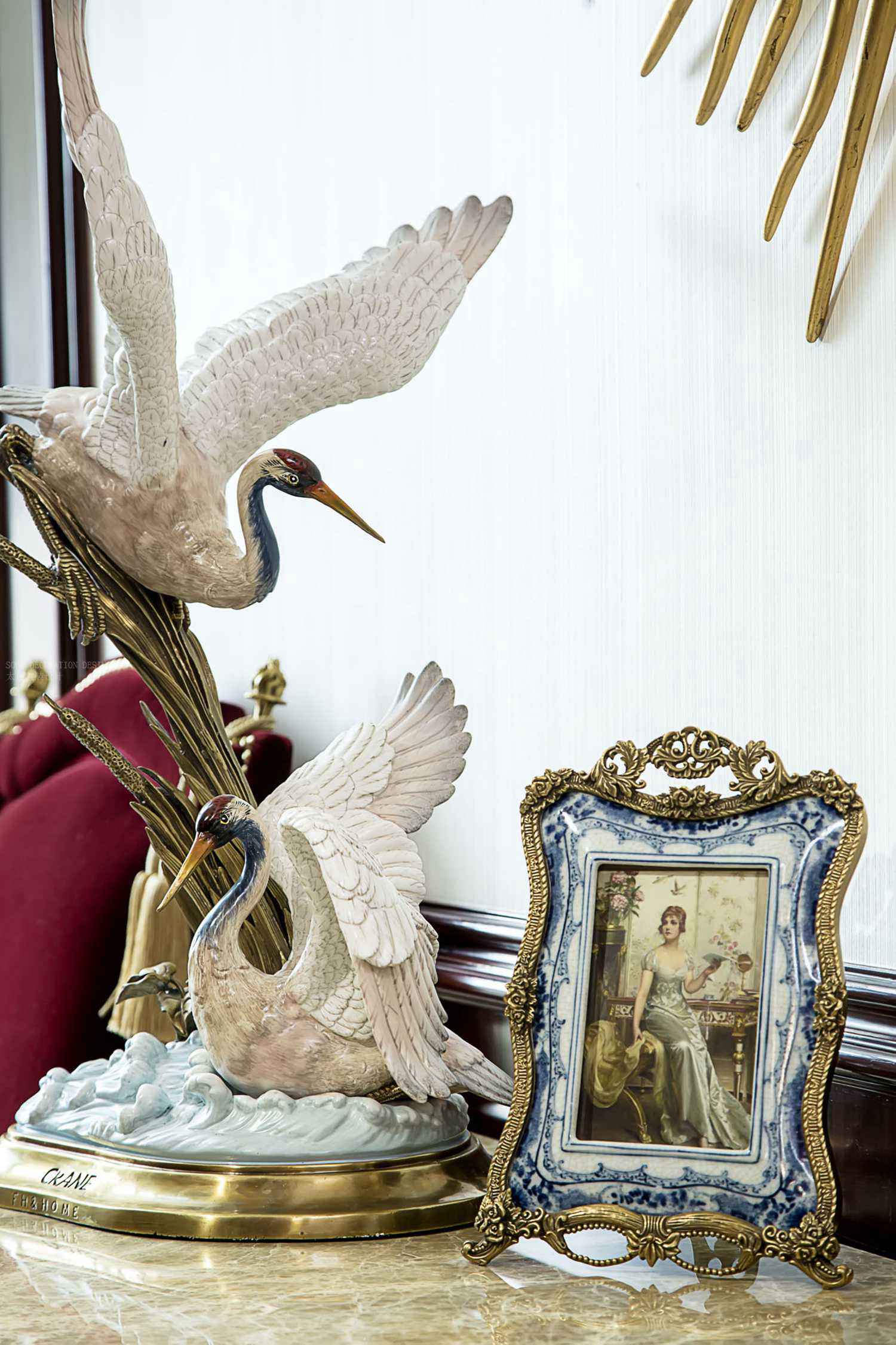 空间布局:精致的脱蜡铜陶瓷工艺品的点缀,给拥有贵气的入户花园起到画龙点睛的作用。爱恋永恒双鹤栩栩如生,与充满灵气的金色木雕太阳装饰镜之间既各自绽放异彩,又彼此相映成辉。