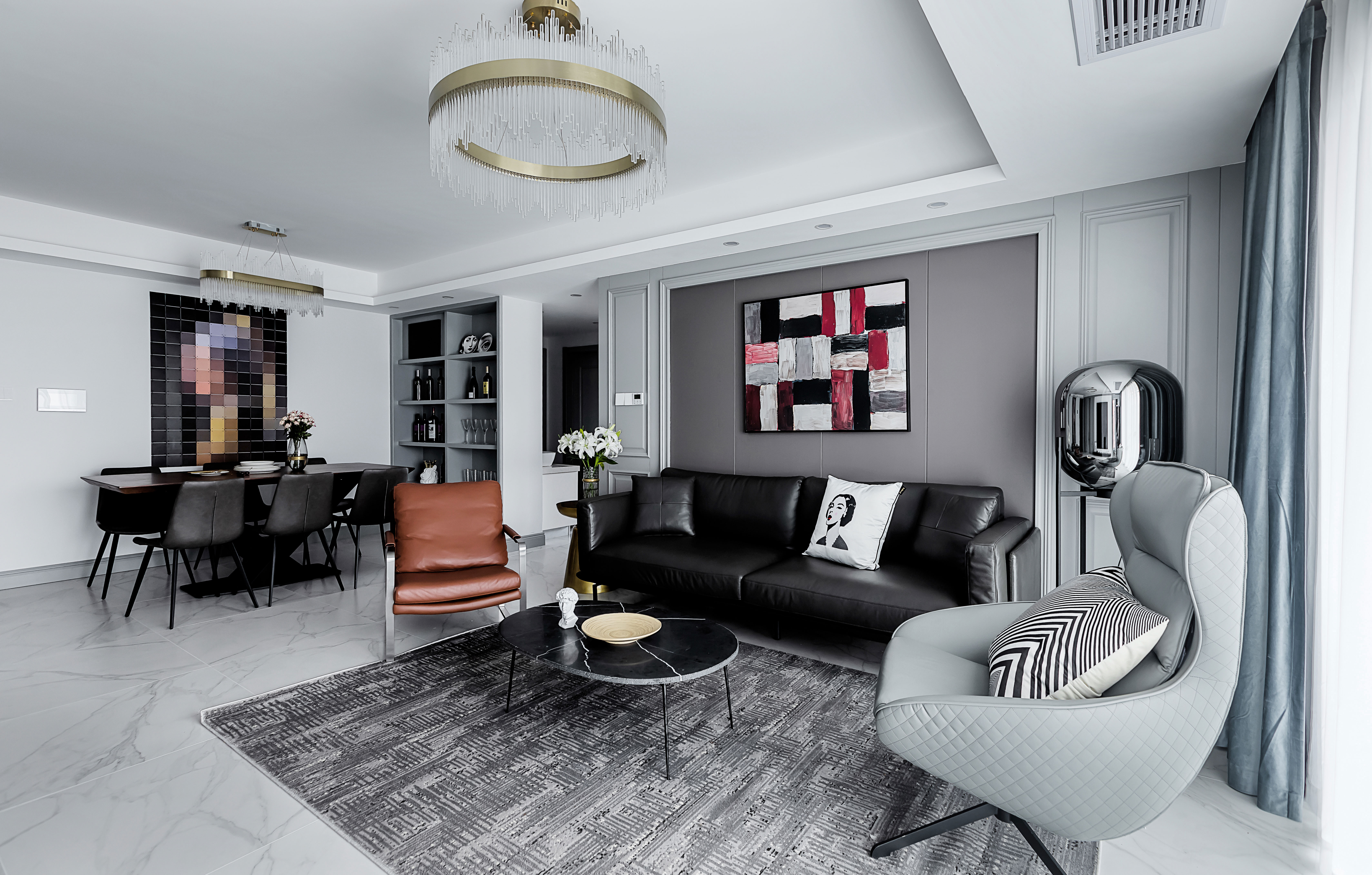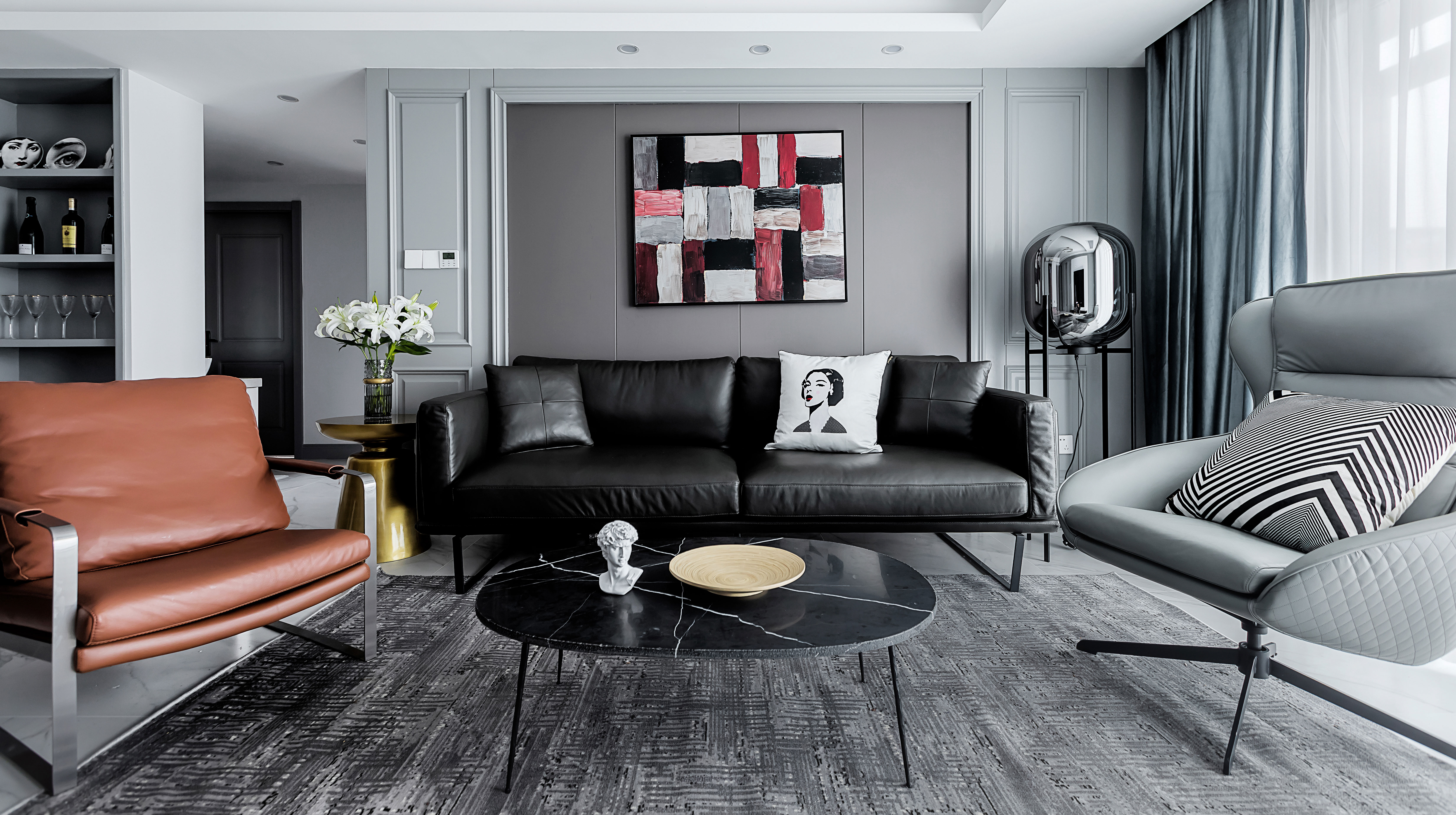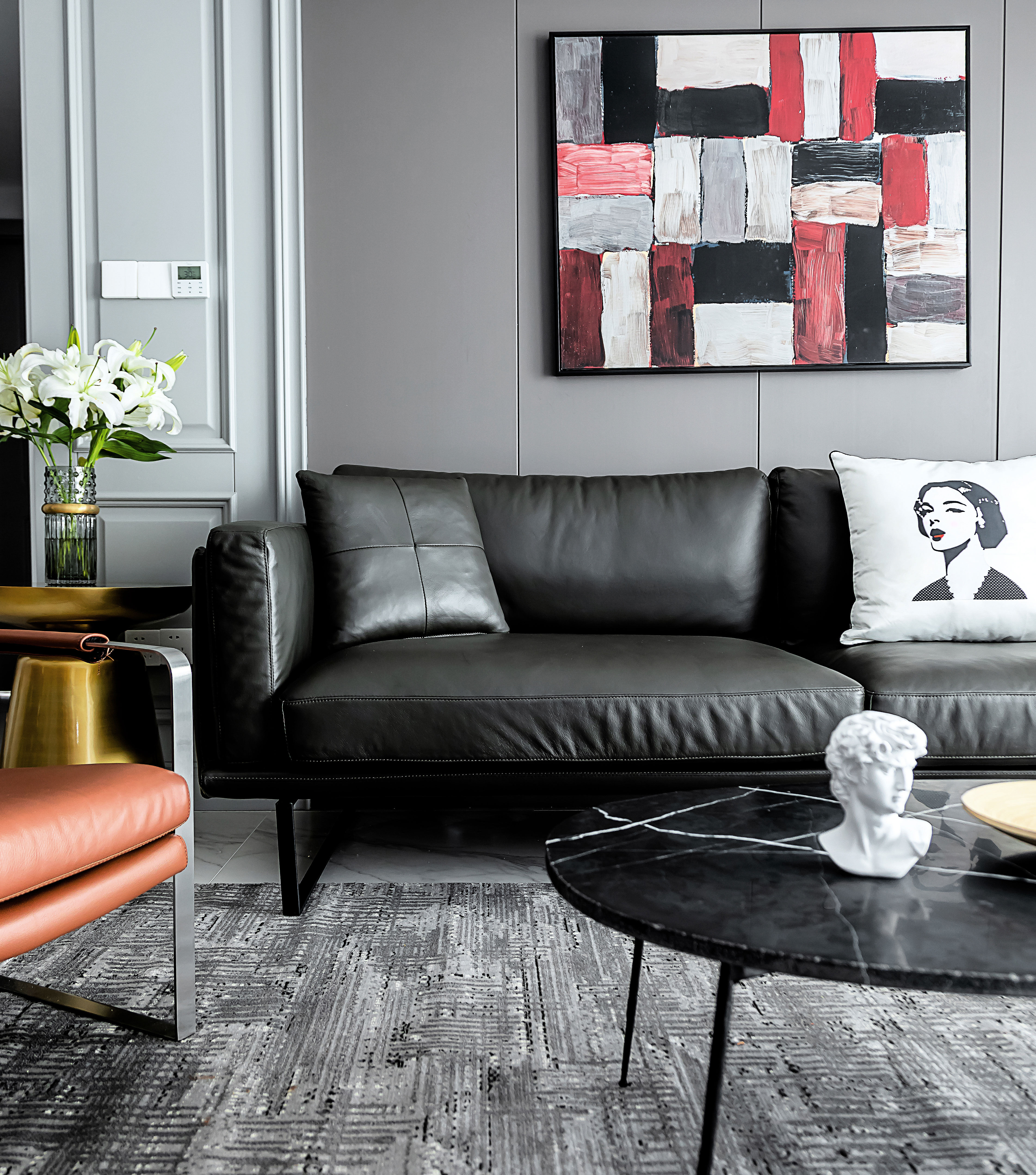 浅灰色系的地板搭配现代的沙发, 低调舒适还不失和谐。 真皮的质感,一种更为稳重的感觉, 装饰画和落地灰镜面落地灯的搭配, 整个空间带来不一样的精致感。