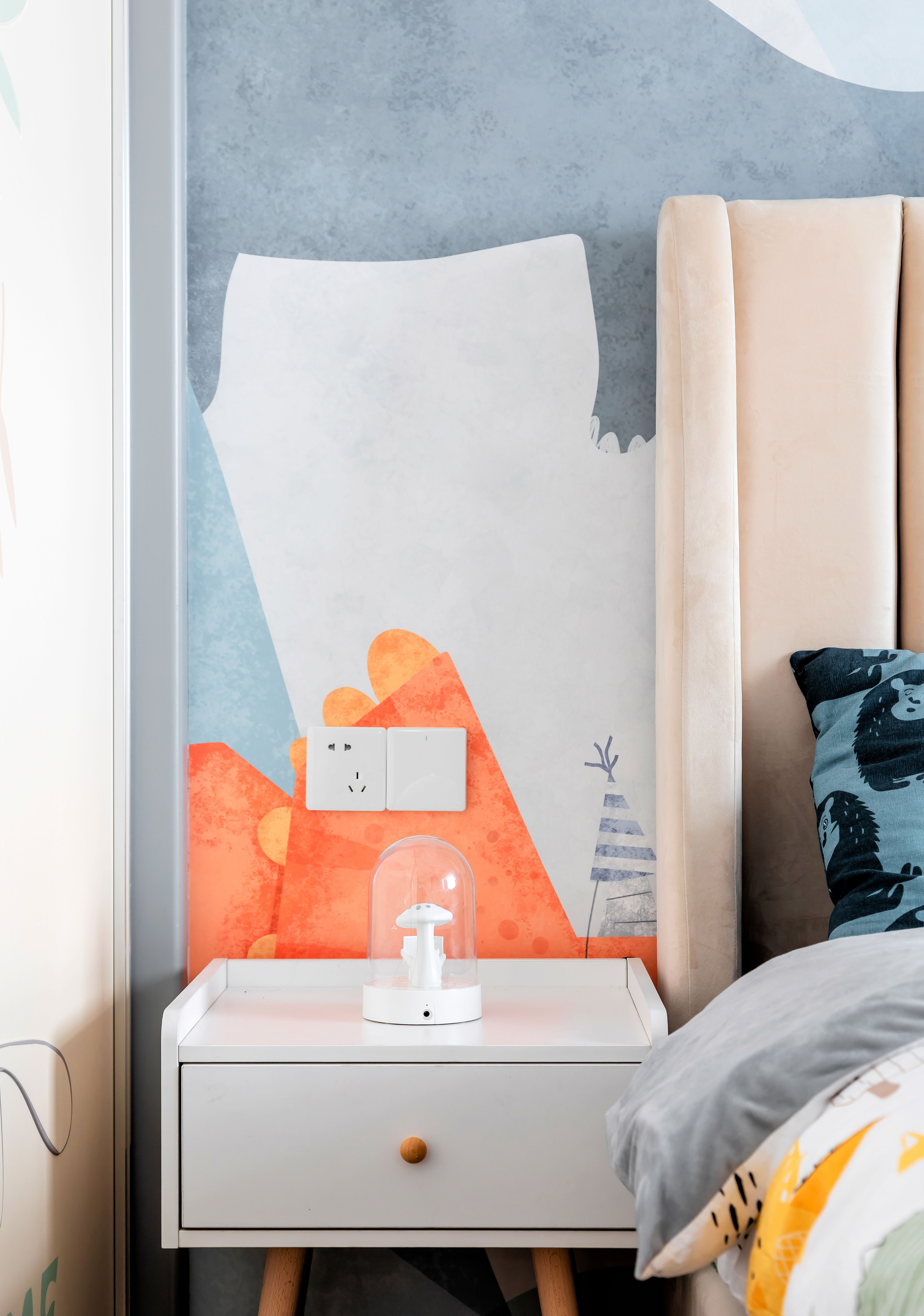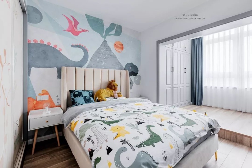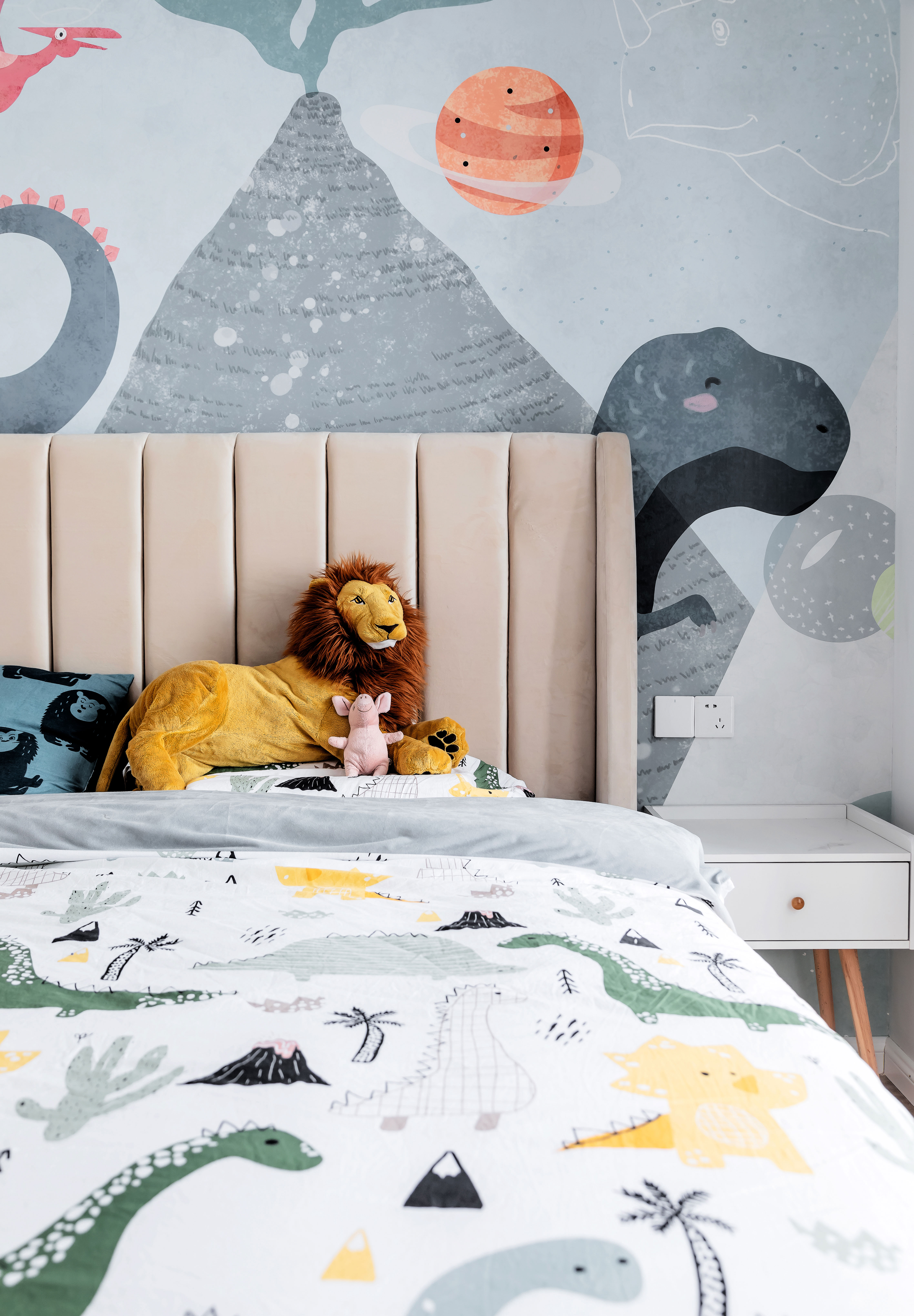 儿童房明亮颜色,整个空间显得更加的欢快。动物的元素, 让孩子享受在这“动物世界”氛围里。 墙壁上的绘画也能为整个空间添色不少,相比较主卧稳重的风格,儿童间则显得更加的跳跃和生趣。
