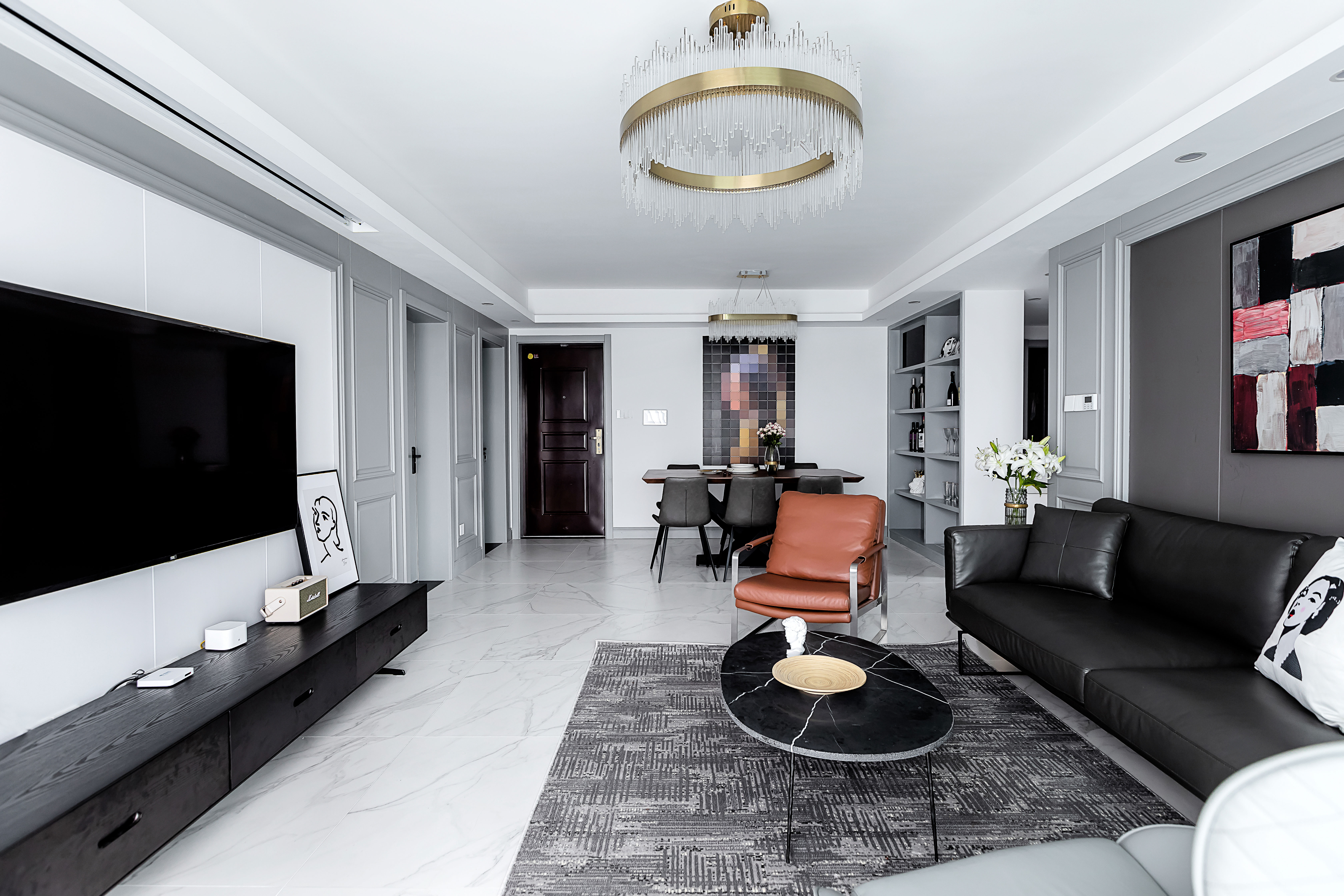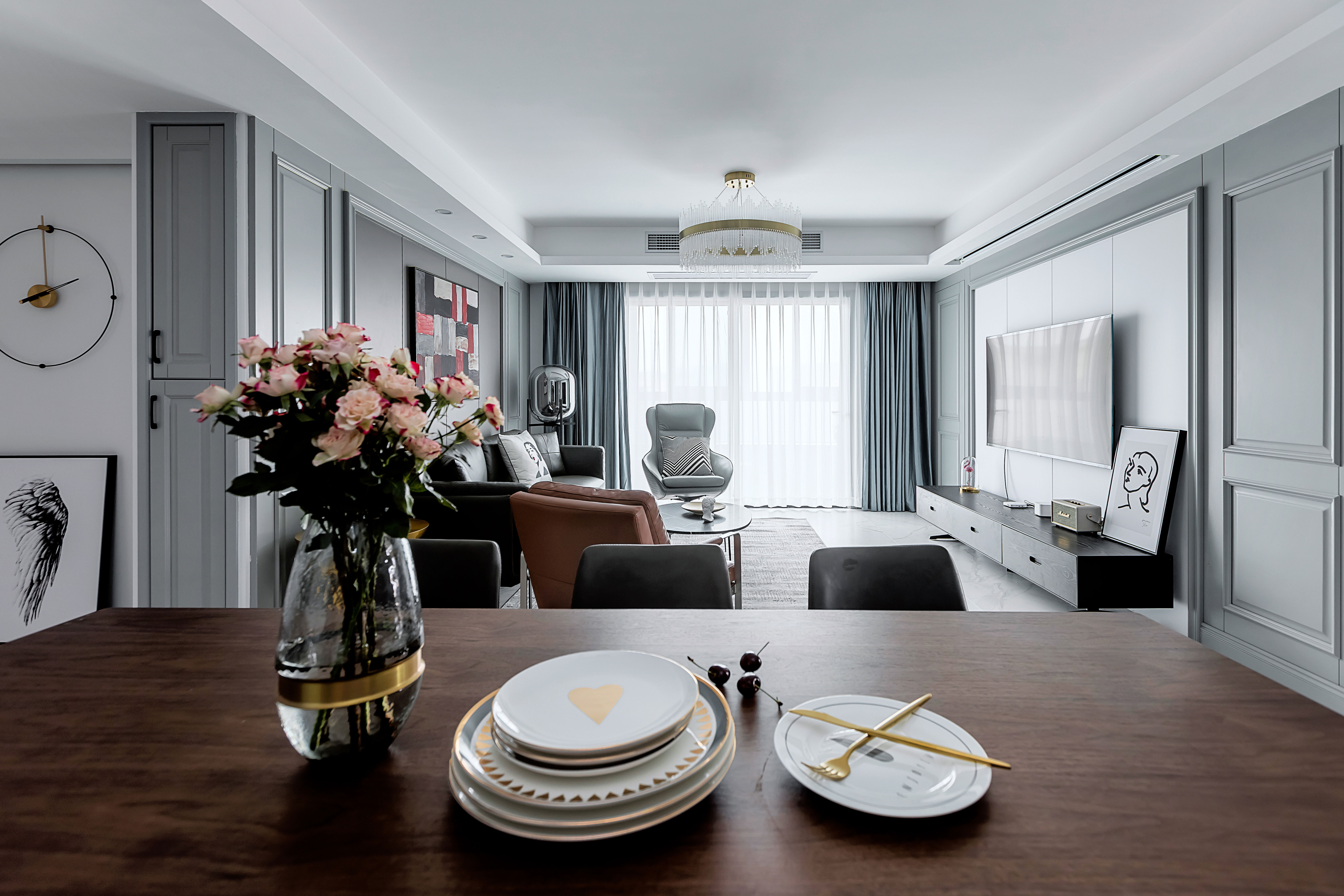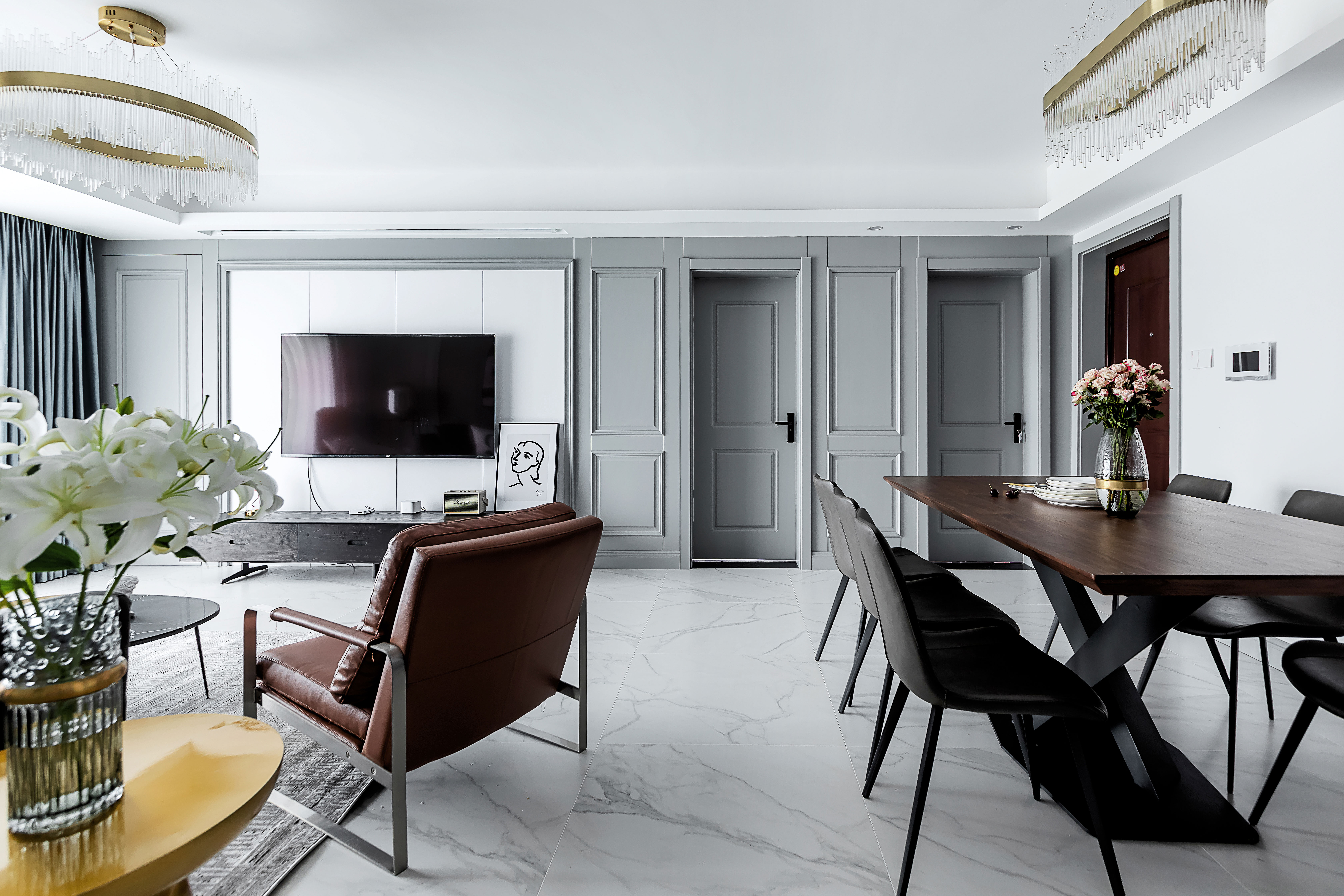电视左侧做了隐形门,跟护墙板同色筒造型。使得电视背景墙更具整体性, 颜色浅灰色作为底色,局部的同色系点缀搭配复古黄铜吊灯, 空间散发静谧与复古的气息。