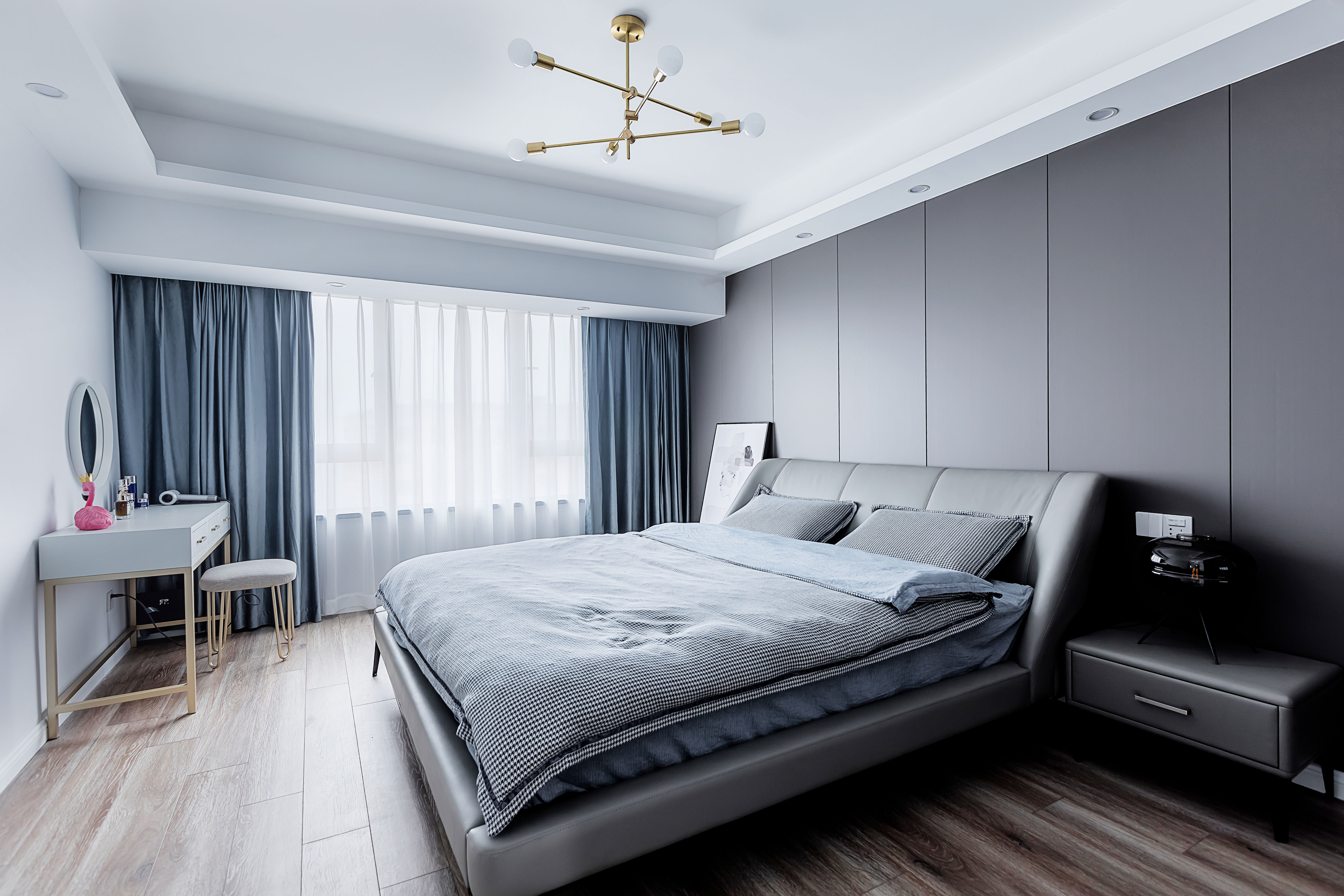 整个主卧的灰色调里,用蓝色窗帘点缀。 深灰色饰面作为床头背景,同色系的撞色,更显空间的质感和档次。