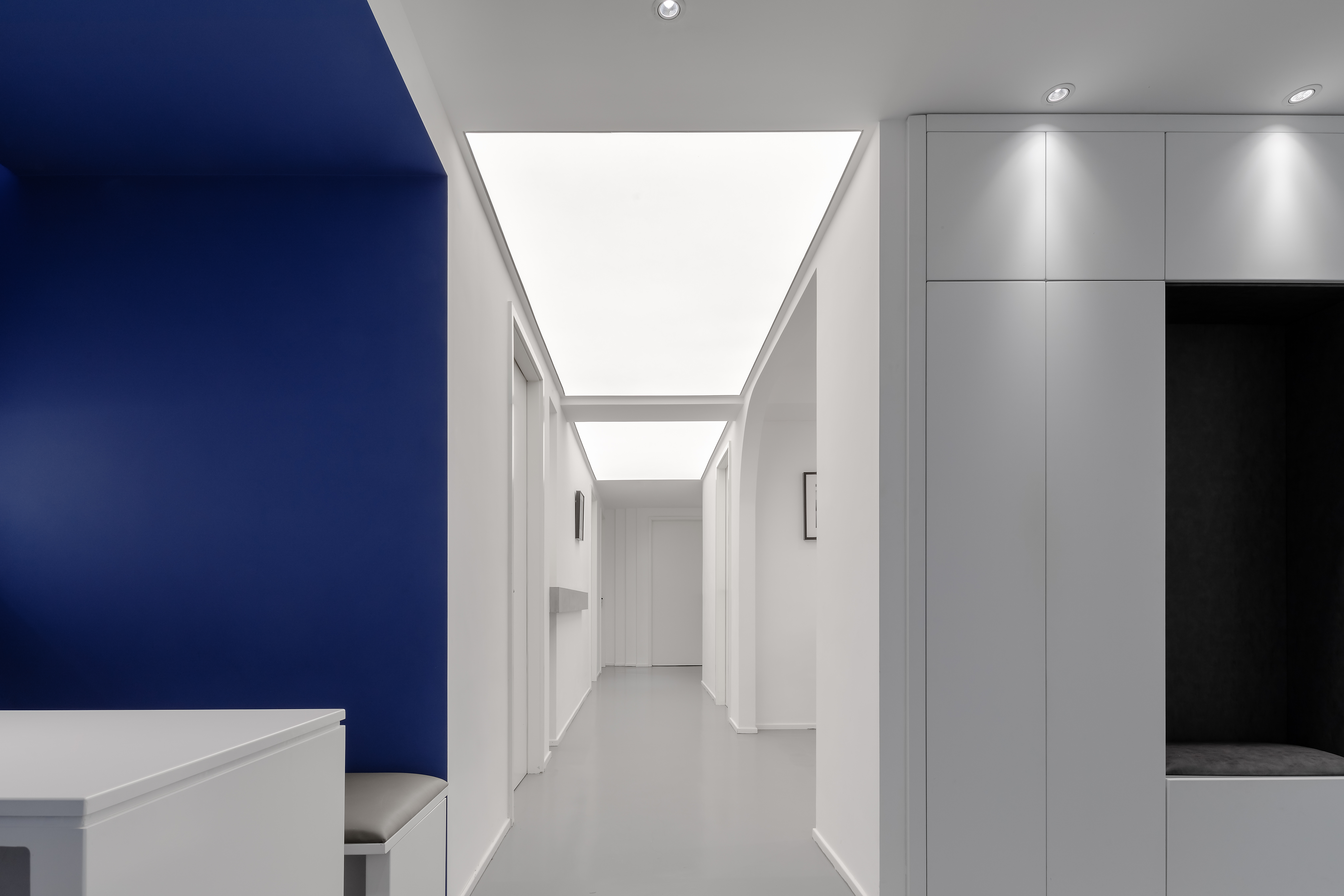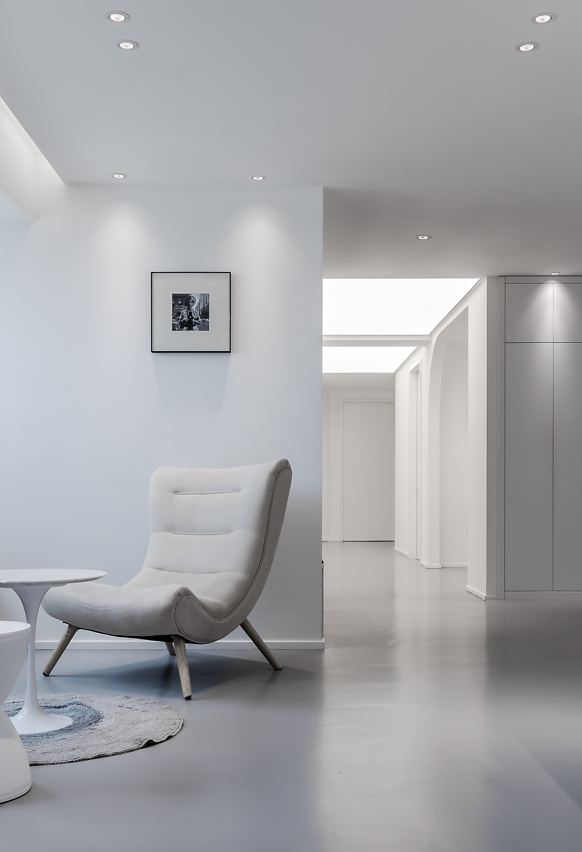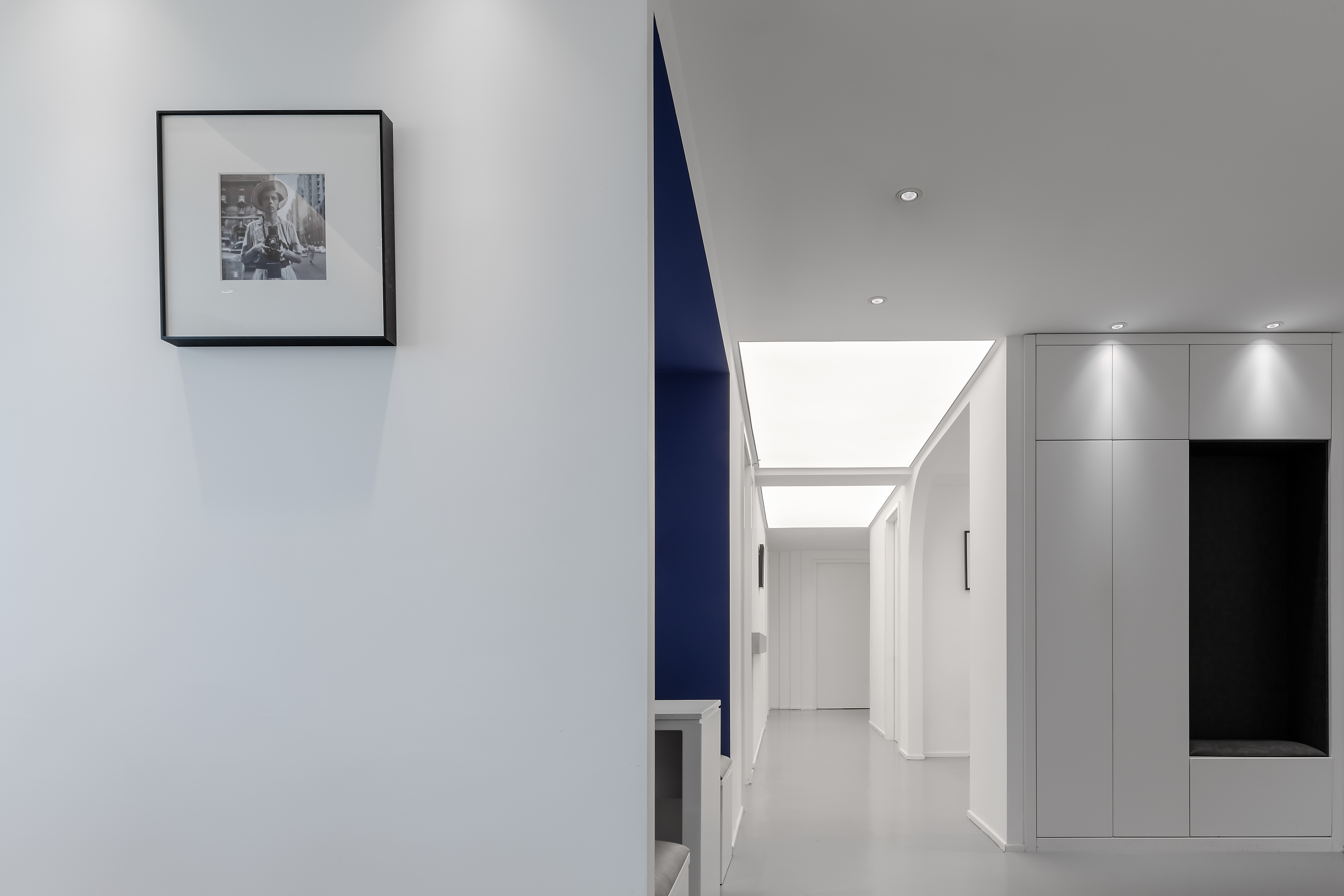 对于过道吊顶与墙面局部的特殊处理, 利用光与光膜,使结构改变, 光的融合度也产生了变化。