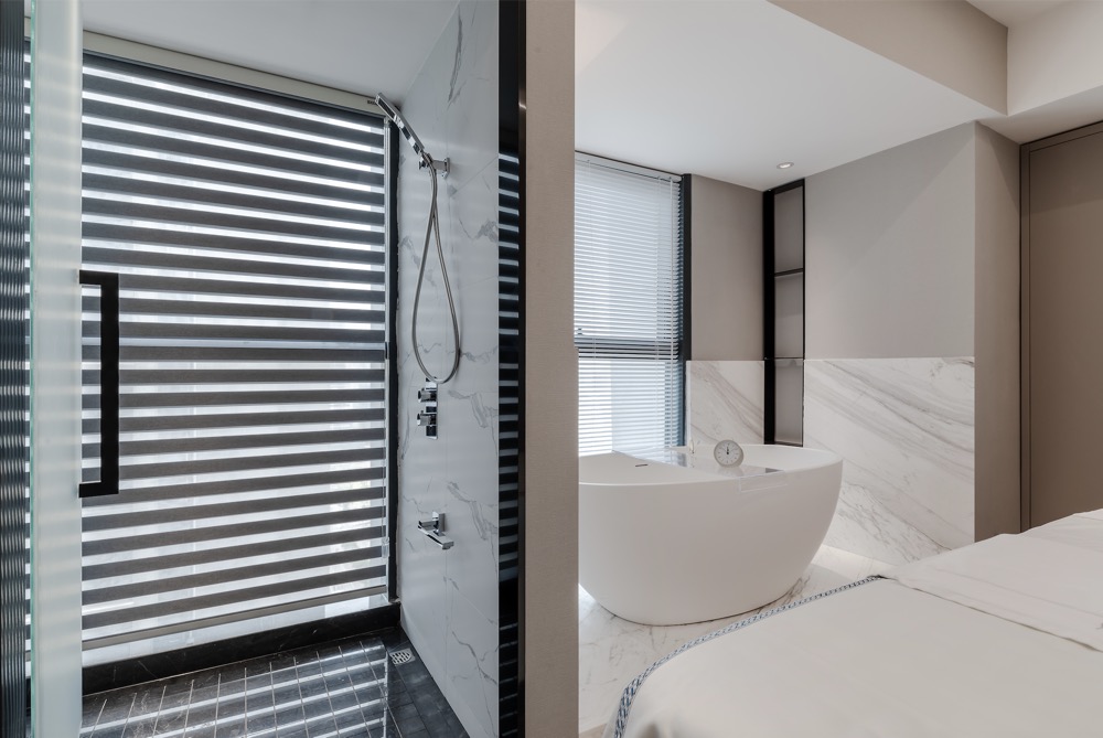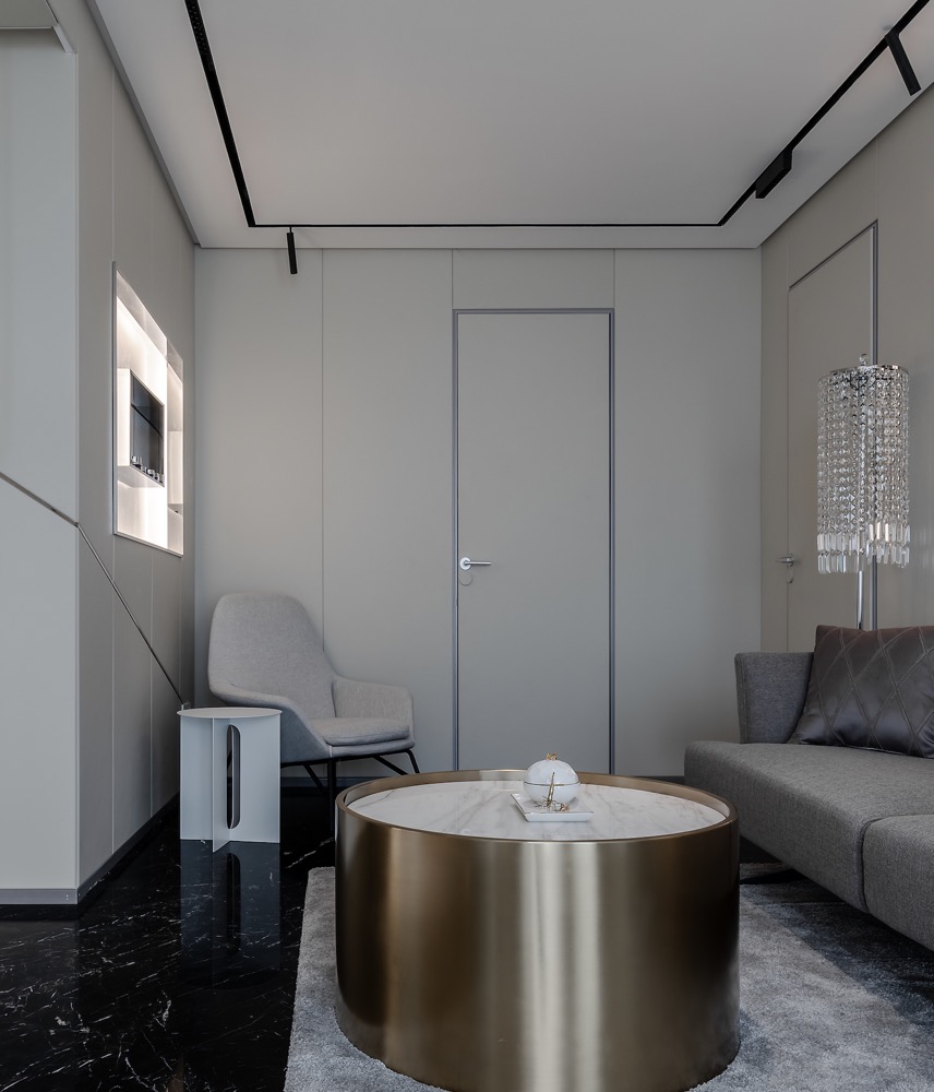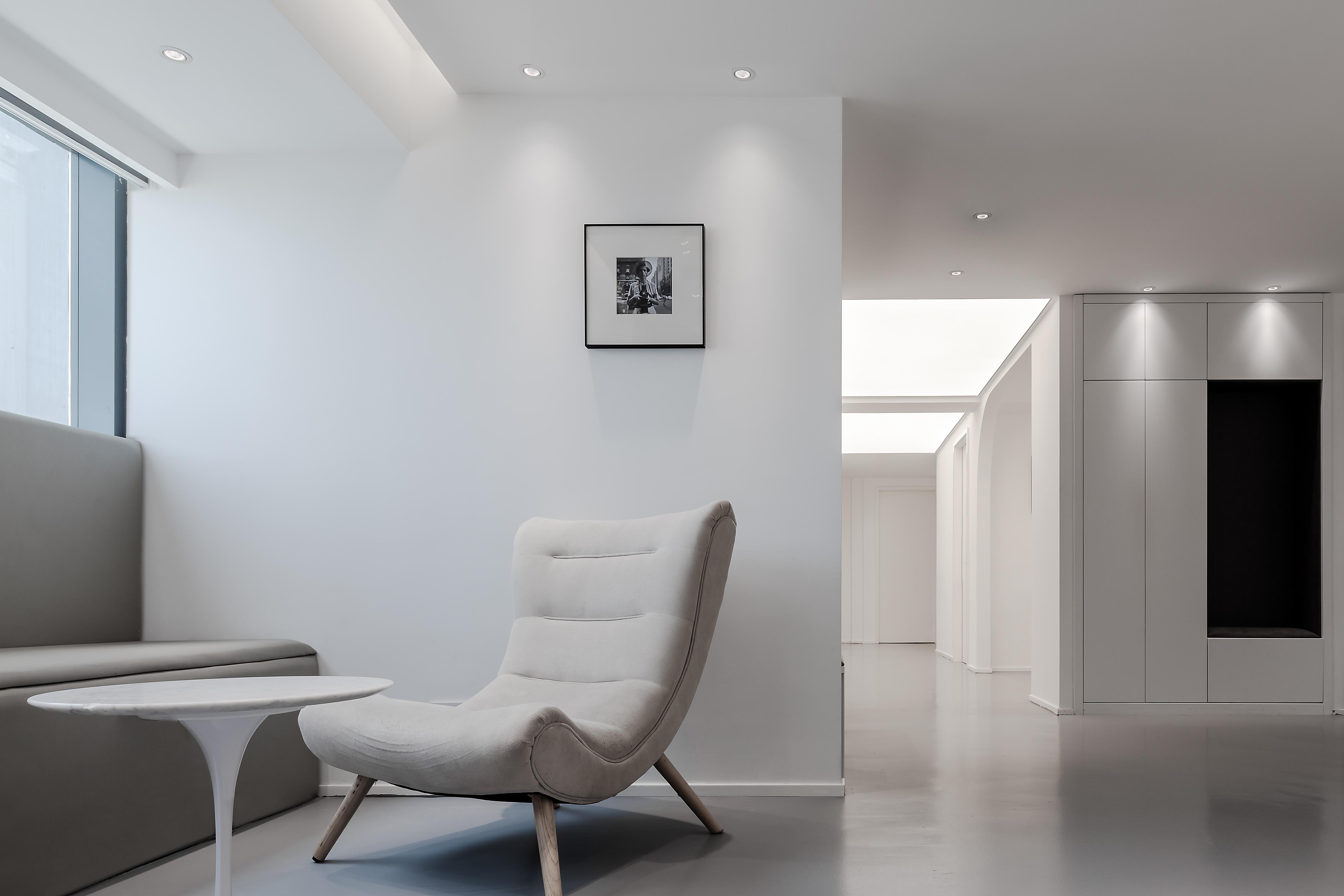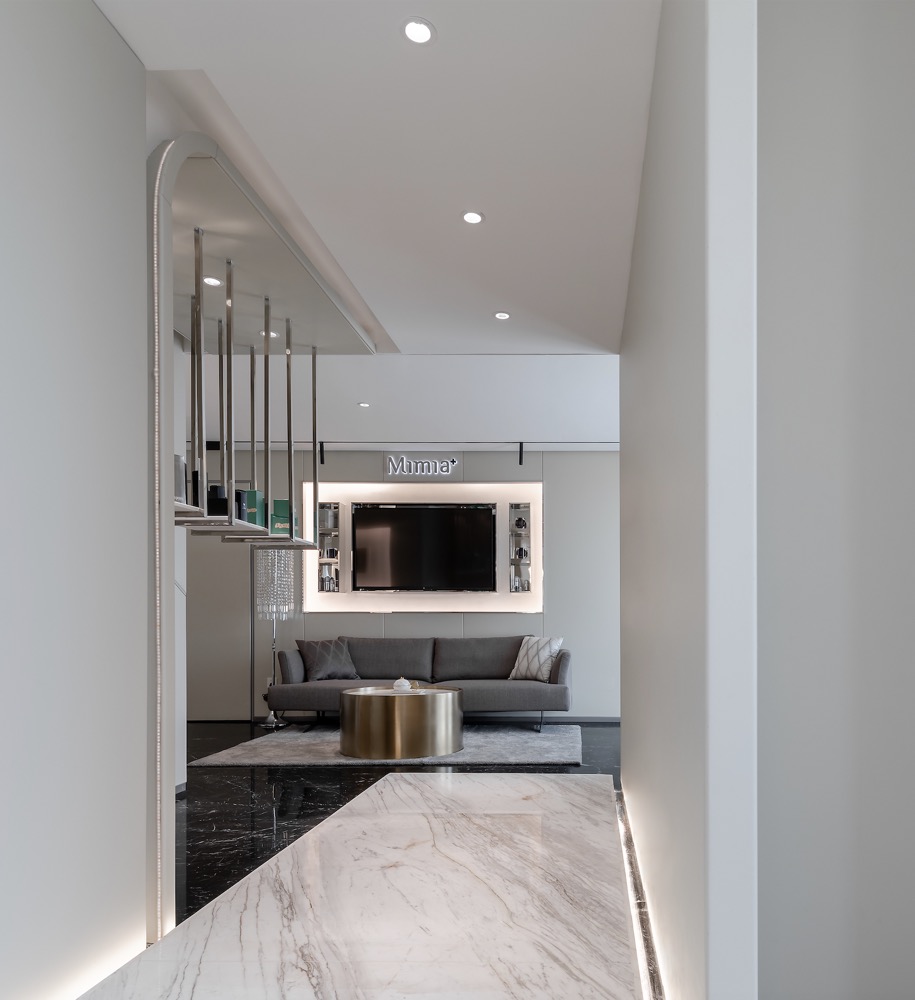 对于过道吊顶与墙面局部的特殊处理, 利用光与光膜,使结构改变, 光的融合度也产生了变化。