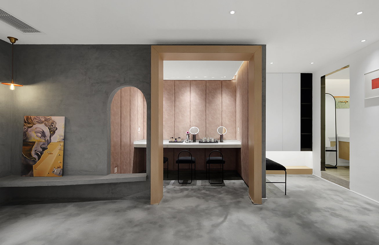 脏粉软包+水泥墙面+弧形挑窗 家庭设计中可作为点缀区域局部使用。