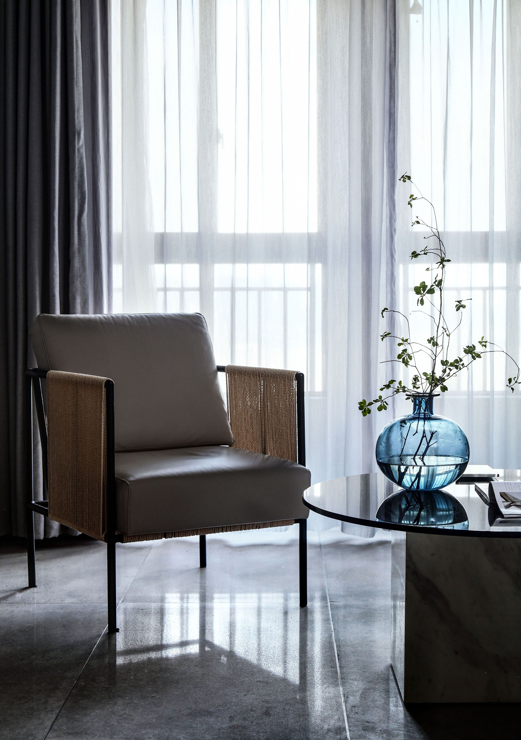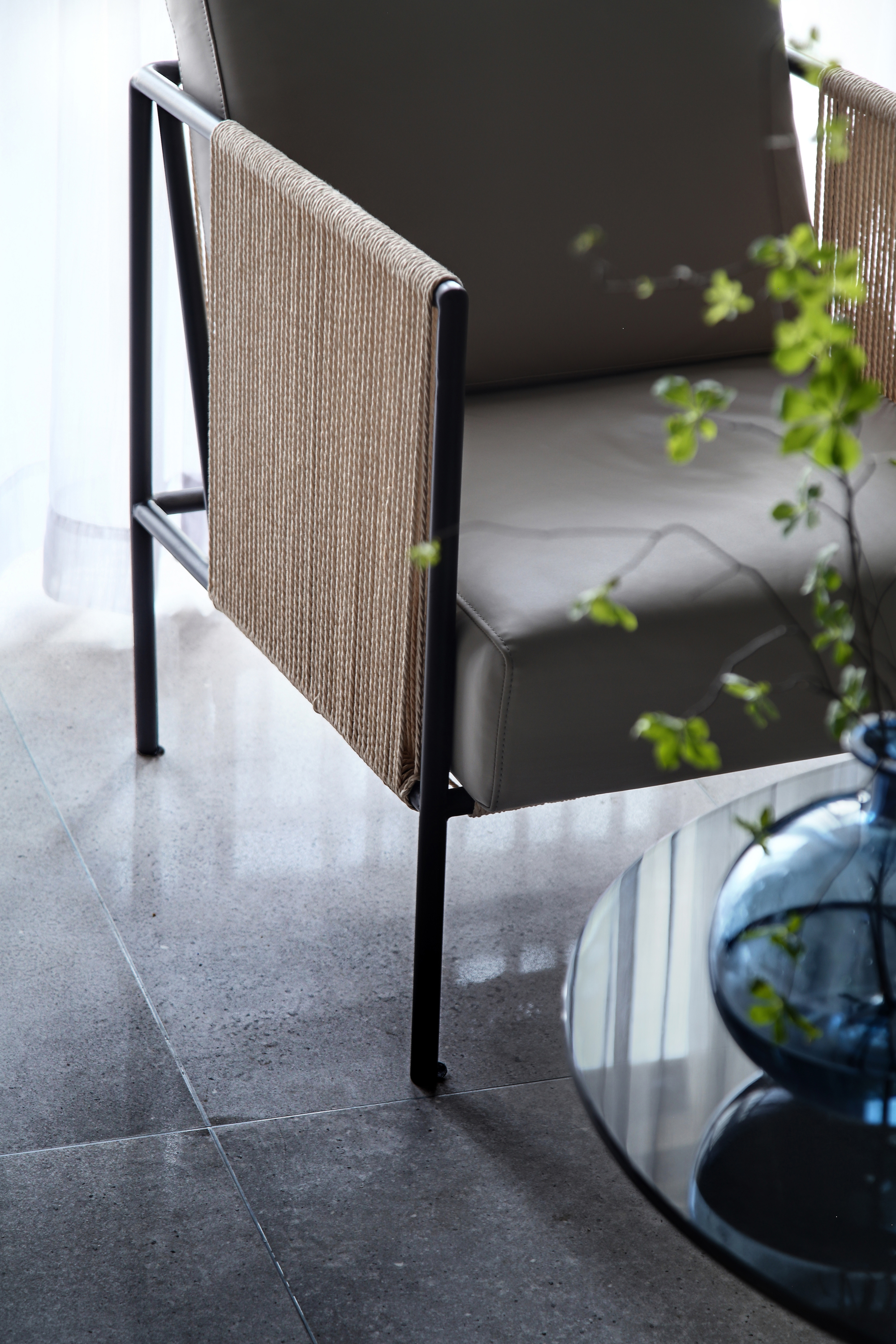 沙发细部,大理石灰玻茶几,真皮沙发,麻绳单椅都是由软装部精心设计定制的。