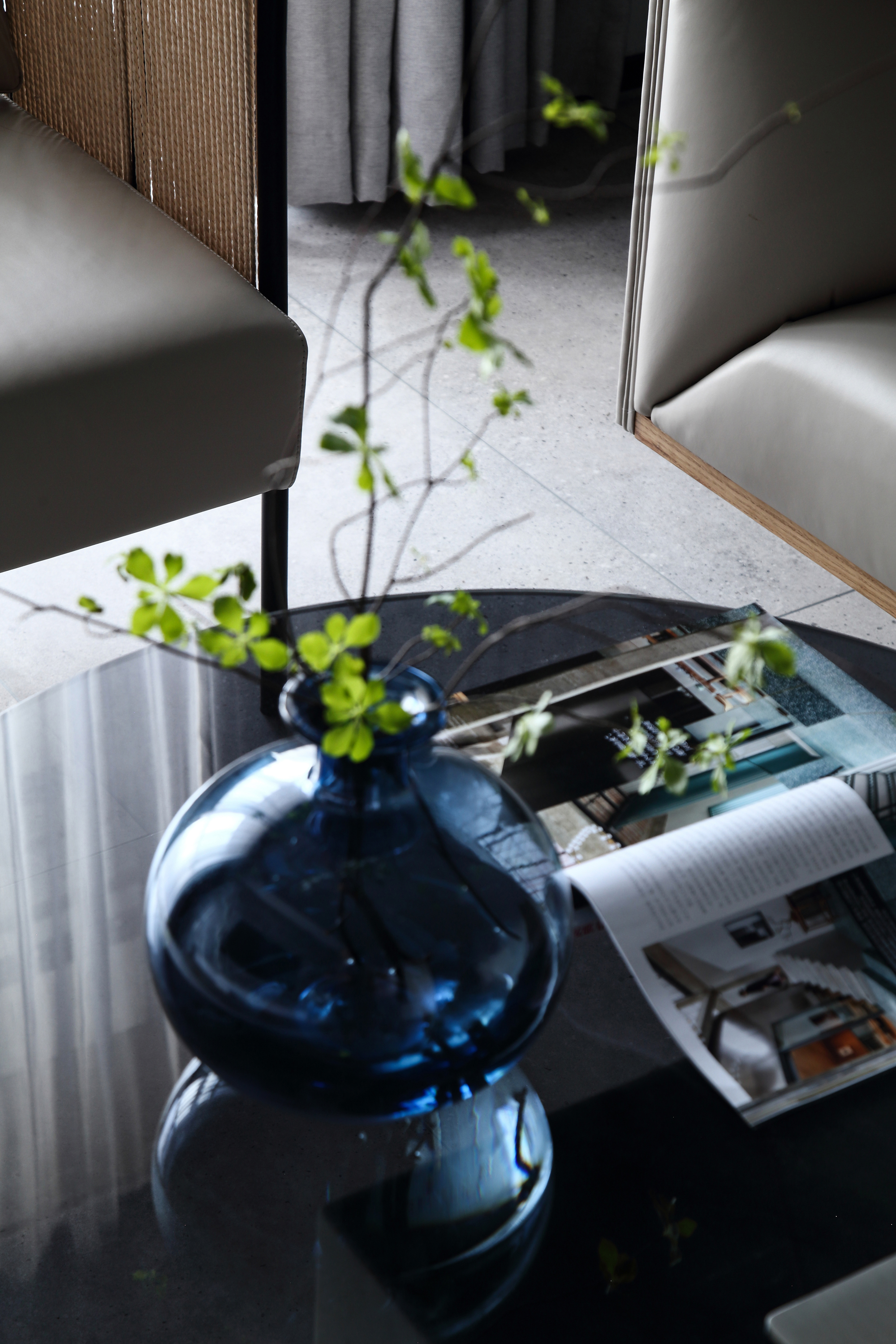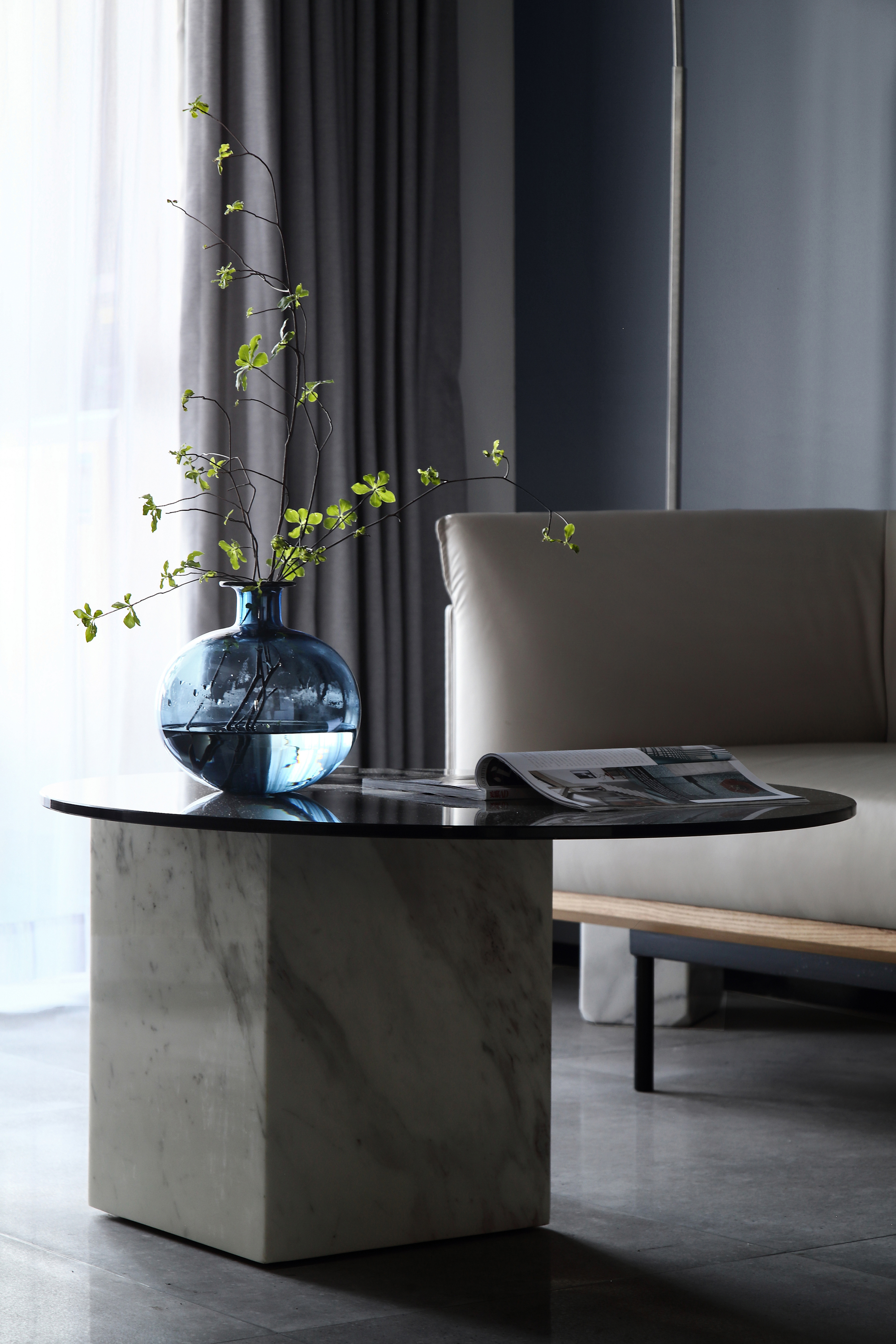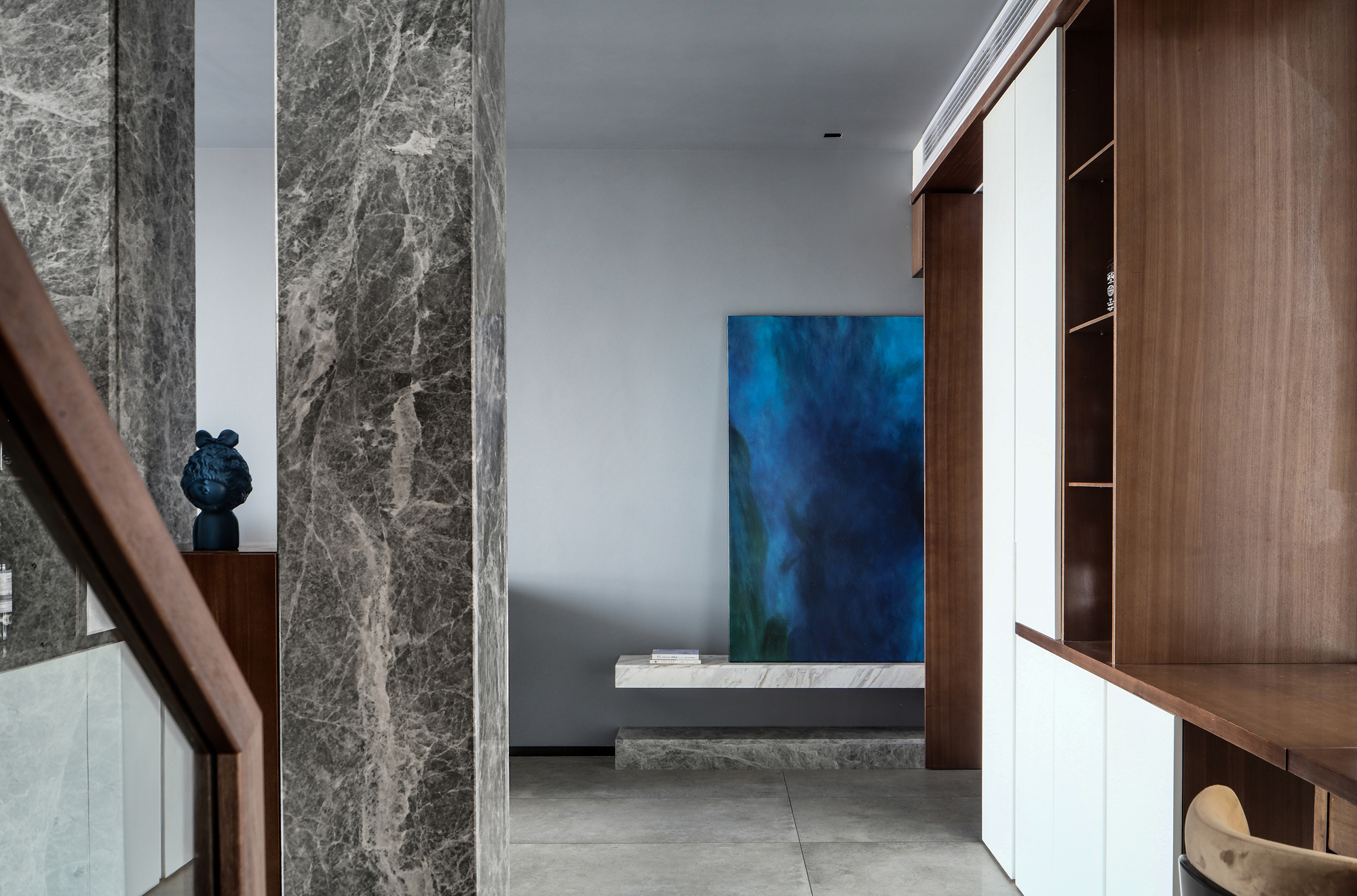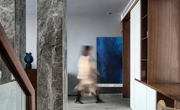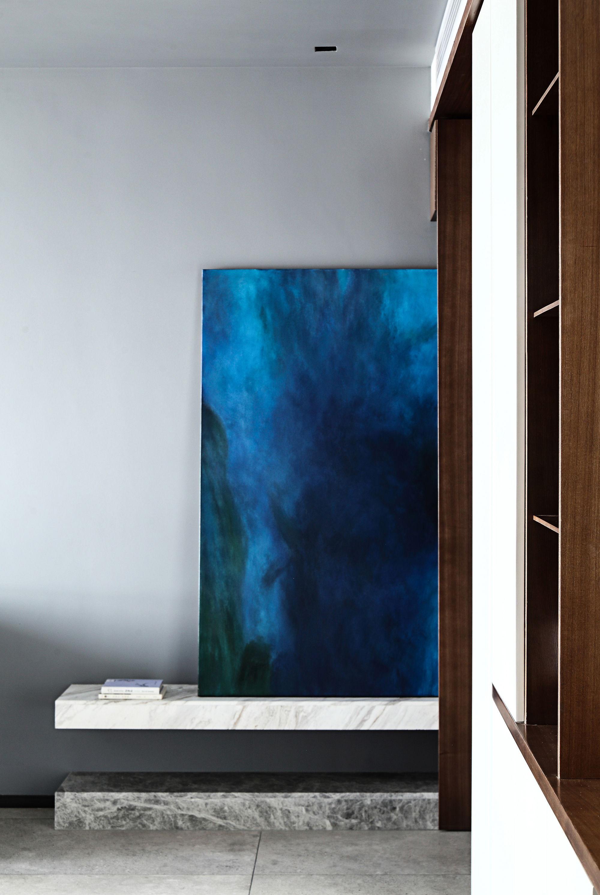 客厅灰色漆由墙面延申到顶面,整个空间以灰色调作为基础。一宽一窄,一灰一白两条大理石台面贯穿鞋柜内部延申至客厅,台面上半隐半现的蓝色装饰画与蓝色玻璃花瓶。