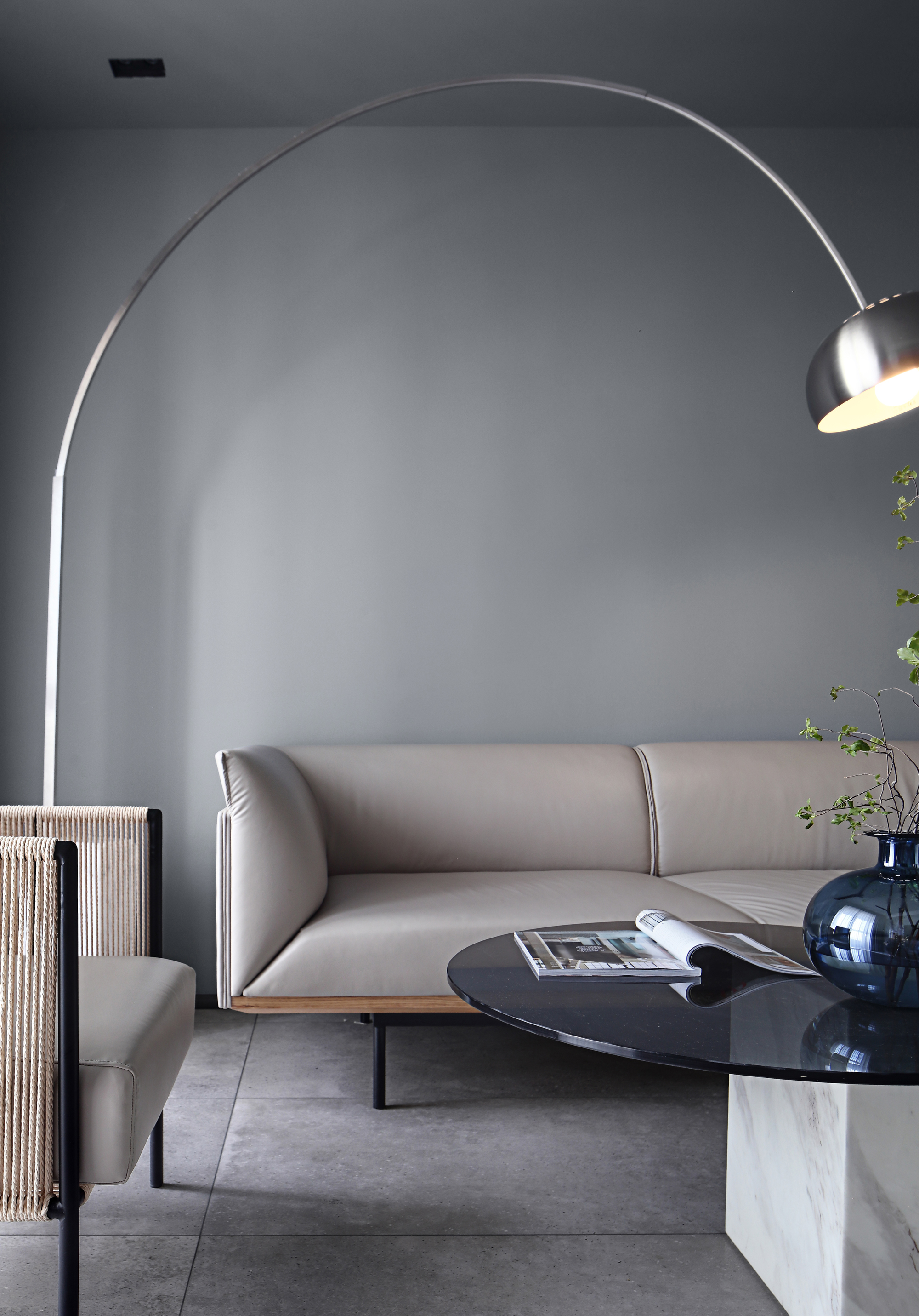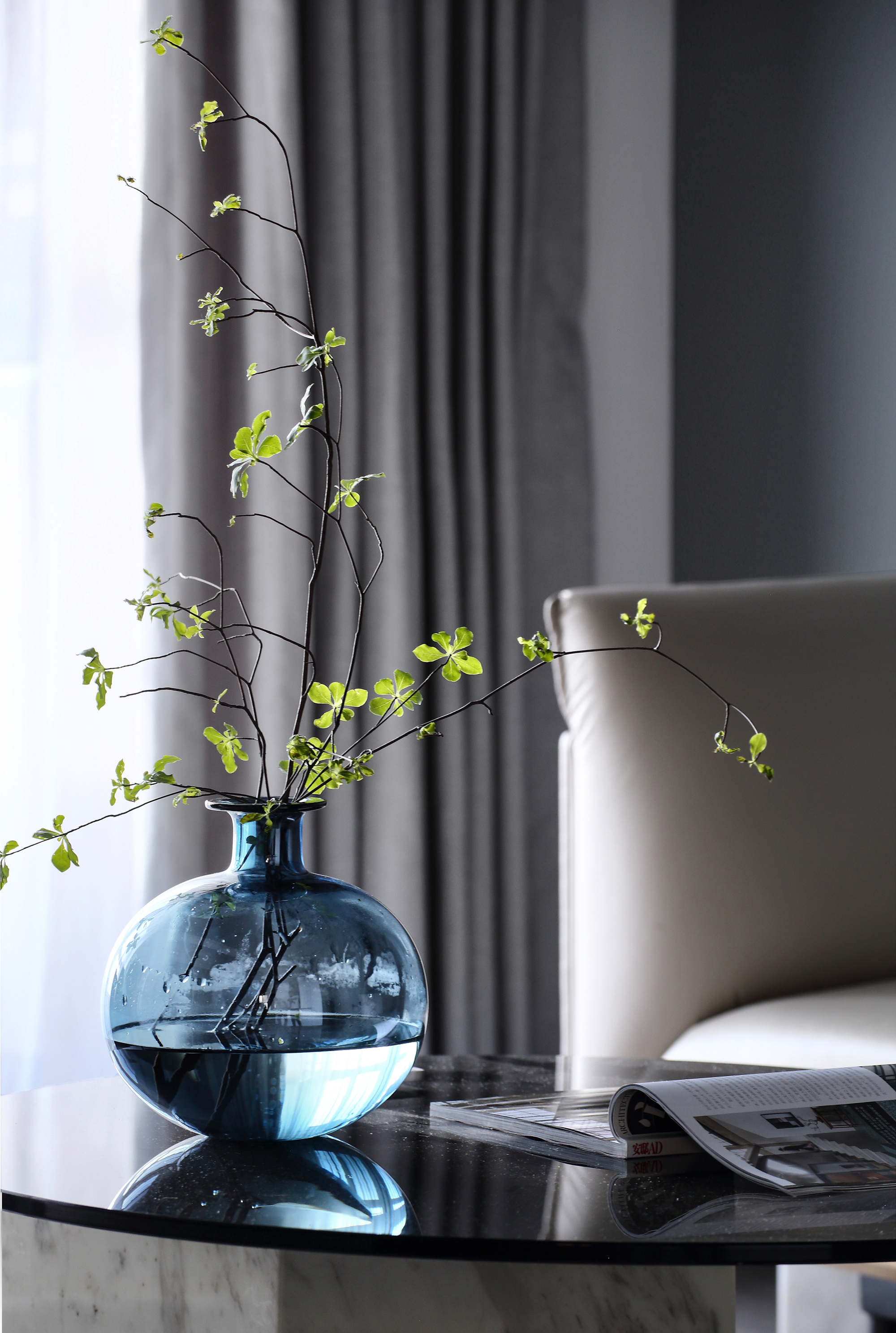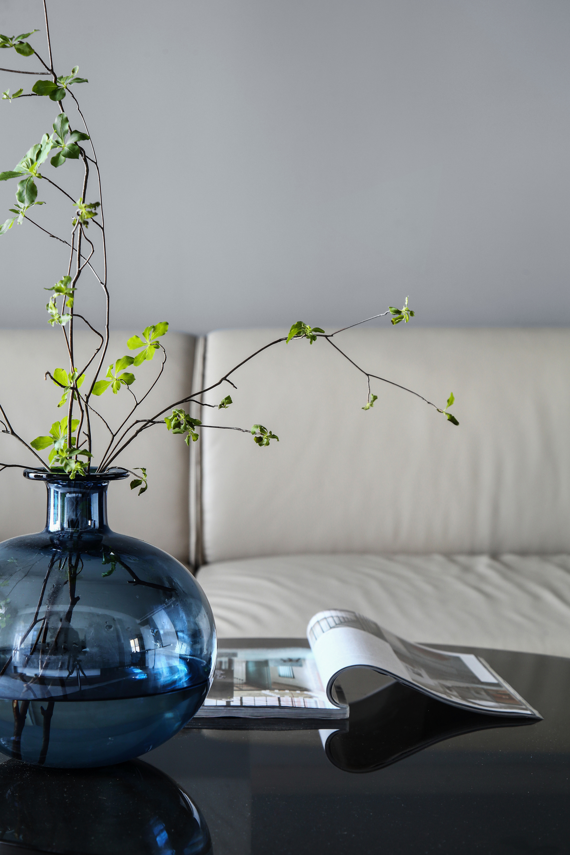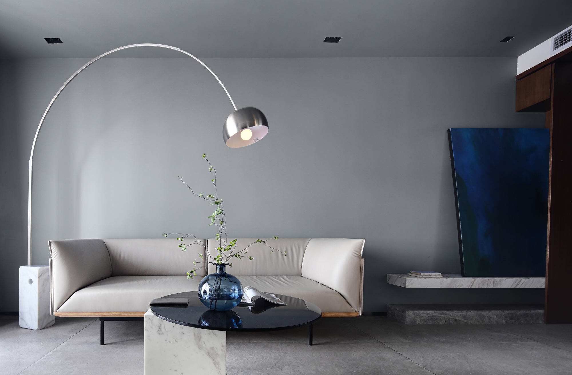客厅灰色漆由墙面延申到顶面,整个空间以灰色调作为基础。一宽一窄,一灰一白两条大理石台面贯穿鞋柜内部延申至客厅,台面上半隐半现的蓝色装饰画与蓝色玻璃花瓶。