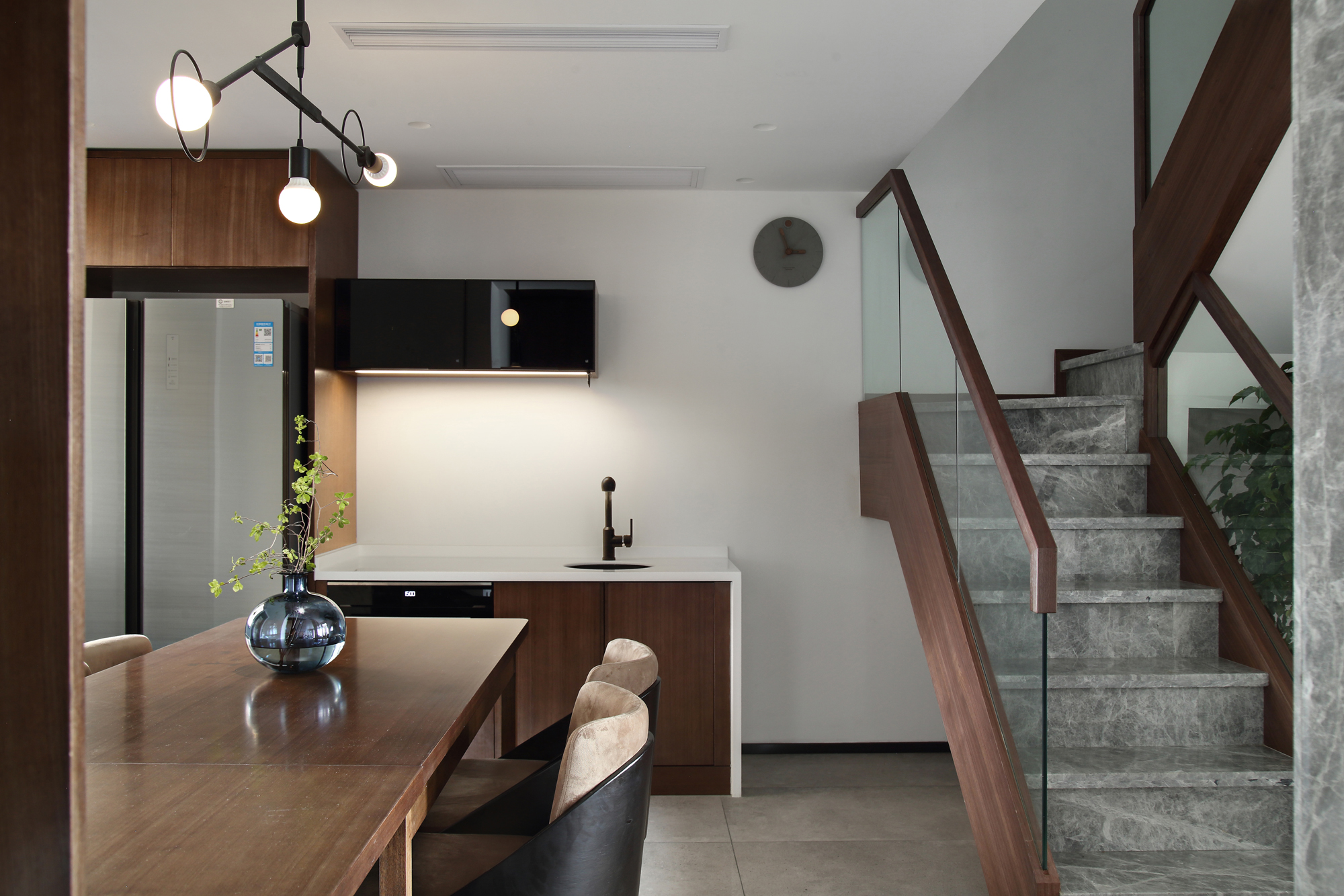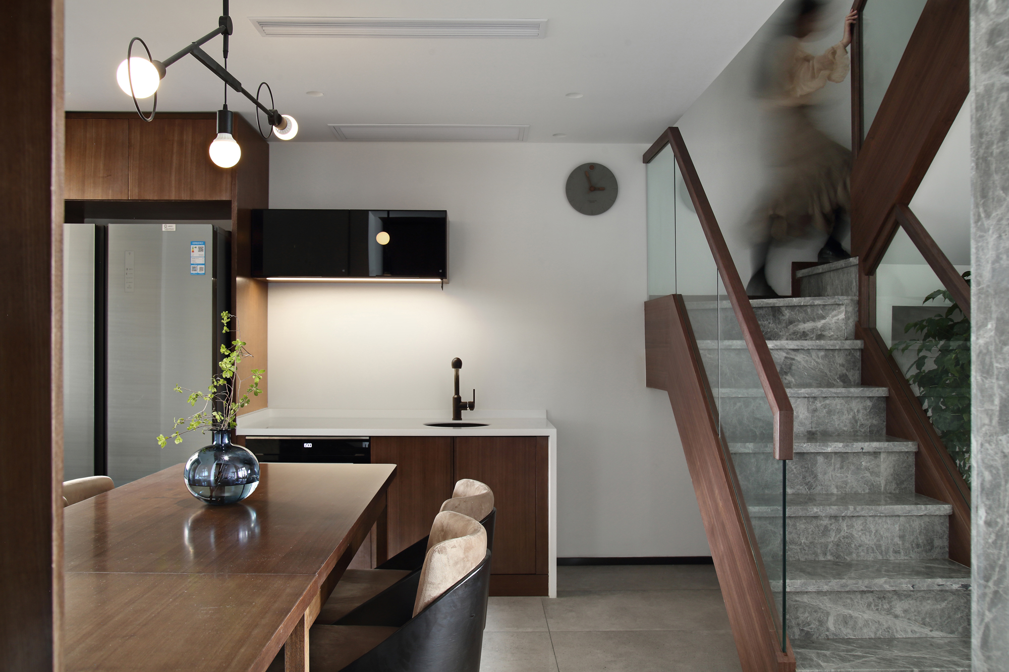 透过楼梯看向餐厅,调整过后的厨房门内嵌长虹玻璃。