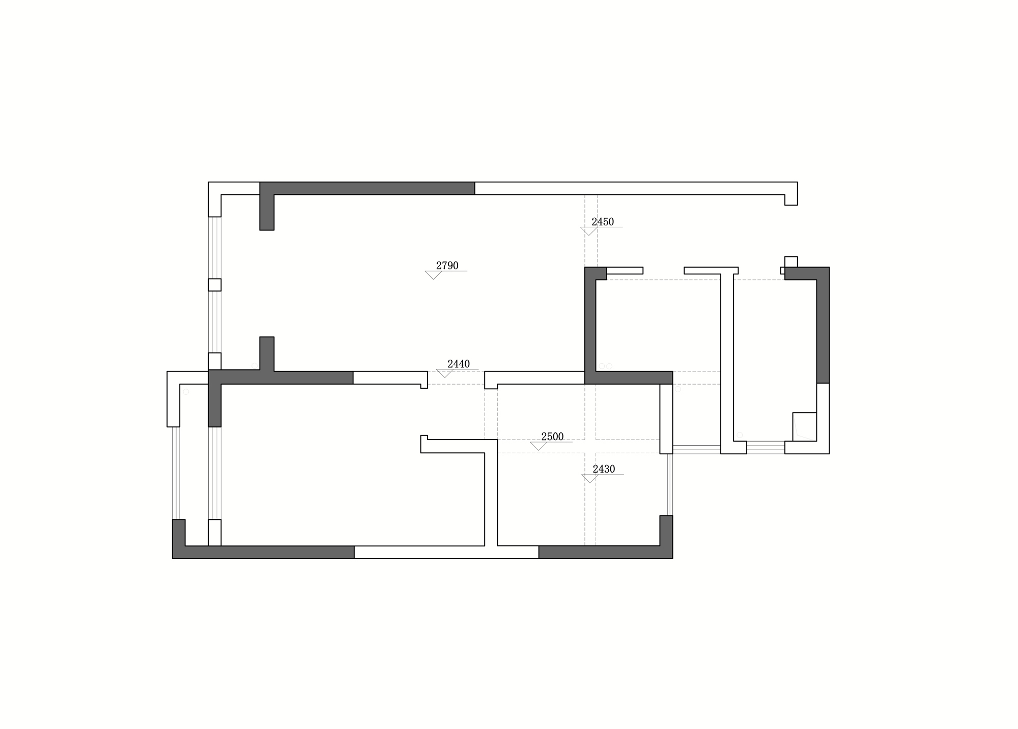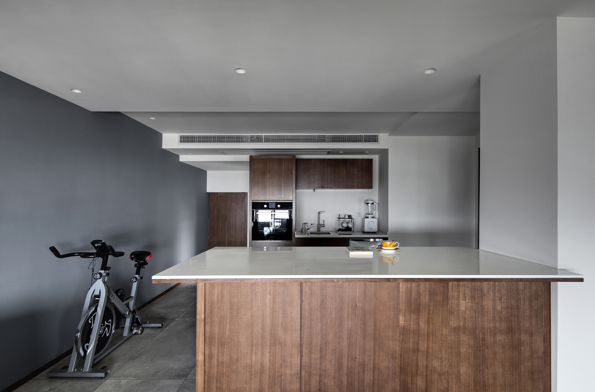 本案是江边上的一套顶楼的江景房,原本单层的户型加建改成了三层。原户型是两室两厅一厨一卫,通过改造,一层保留了一间卧室给父母住,另外加出了楼梯空间。原餐厅位置改成了酒柜,酒柜延申至厨房(原次卧室的位置),餐厅靠近楼梯,冰箱也从厨房改到了与餐厅相邻的西厨操作台旁。原厨房门开在玄关位置距离餐厅较远,我们更改了厨房的格局,将卫生间的一部分空间让给了厨房,扩大了厨房的同时,也给了厨房面对餐厅开门的可能性。卫生间与厨房之间用电动雾化玻璃作为分隔,既保留了卫生间的采光,又保证了私密性。