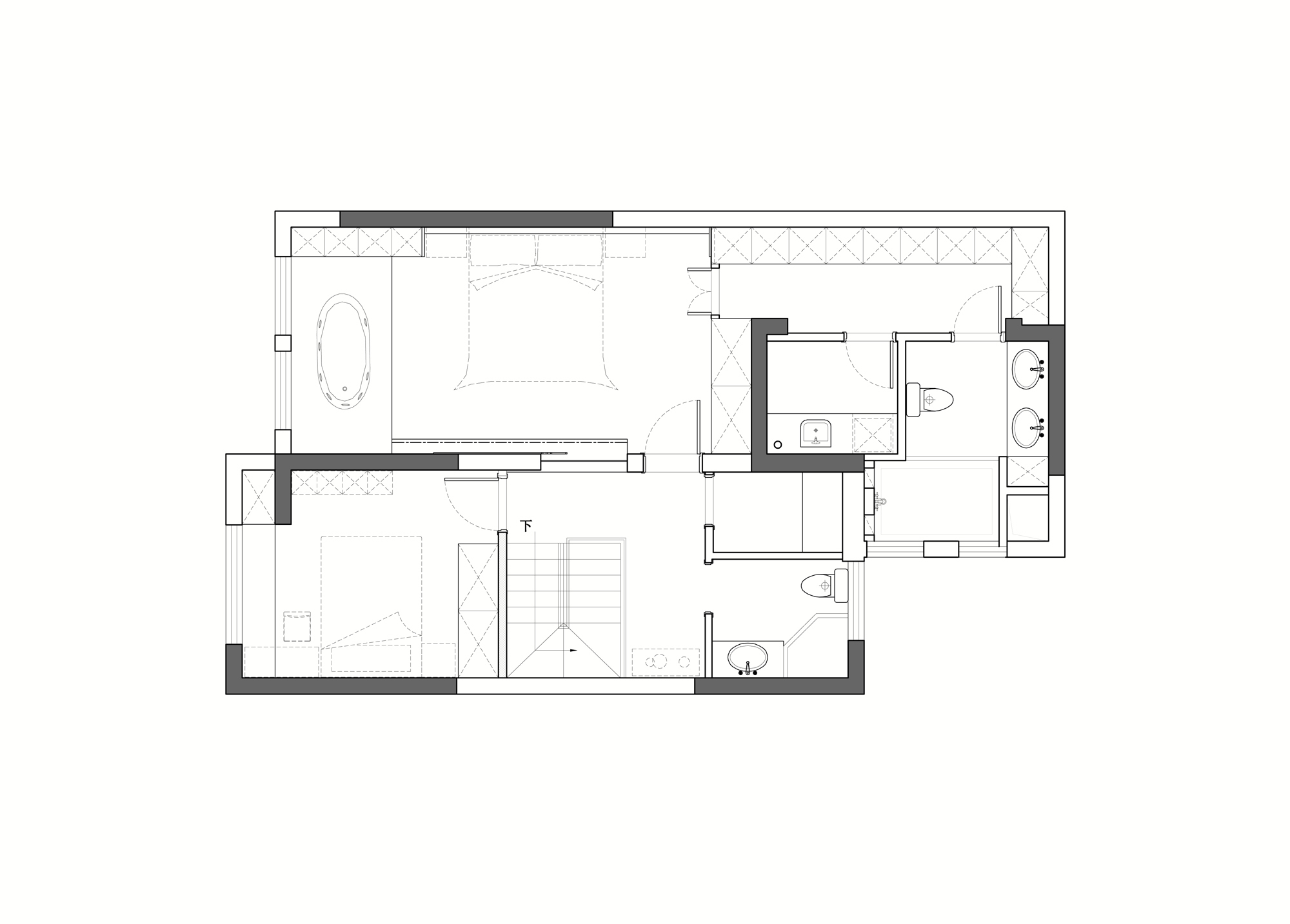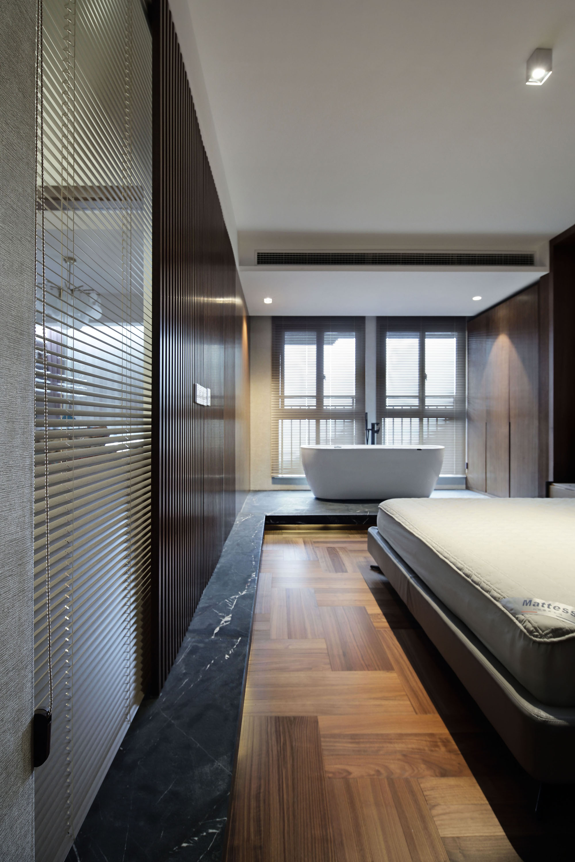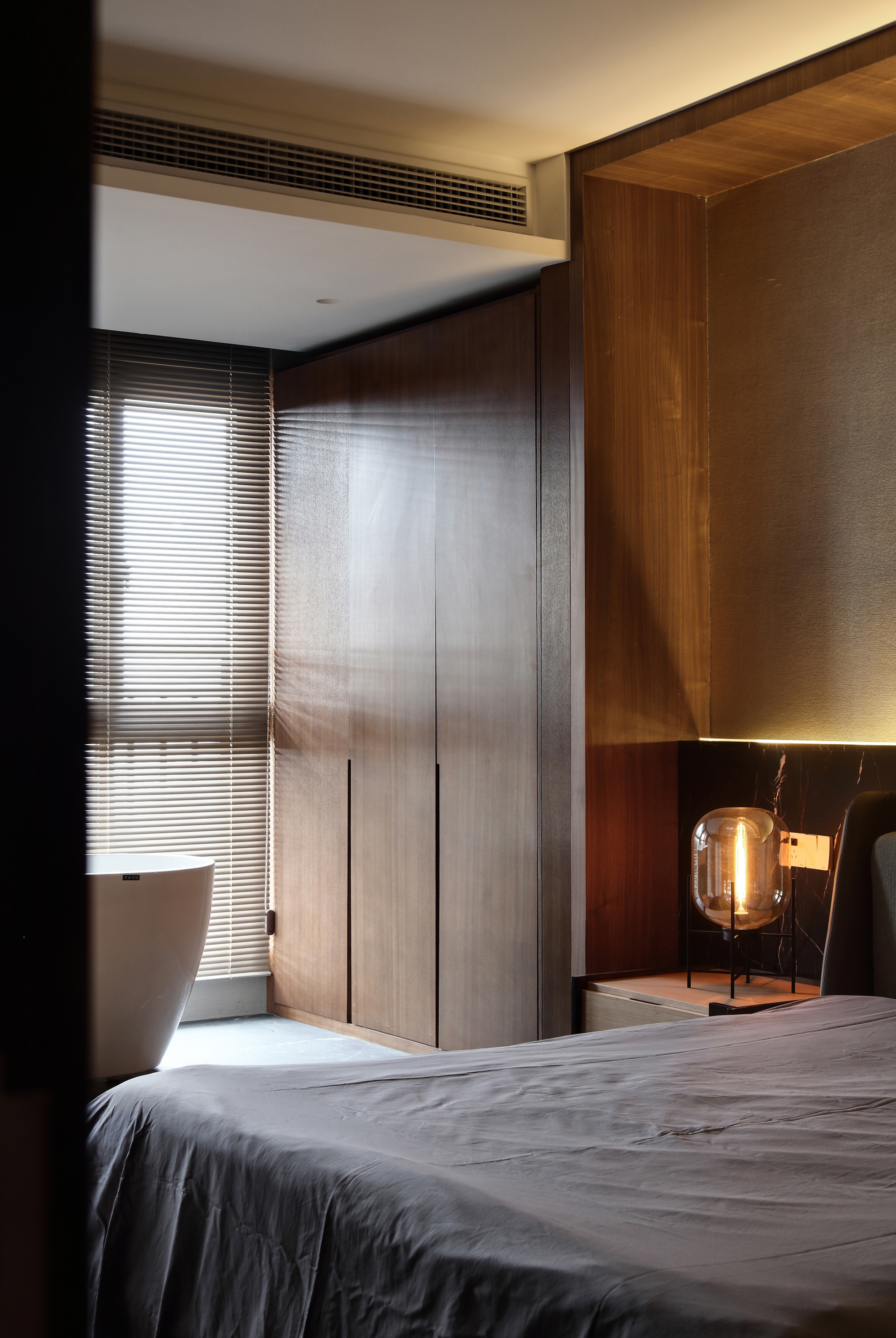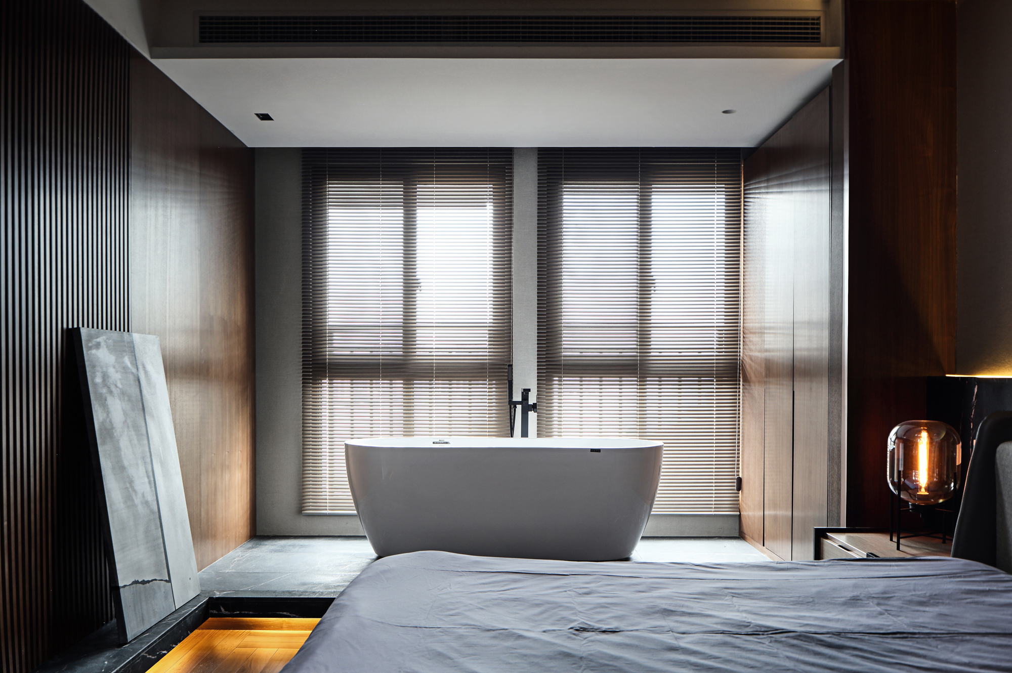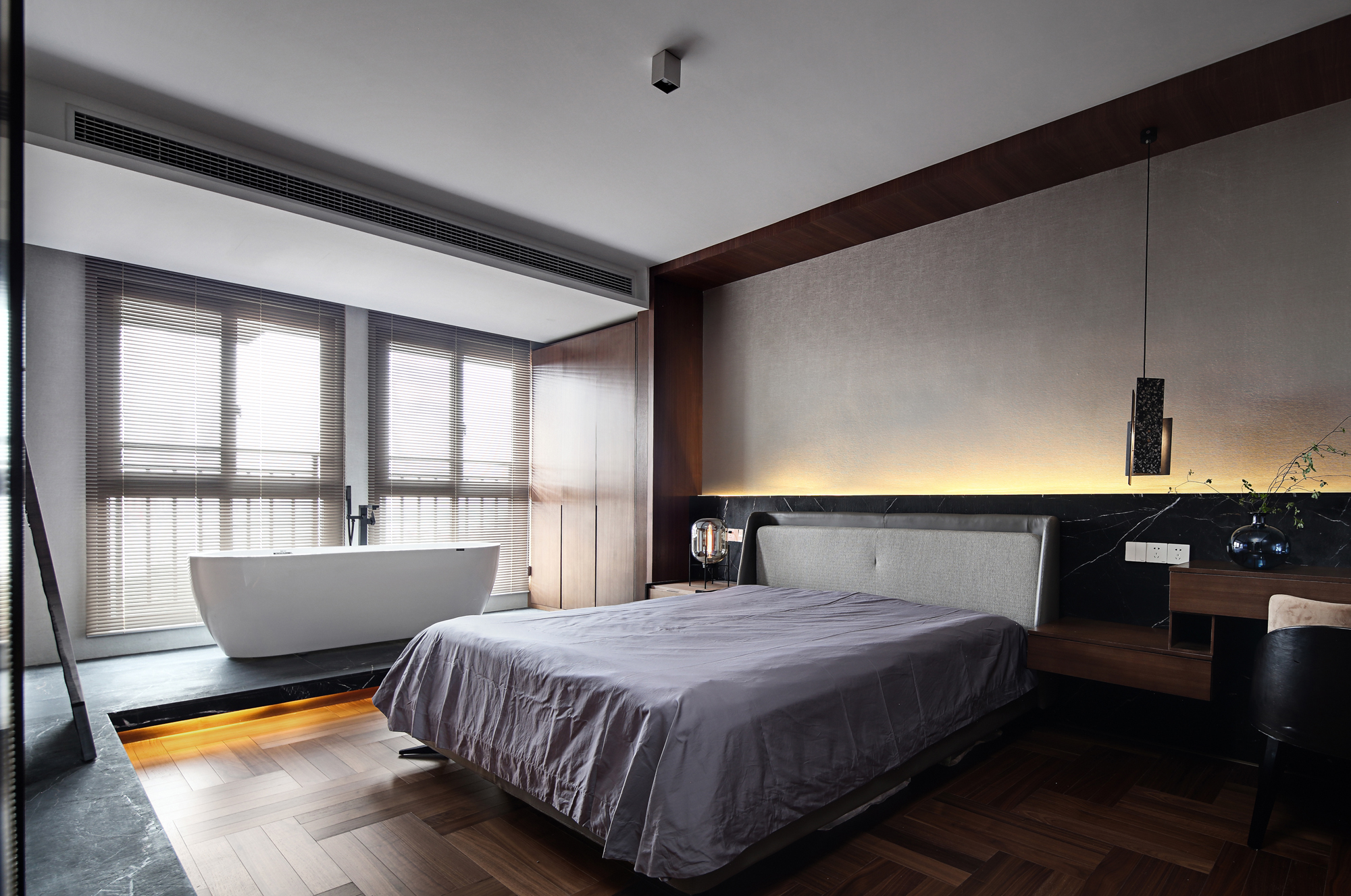 二楼主卧,浴缸黑色水洗面大理石地台延申至电视墙处,代替了传统电视柜,地台下一条光带丰富了灯光层次,立体了空间。