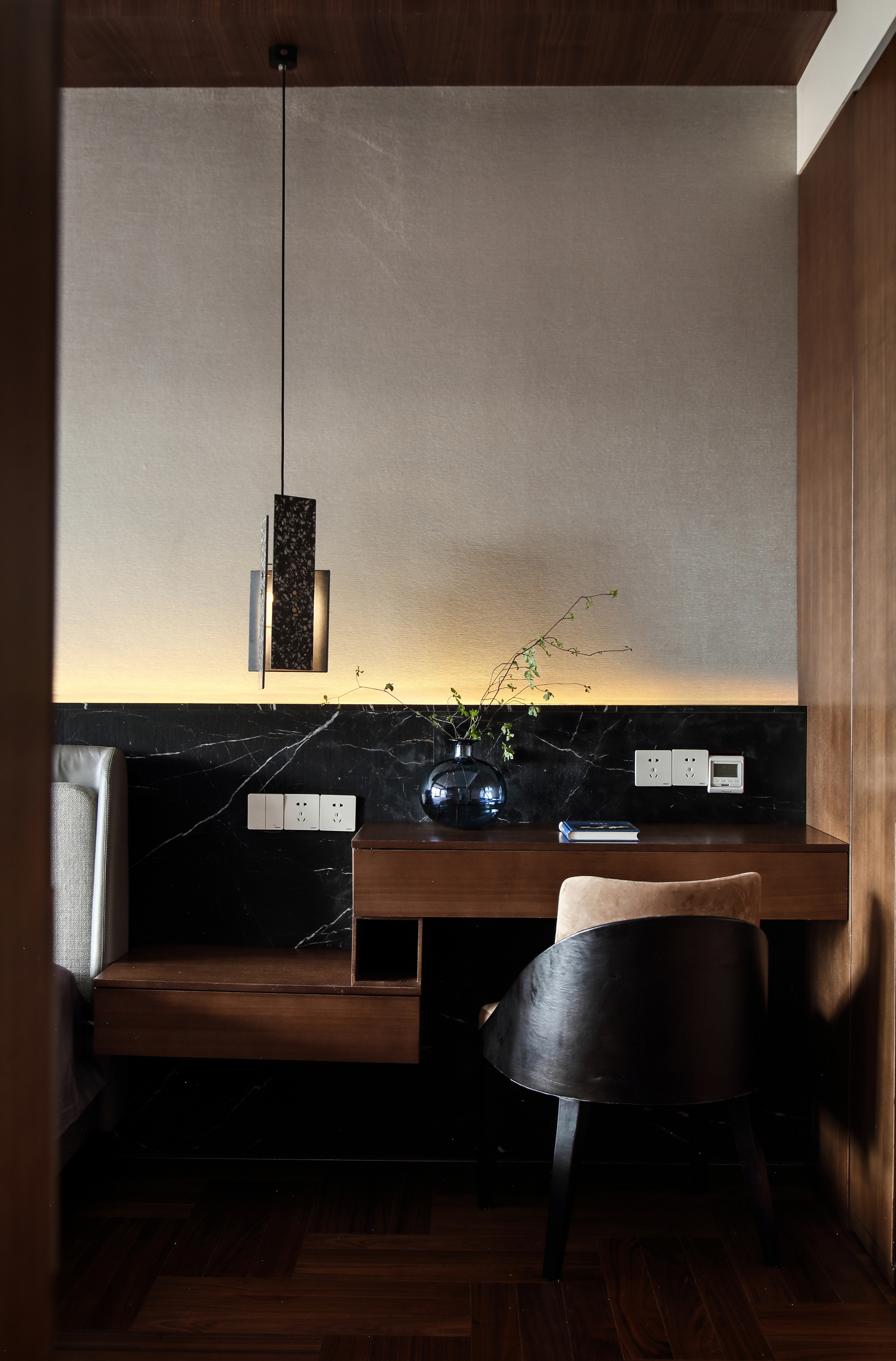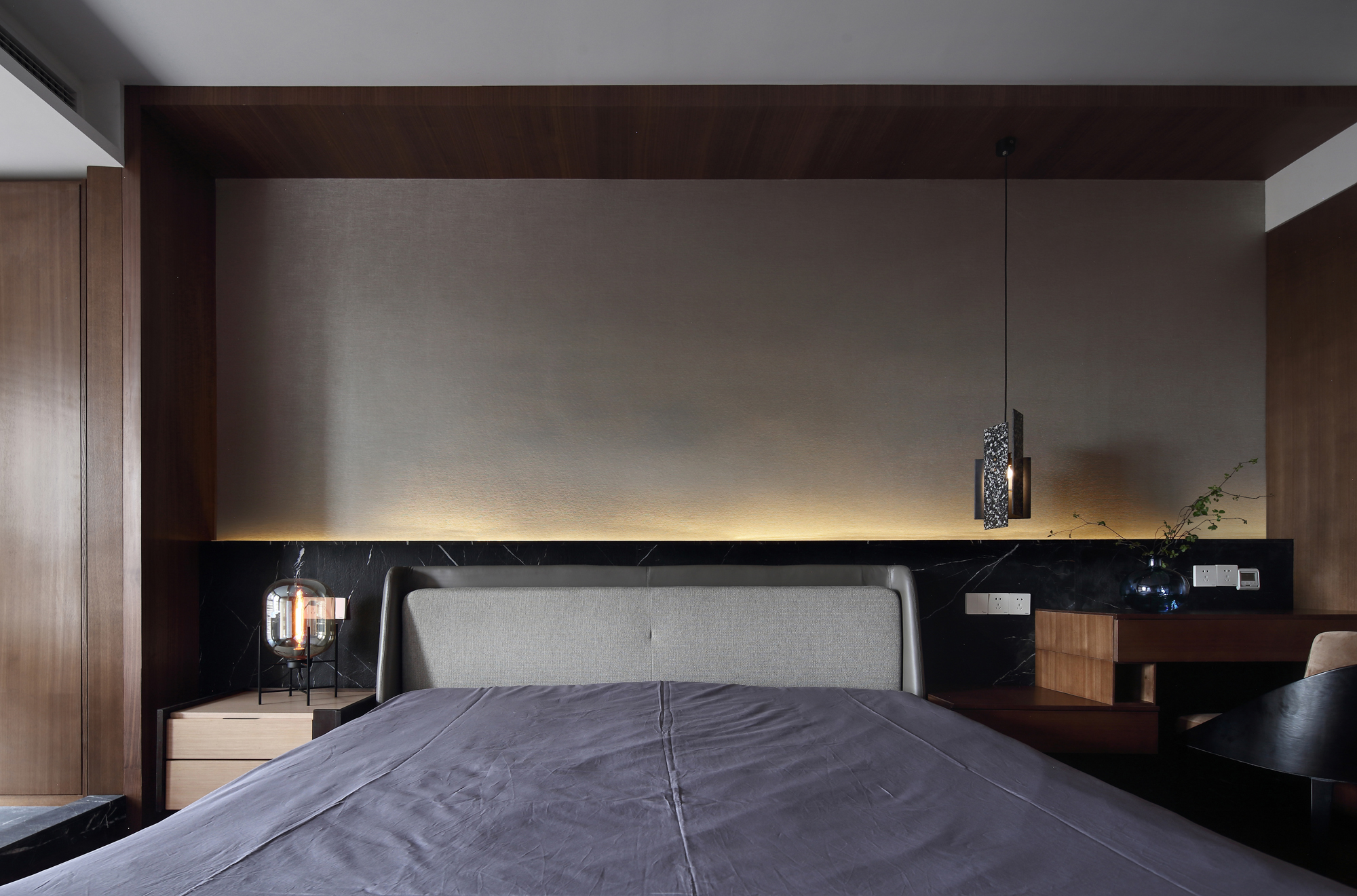黑色水洗面大理石床头背景,暗藏一条光带。床头右侧的吊灯与左侧的台灯一高一低,趣味十足。右侧床头柜结合梳妆台的高低转角设计,实用与趣味性相结合。