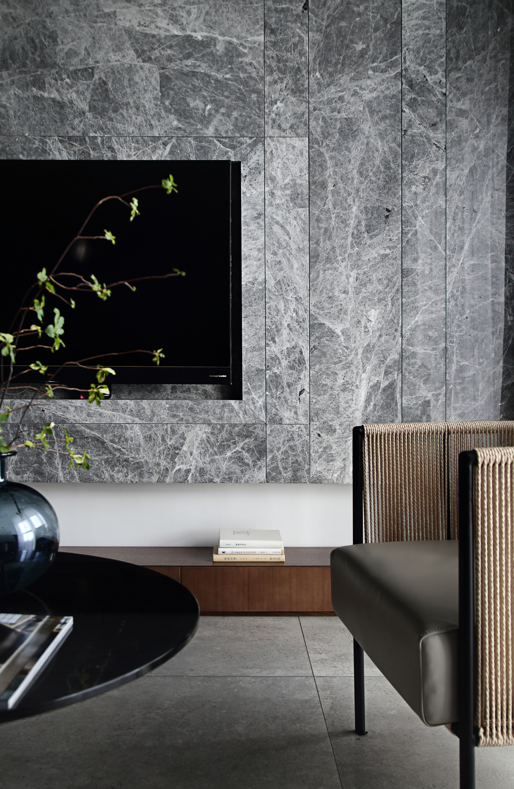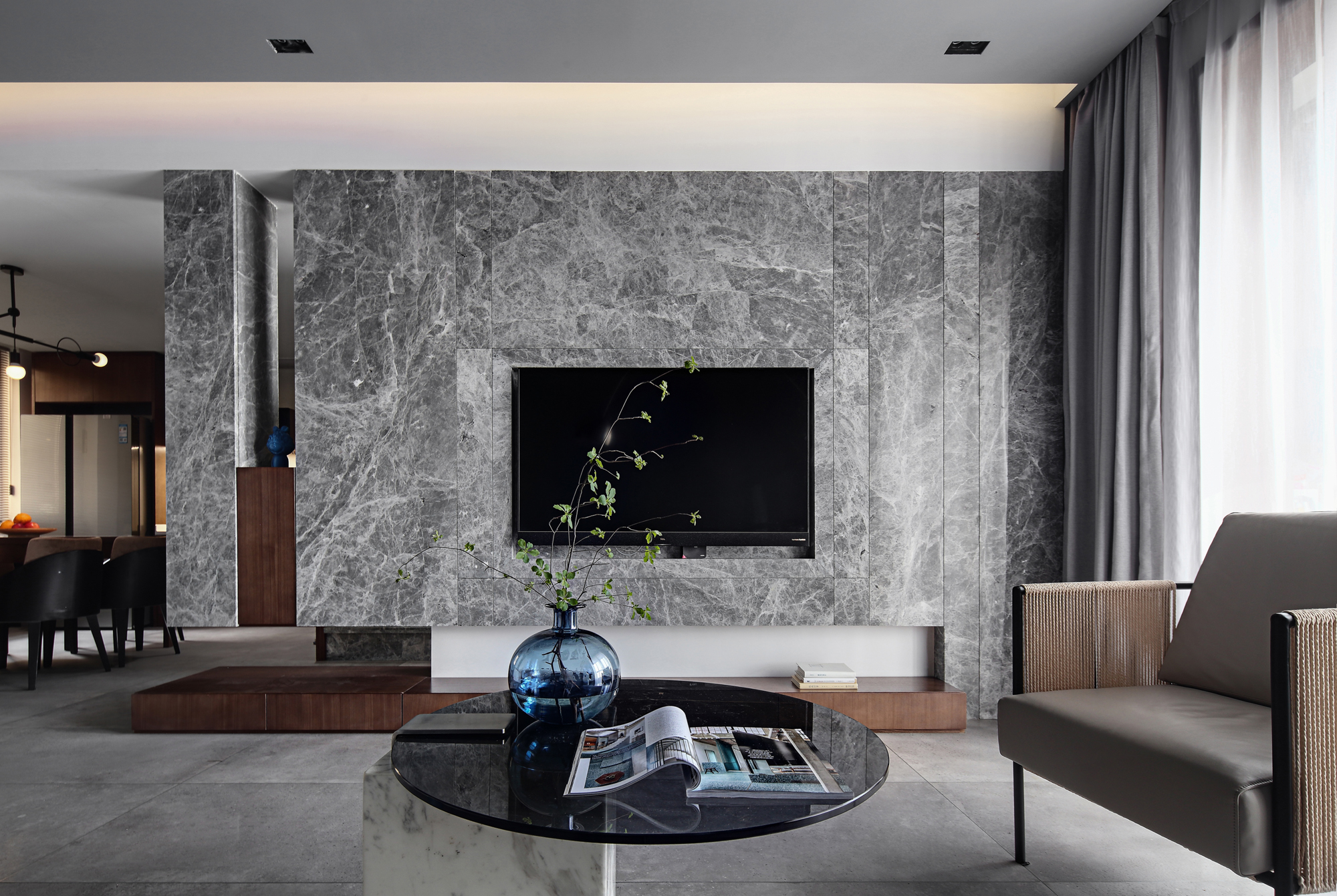 灰色大理石电视背景,原木地台代替电视柜。背景墙设计虚实相间,视线穿透大理石背景墙可以看到楼梯与餐厅。
