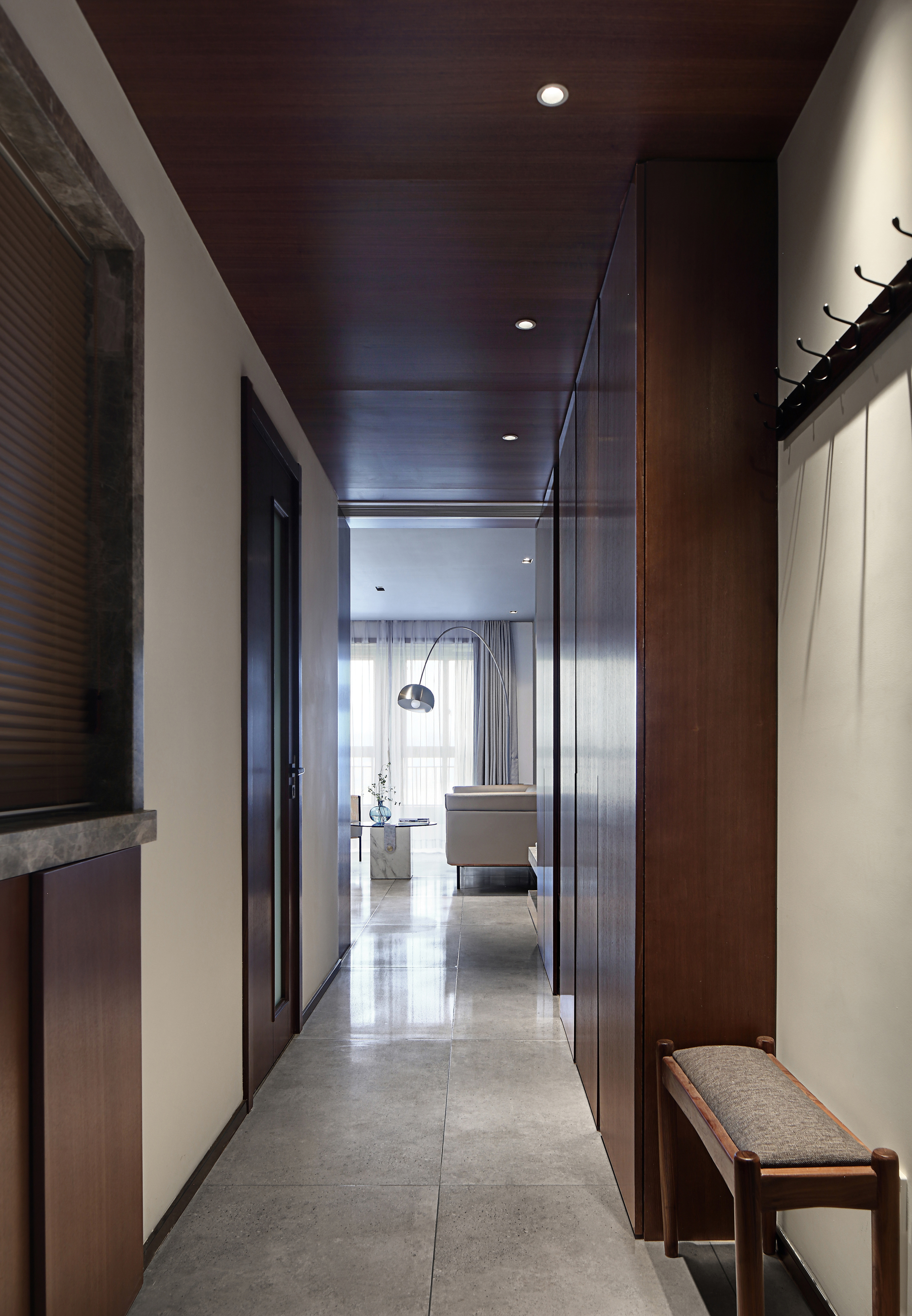 玄关左侧是原厨房门,我们没有完全封闭起来,下半部分鞋柜,上半部分用玻璃分隔,在厨房忙碌时可以随时看到下班归来的家人。右侧换鞋凳方便老人坐下来穿鞋子,墙面的挂钩可以挂一些进出门常用的物品。