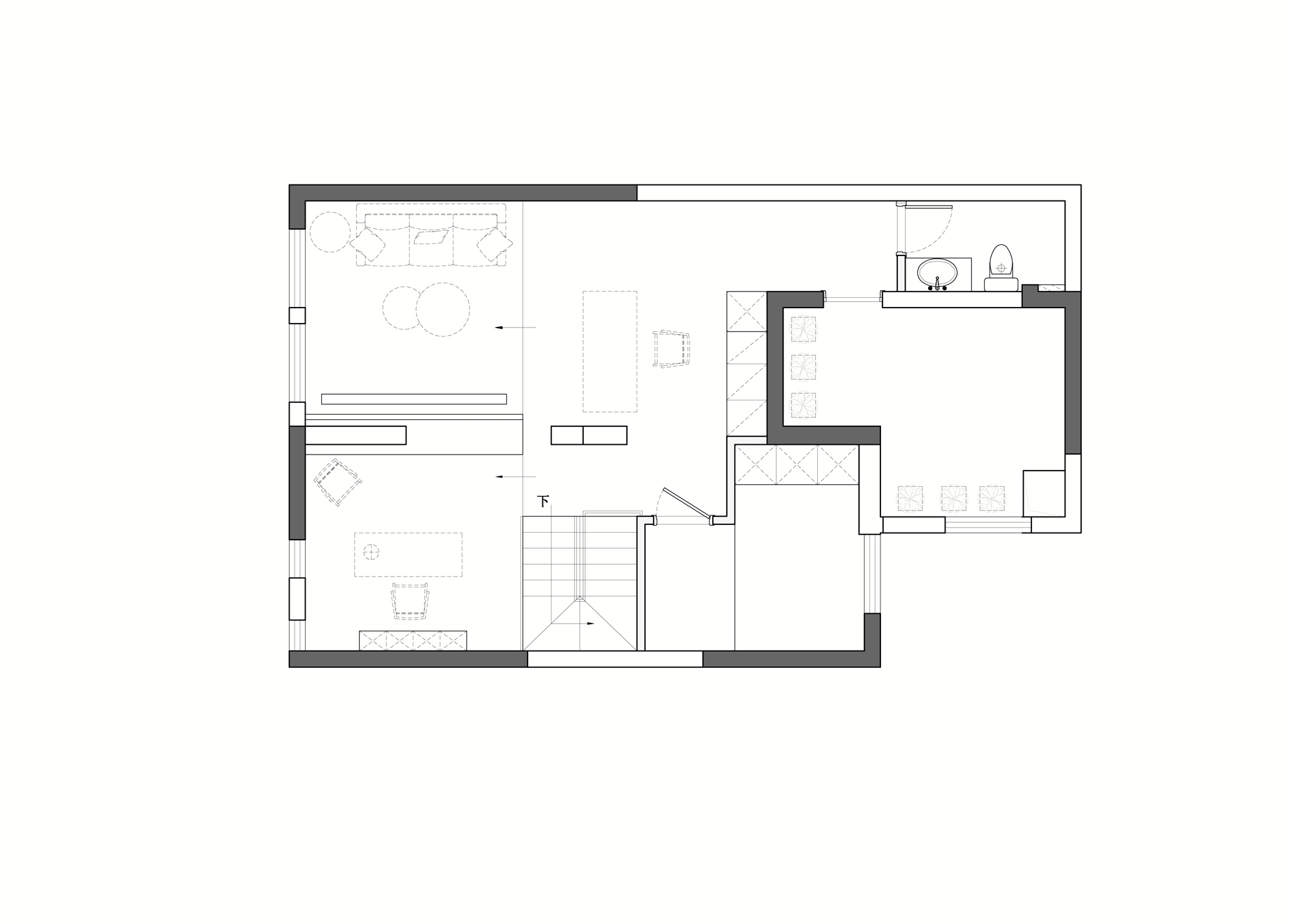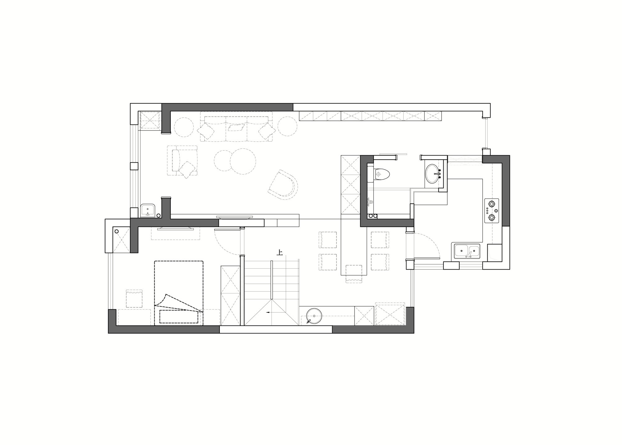空间布局:原户型是两室两厅一厨一卫,通过改造,一层保留了一间卧室给父母住,另外加出了楼梯空间。原餐厅位置改成了酒柜,酒柜延申至厨房(原次卧室的位置),餐厅靠近楼梯,冰箱也从厨房改到了与餐厅相邻的西厨操作台旁。原厨房门开在玄关位置距离餐厅较远,我们更改了厨房的格局,将卫生间的一部分空间让给了厨房,扩大了厨房的同时,也给了厨房面对餐厅开门的可能性。卫生间与厨房之间用电动雾化玻璃作为分隔,既保留了卫生间的采光,又保证了私密性。