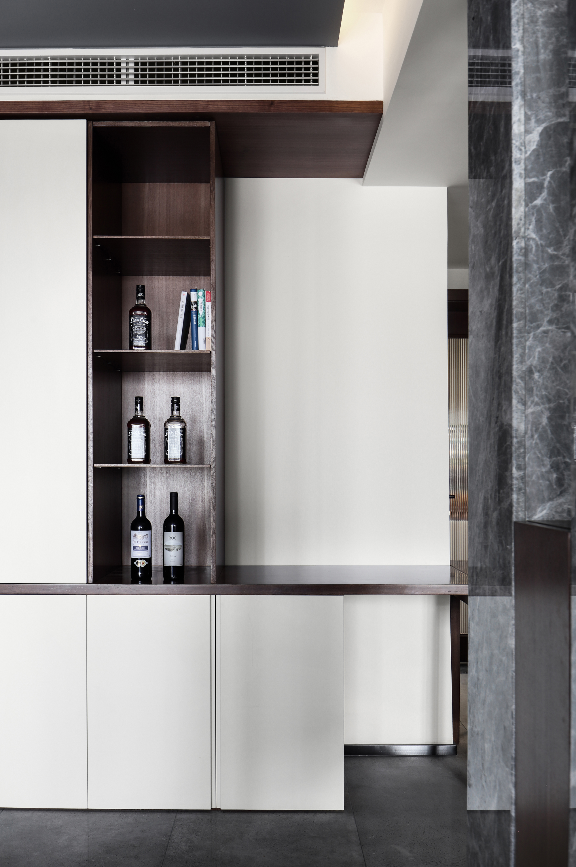 玄关看向餐厅,酒柜加长延申至餐厅与餐桌相接连接成一个整体,视线尽头的西厨台面与冰箱。