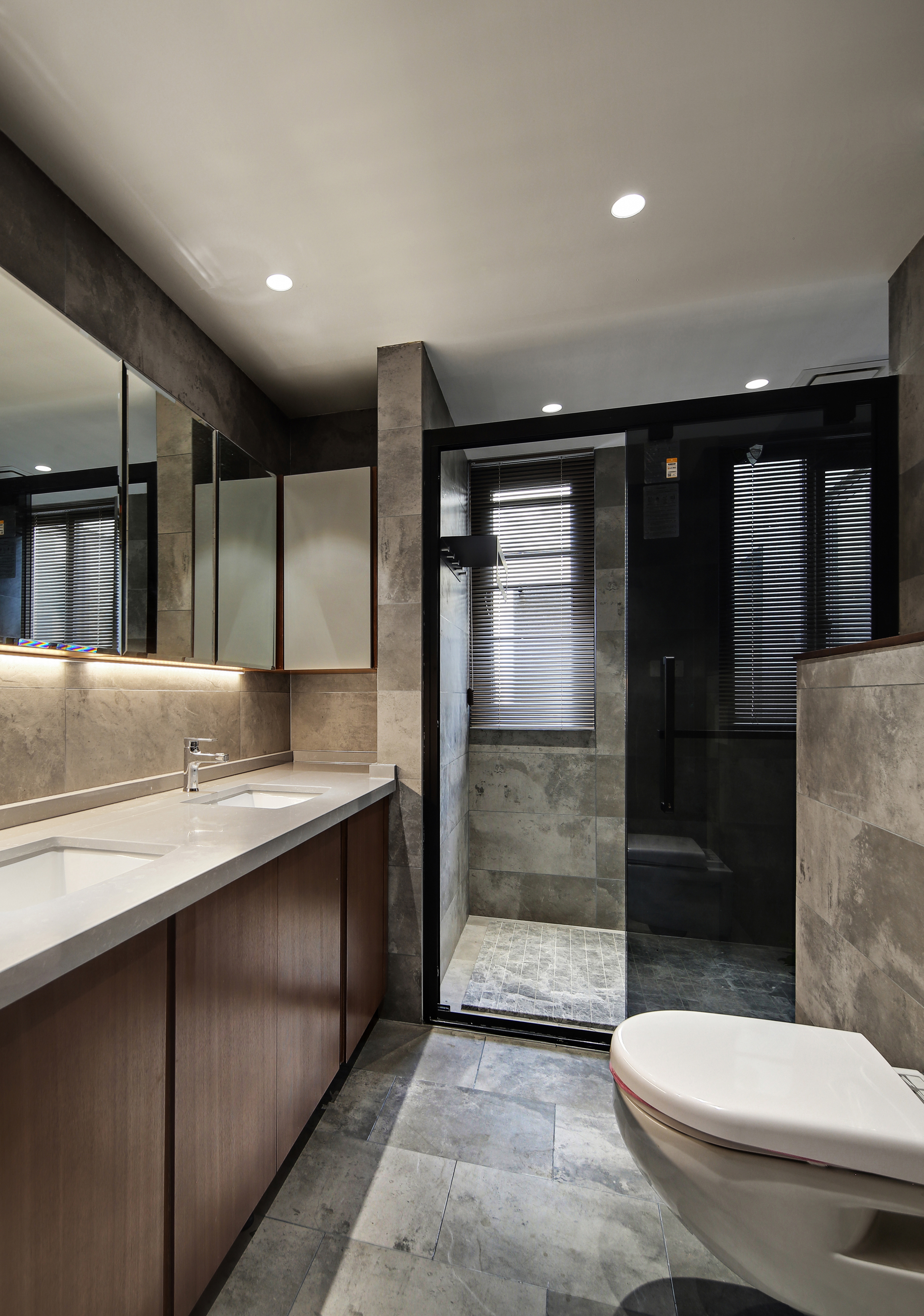 主卫挂壁式马桶时尚方便打理,黑色边框灰色玻璃淋浴房搭配的黑色花洒。