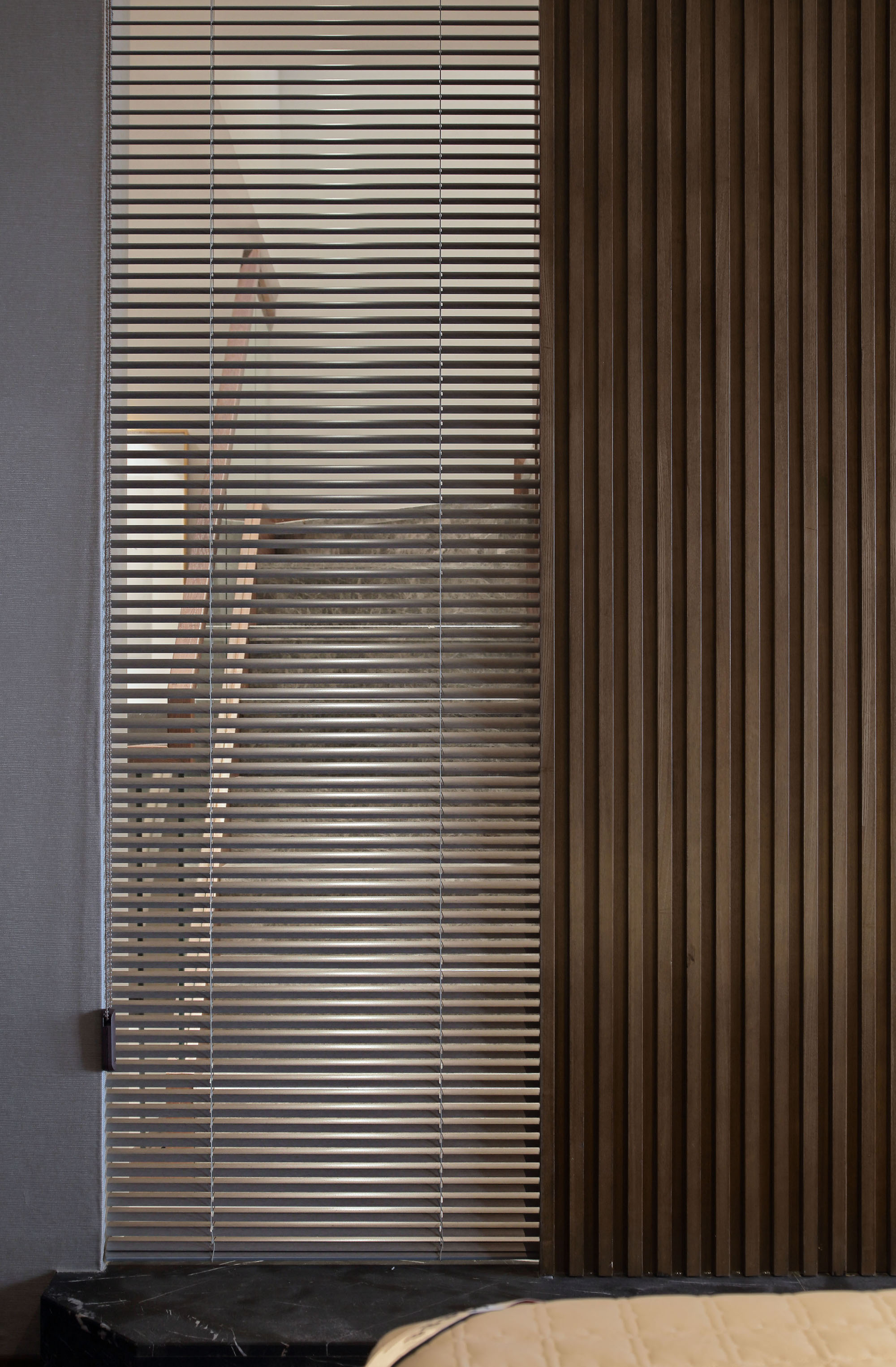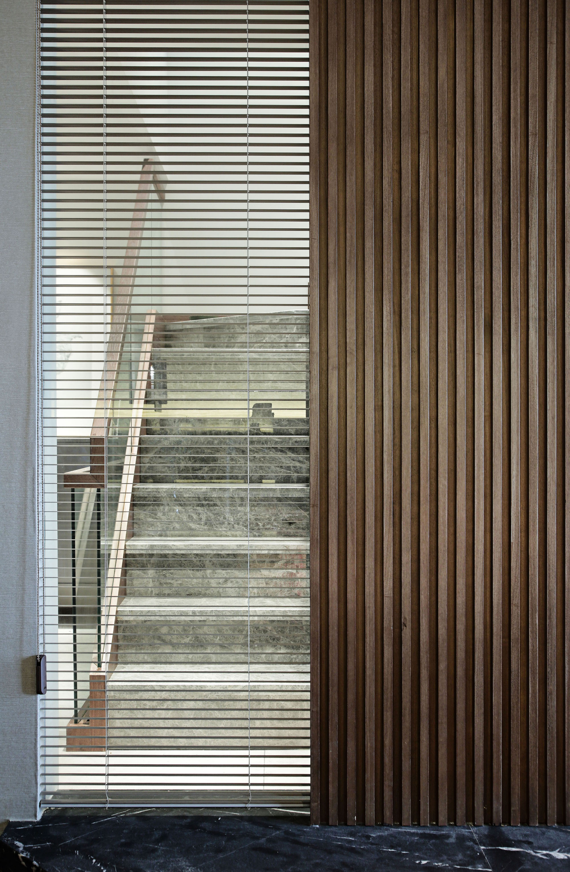 打开电视墙左侧的百叶,视线穿透玻璃可以看到灰色大理石楼梯。