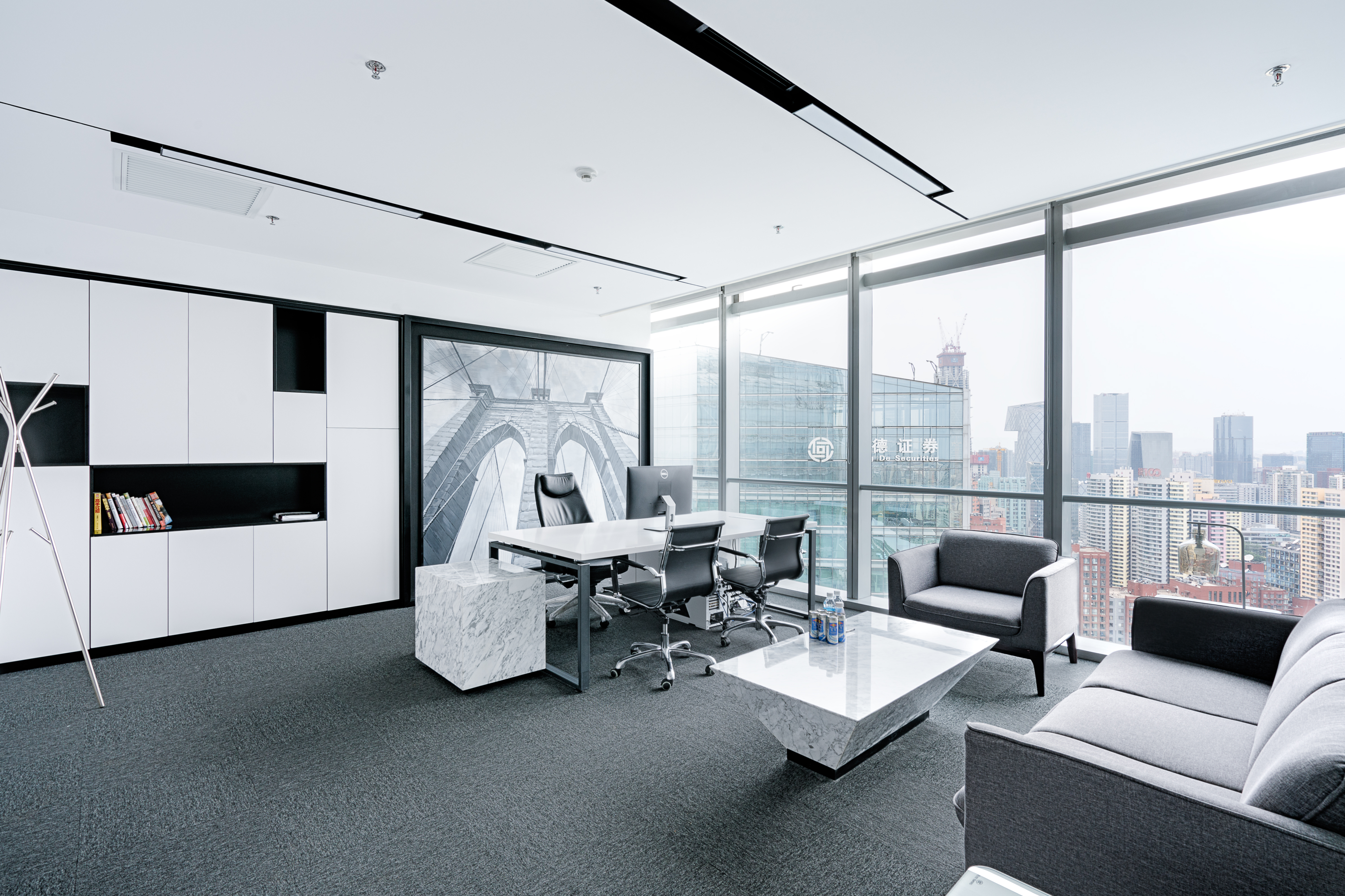 空间意境:项目在30层,视野非常好,所以所有的区域都是尽量用玻璃等通透,无过多遮挡的处理手法,内外借景,在空间颜色上大胆采用黑白调来处理,增加整个空间的张力。