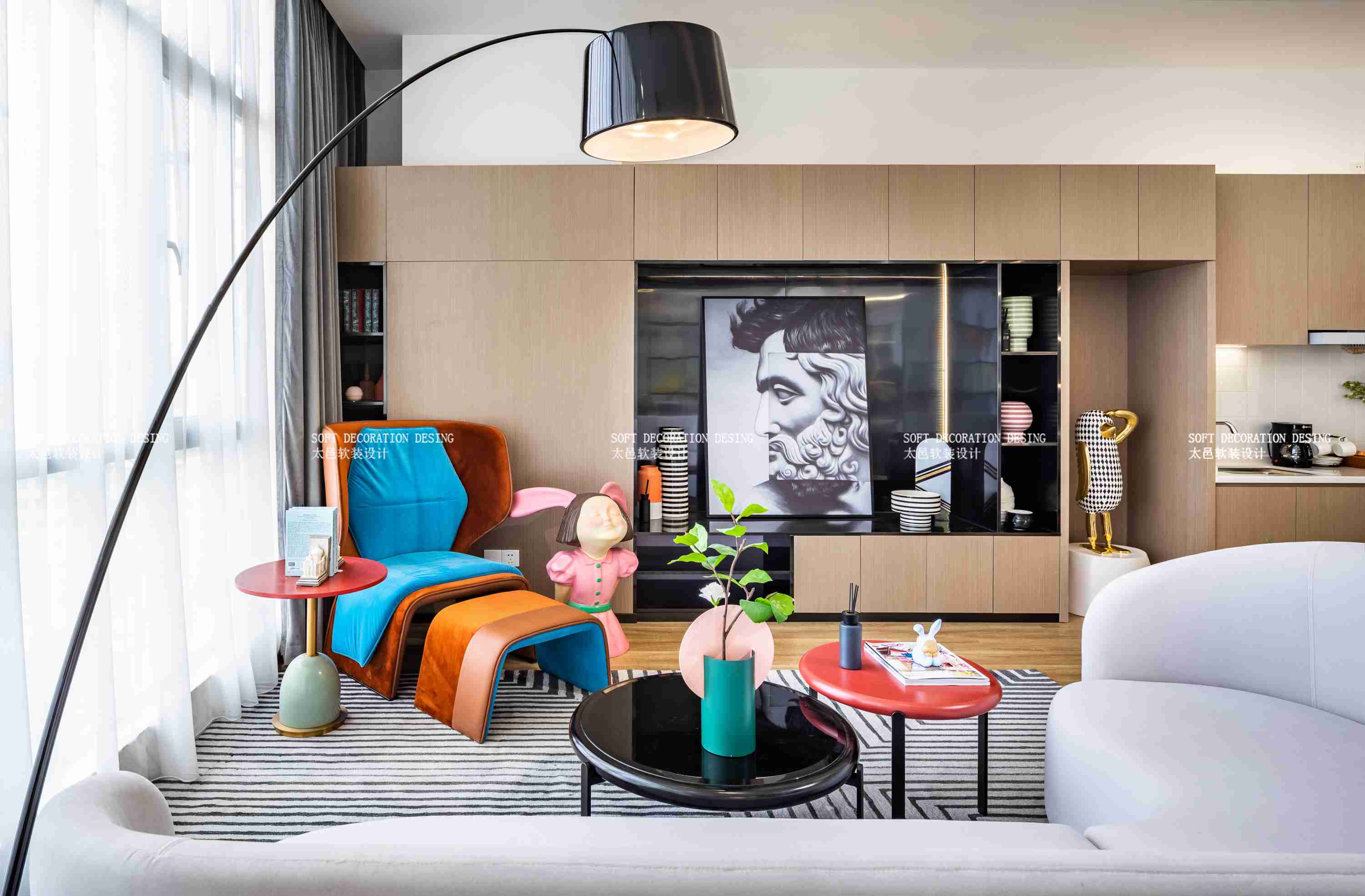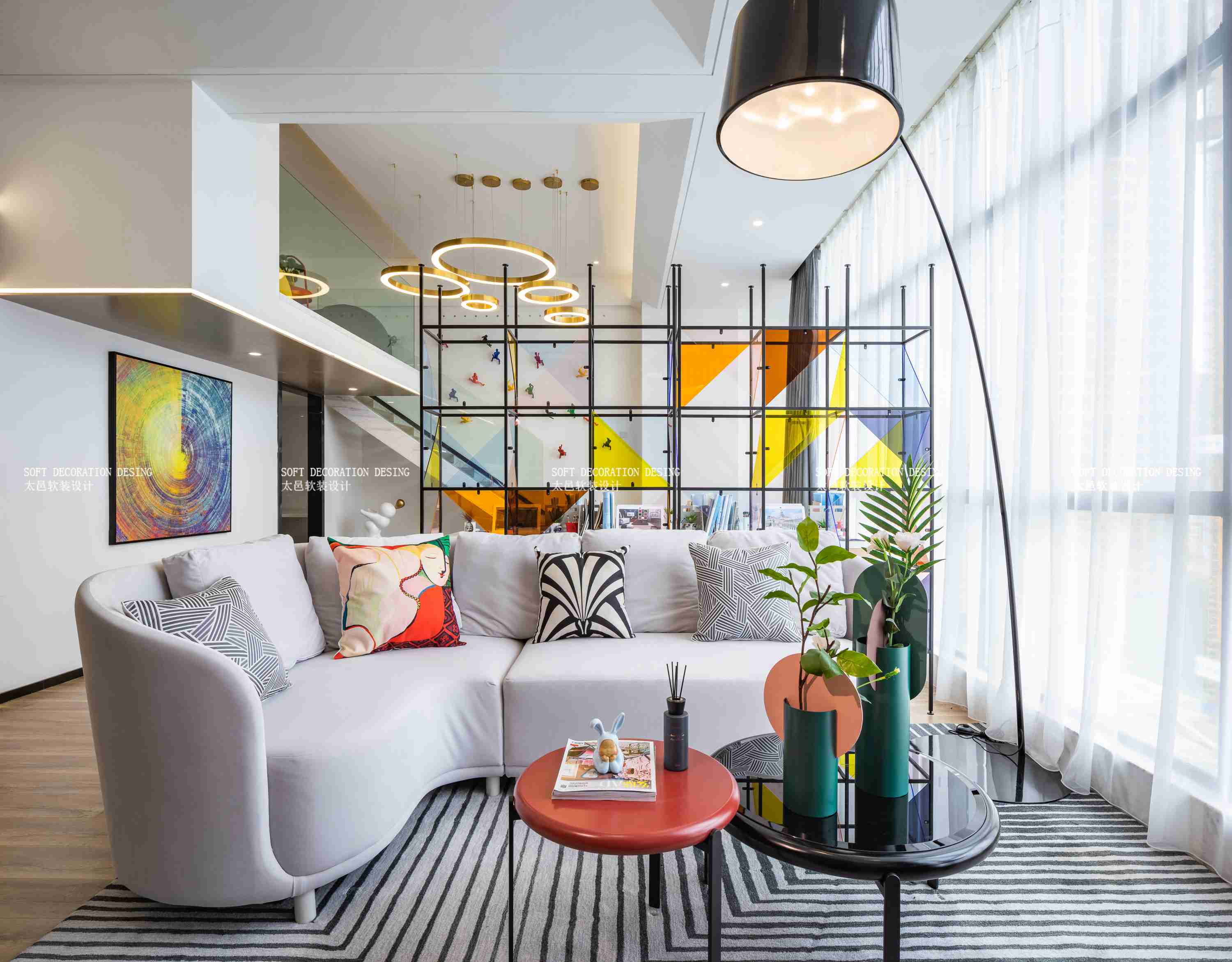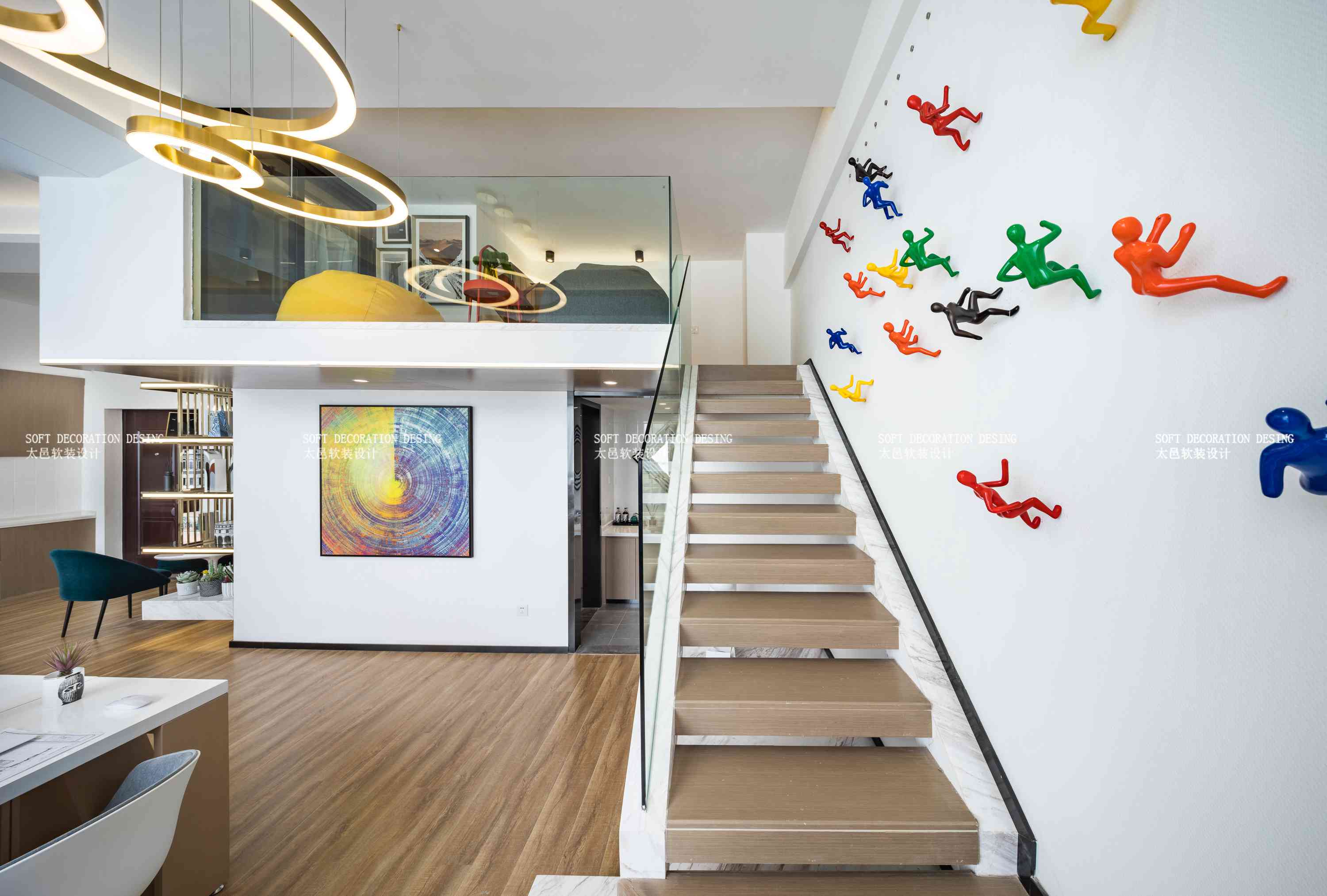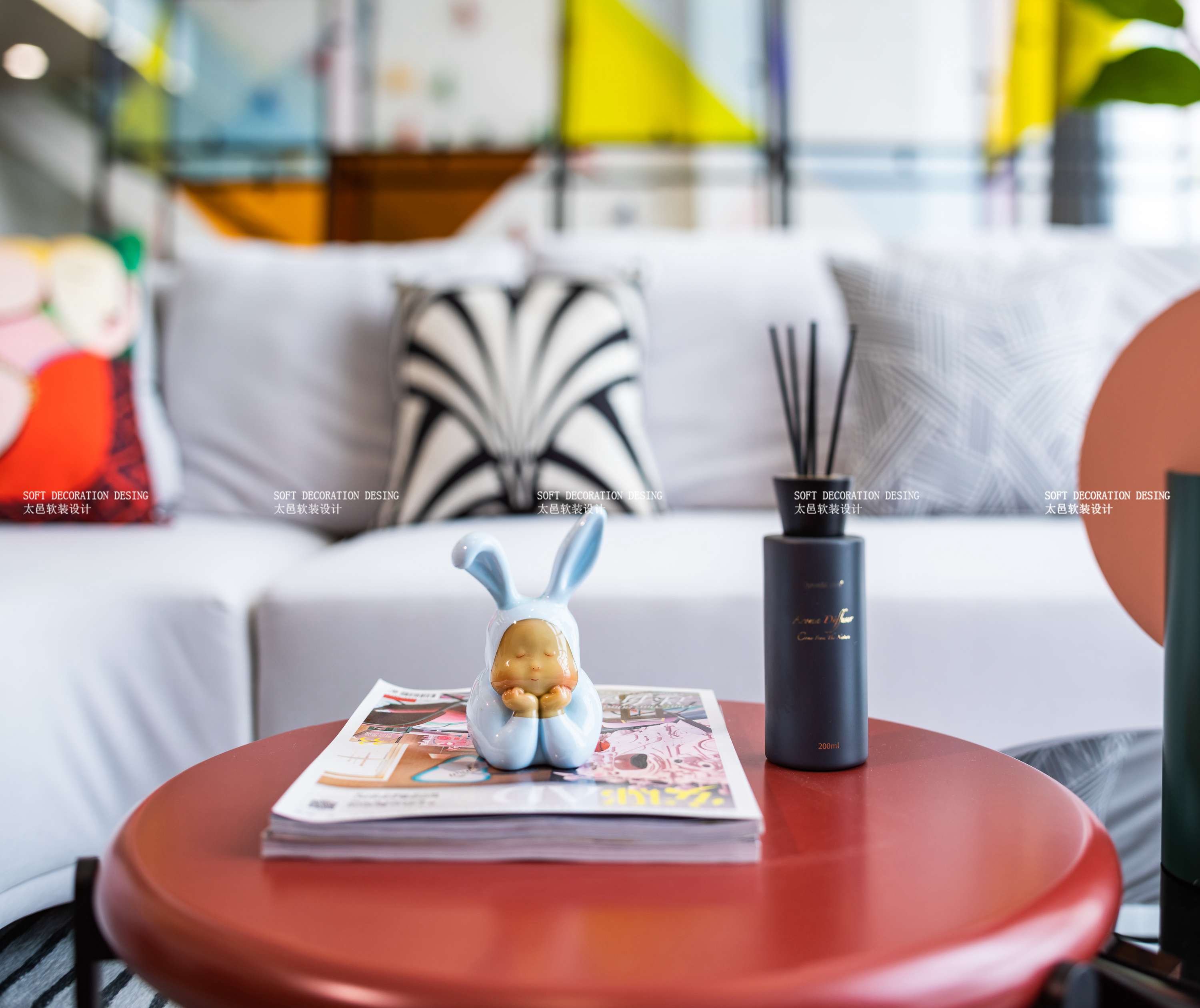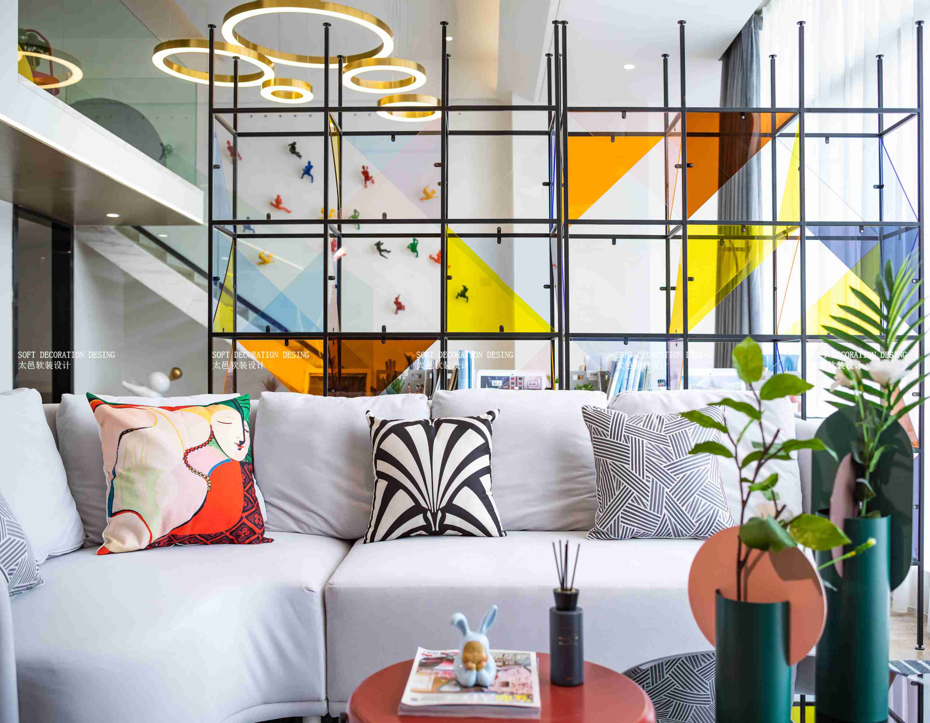 空间意境:loft风格搭配悦动的雕塑以及大胆的色彩搭配,大面积的空白和局部缤纷色彩搭配,让空间不仅不失活力更不会视觉疲劳。