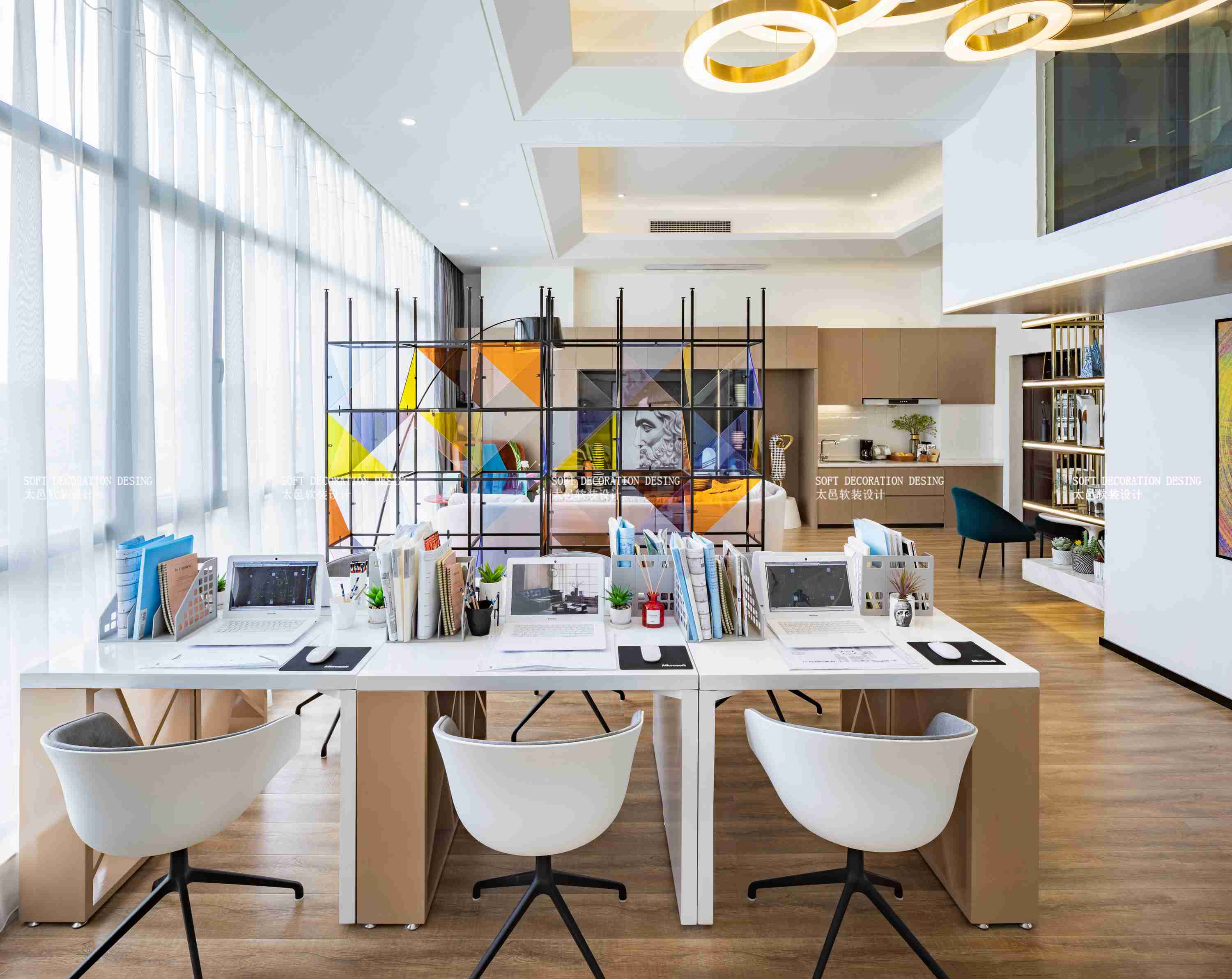 空间布局:没有过多墙面干扰,整体通过屏风做隔断,让空间显得空旷开阔,提升视觉效果避免压抑效果,非常适用于办公空间,让空间紧迫感减少。