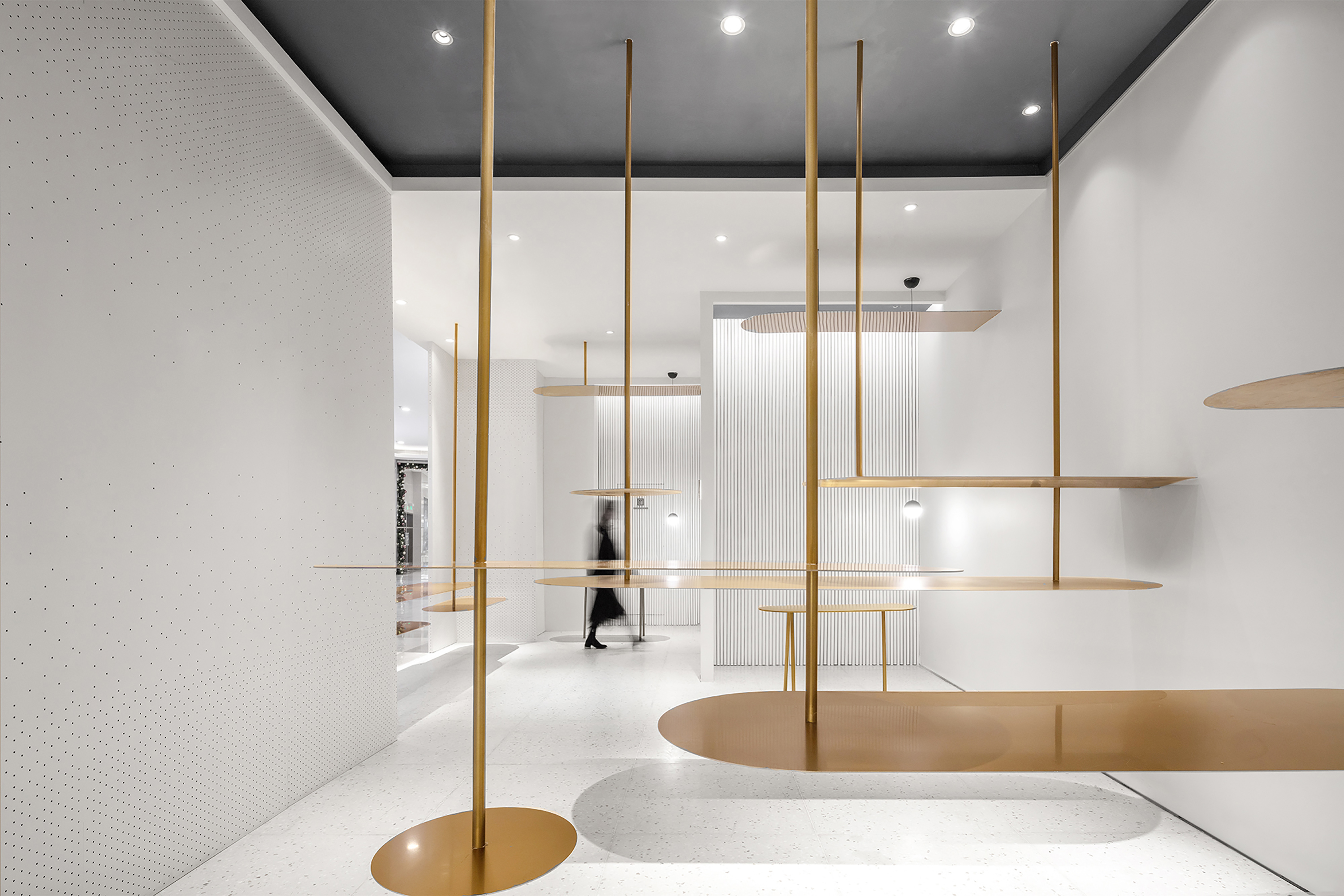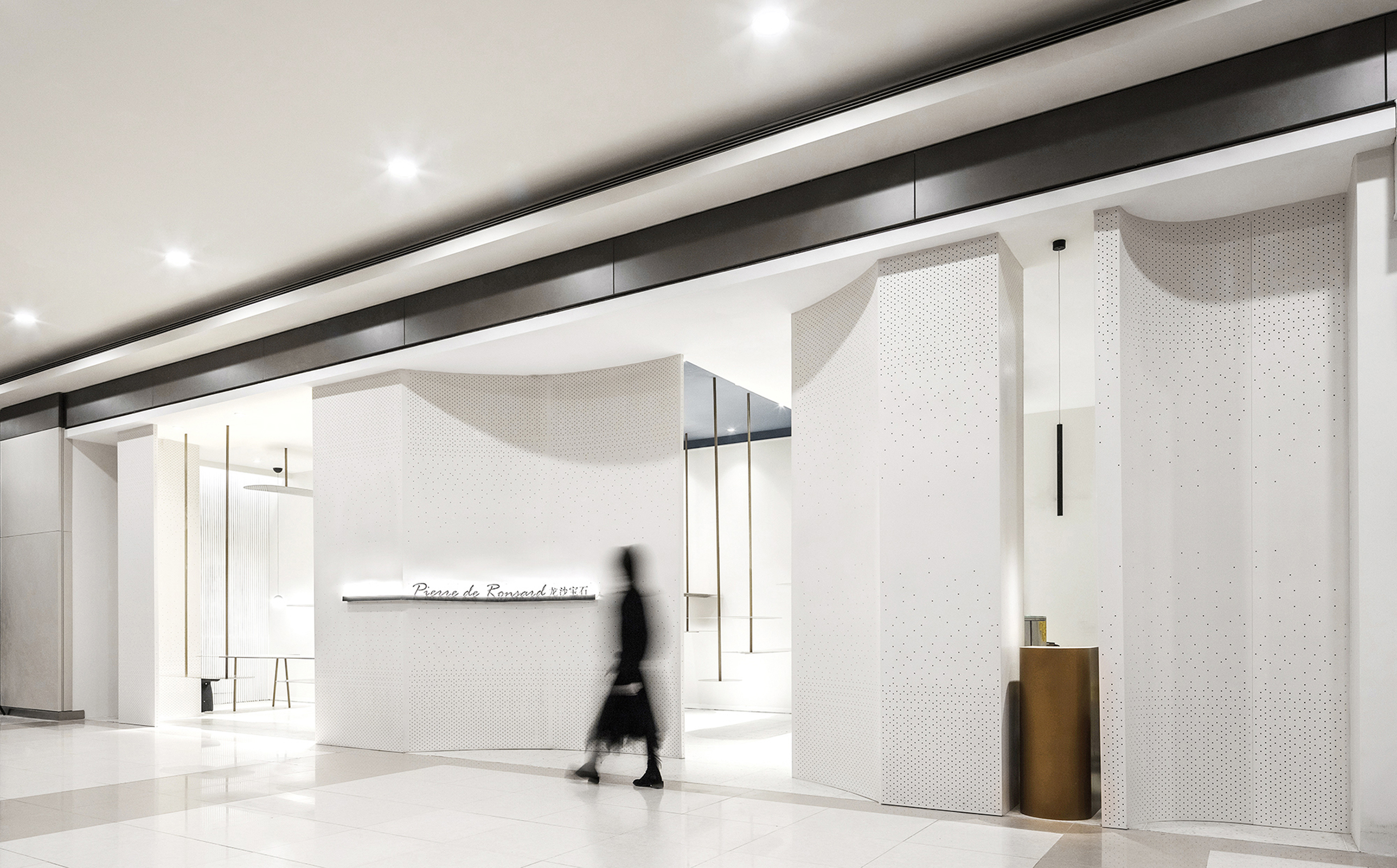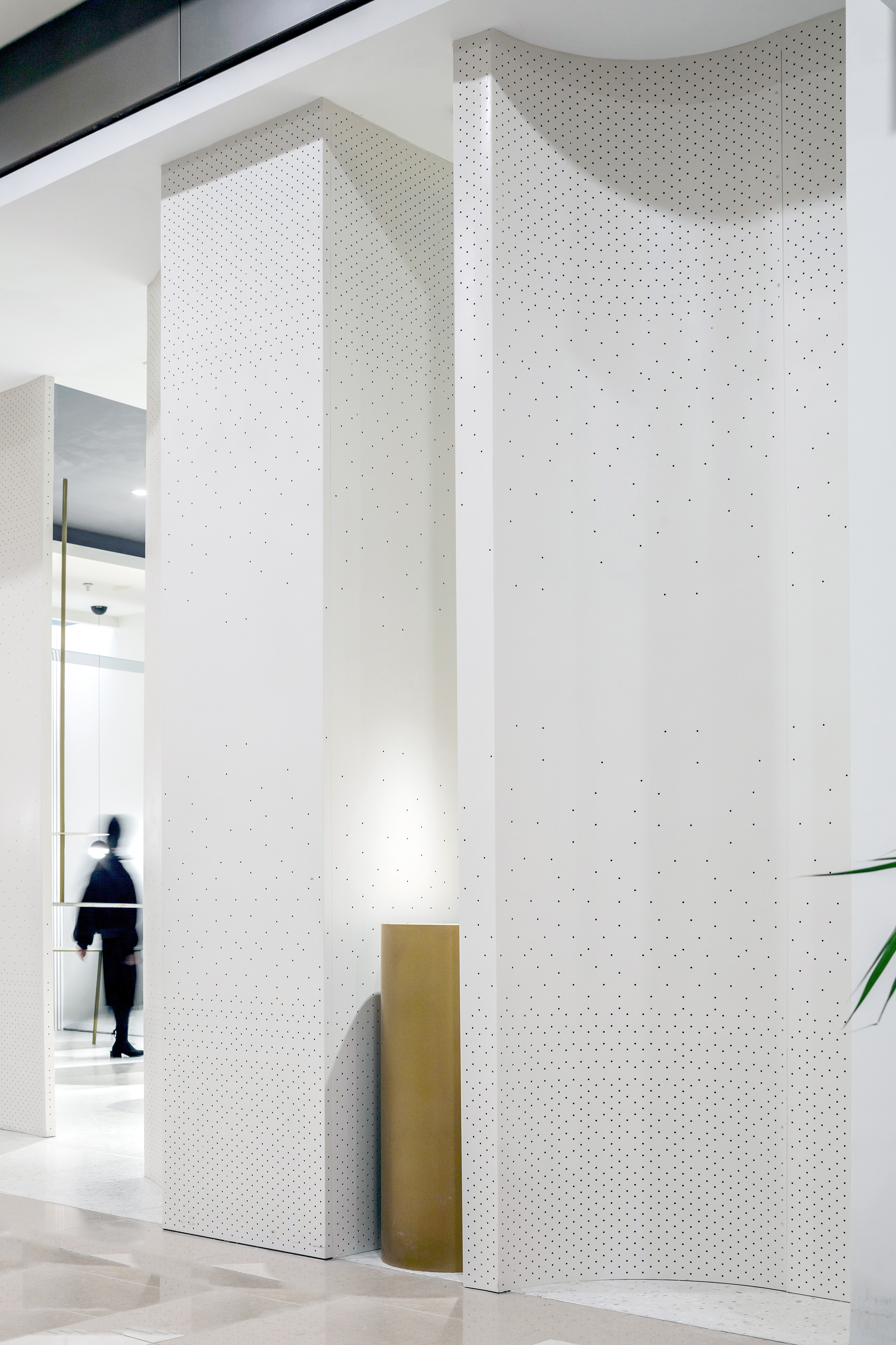 设计选材:围绕模糊边界的概念 入口象牙色的穿孔弧墙 以渐变的孔距回应。
