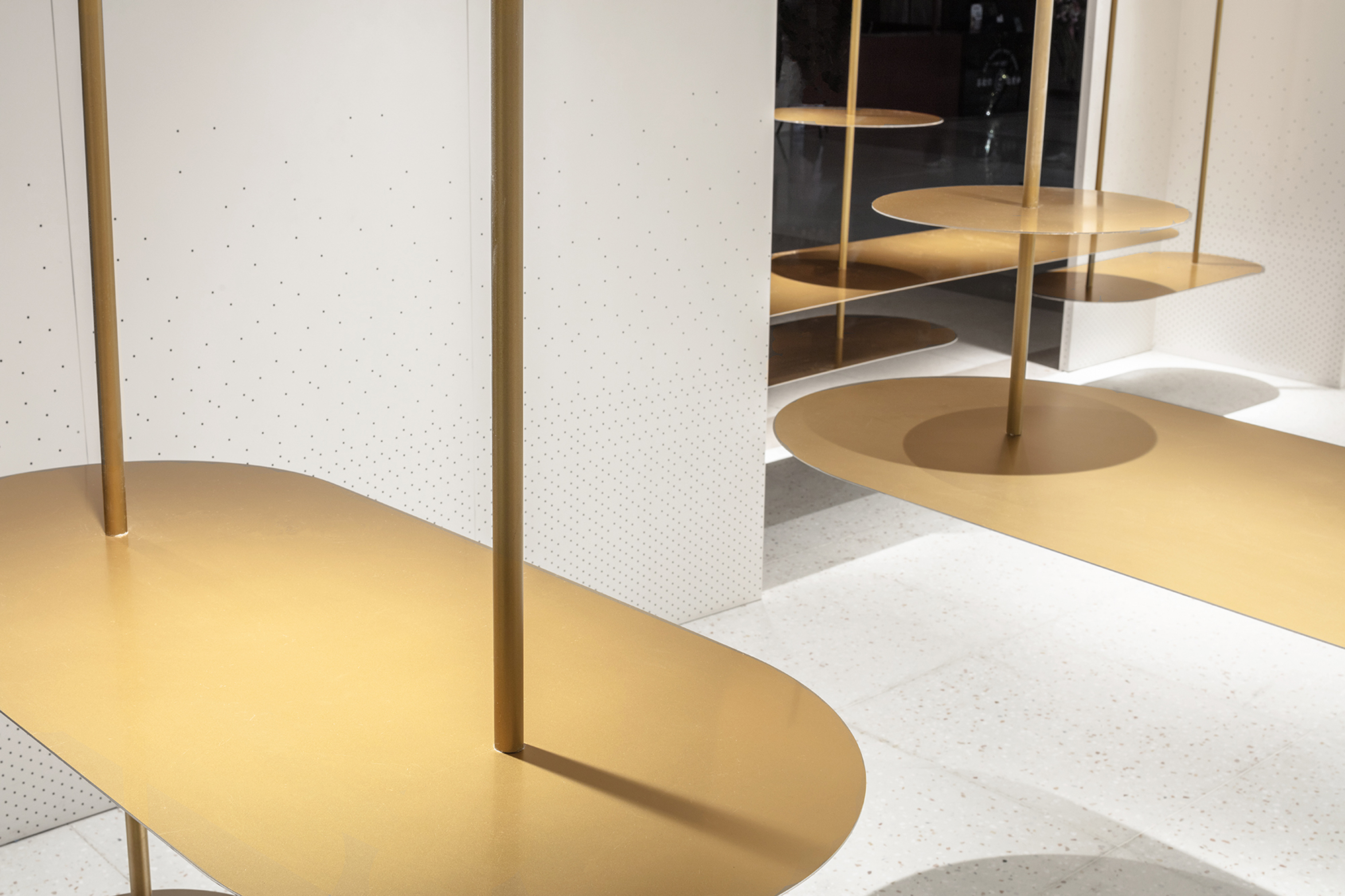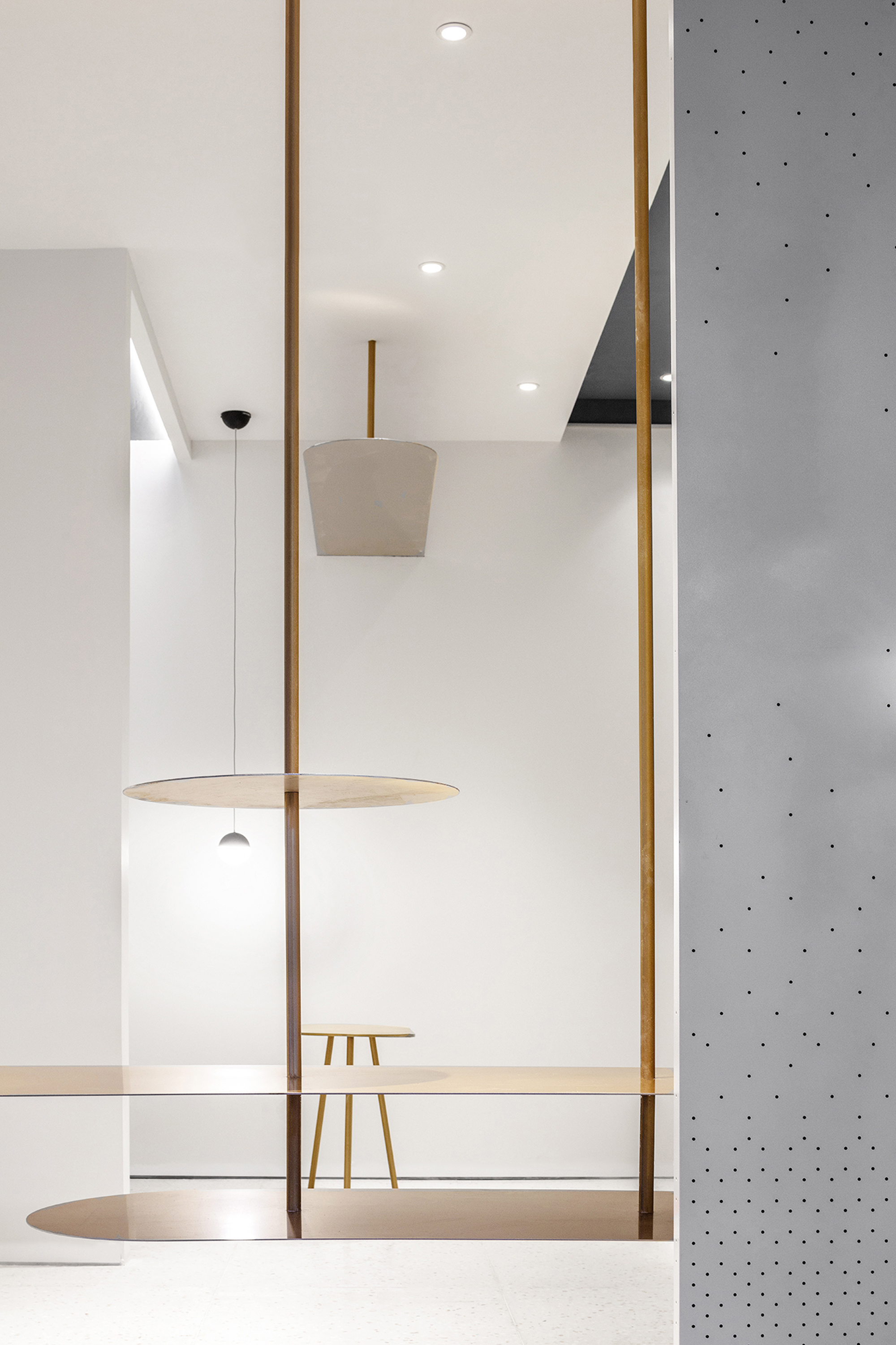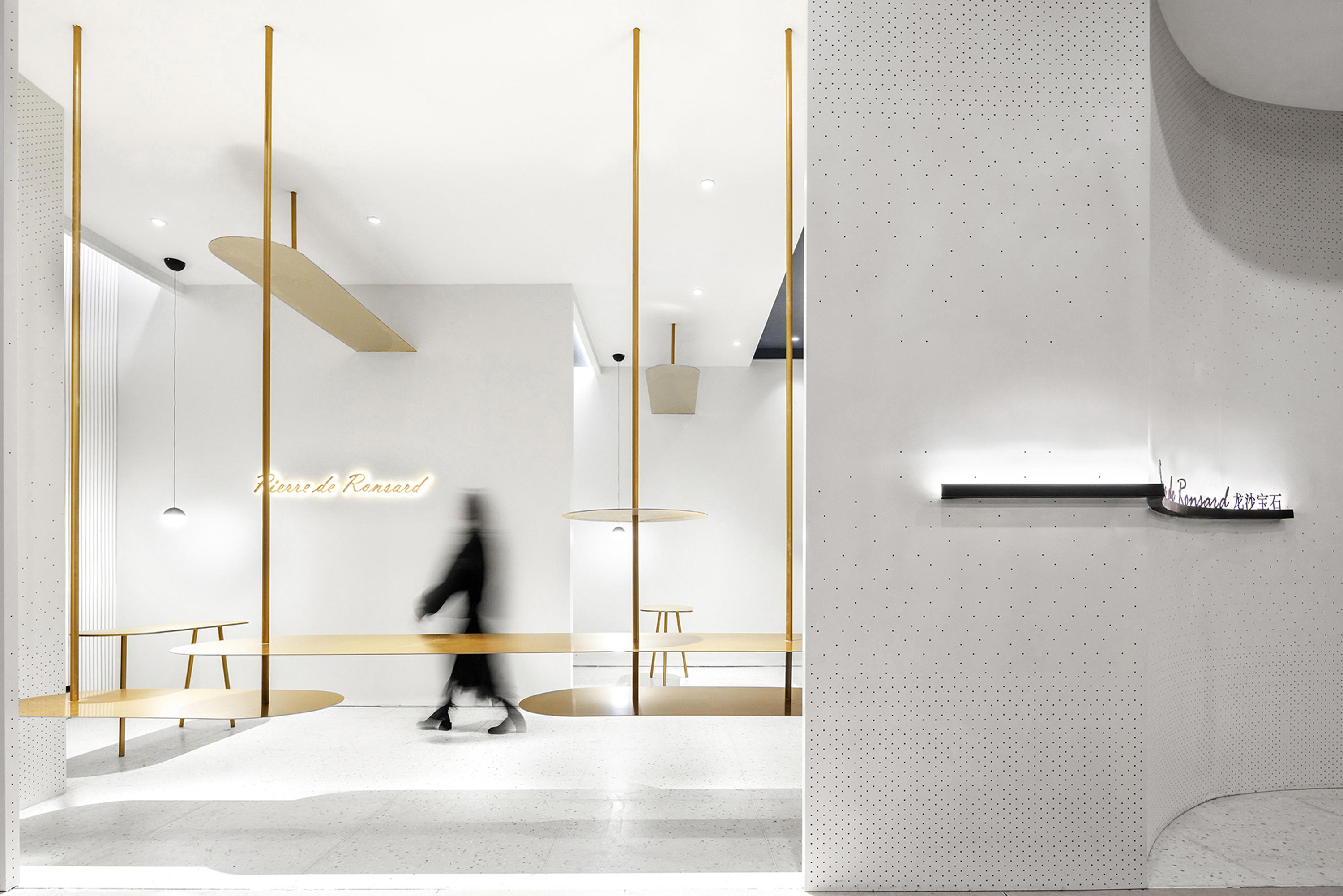 设计选材:围绕模糊边界的概念 入口象牙色的穿孔弧墙 以渐变的孔距回应。