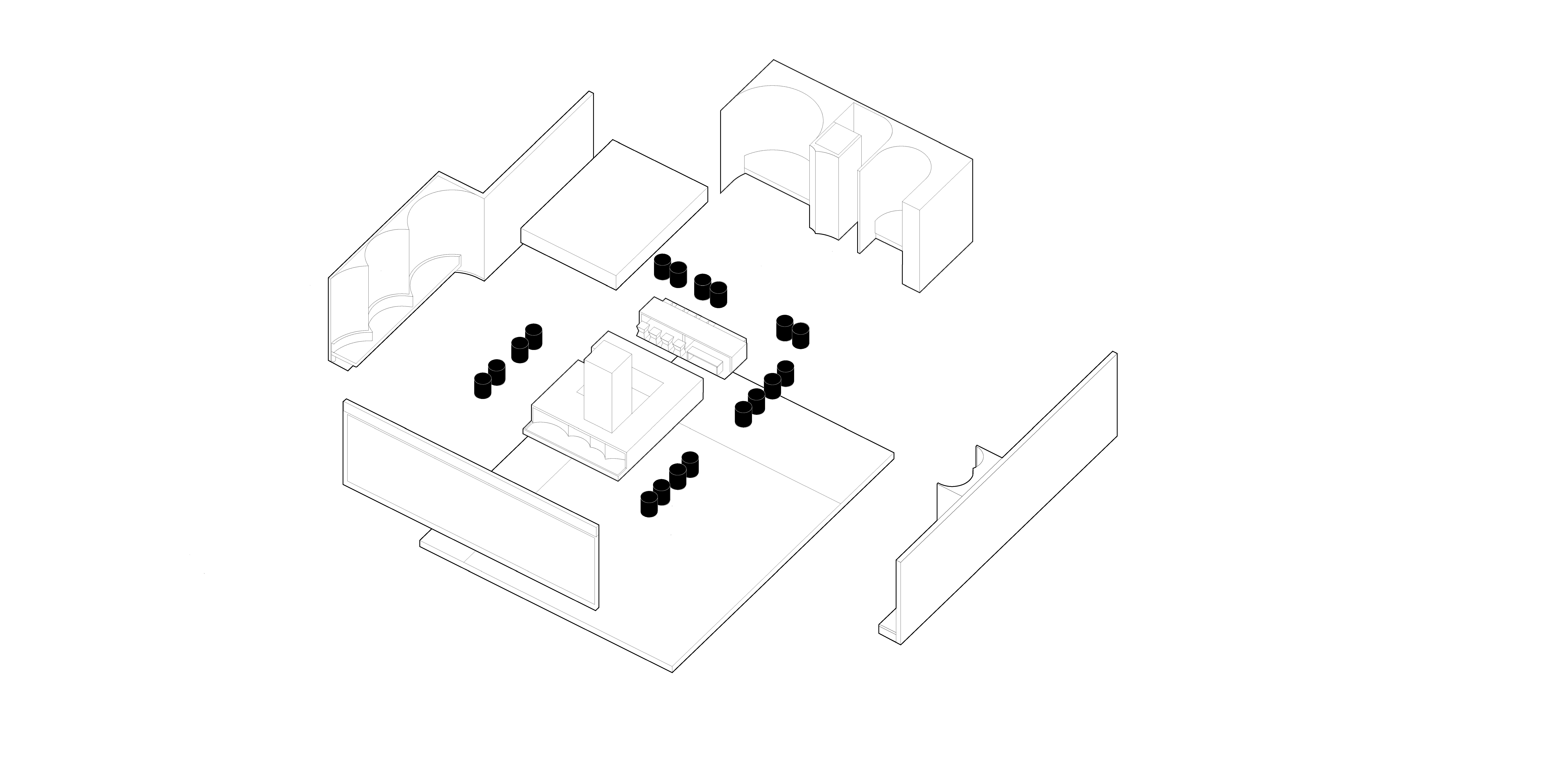 空间布局:场地位于商业写字楼背面,形体闭合且尺度巨大。空间一方面结合品牌彰显的诉求,以开放的姿态呼应内外,另一方面,也希望在单调的街道中开辟一处“洞口”,可以容纳来往行人的停留。