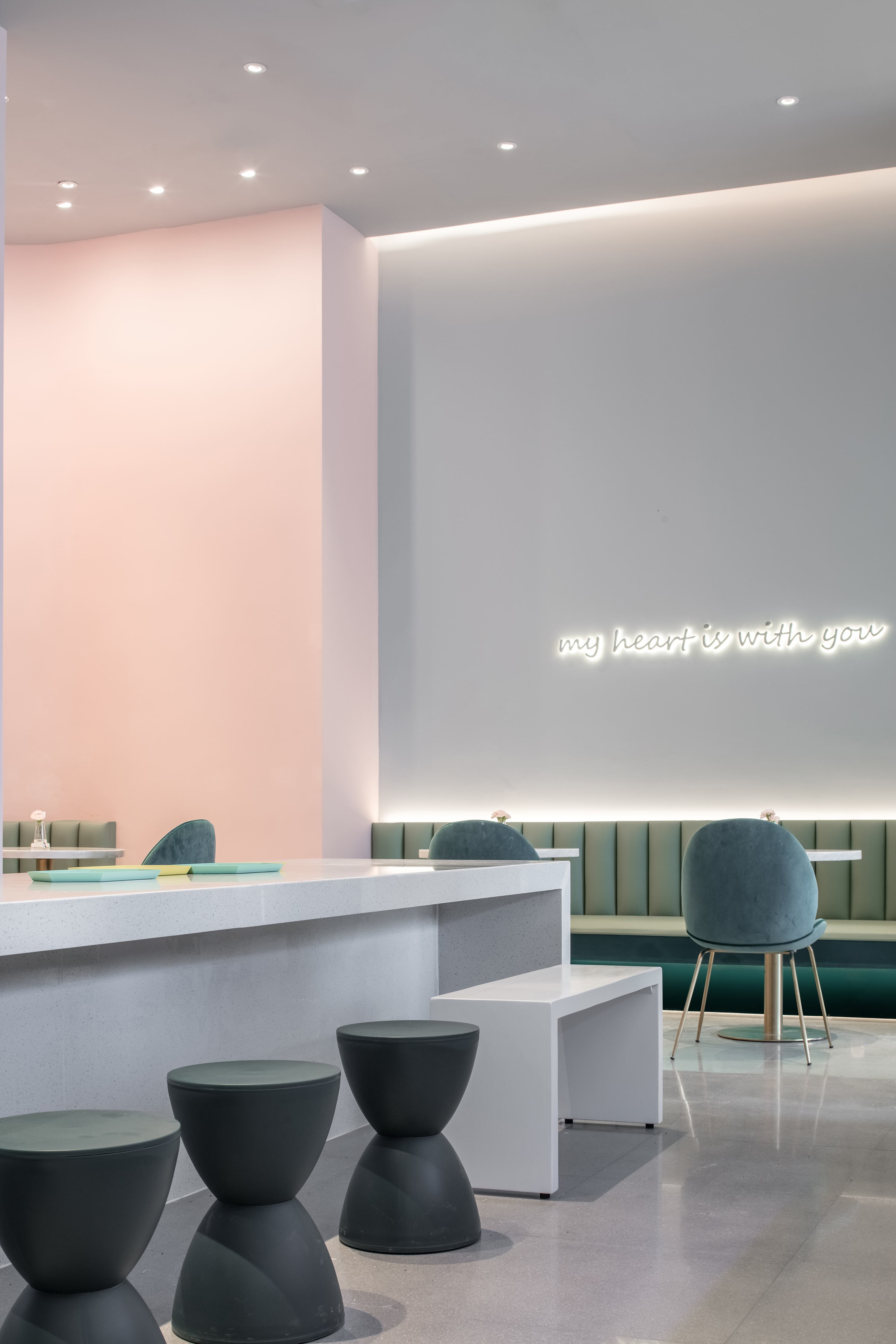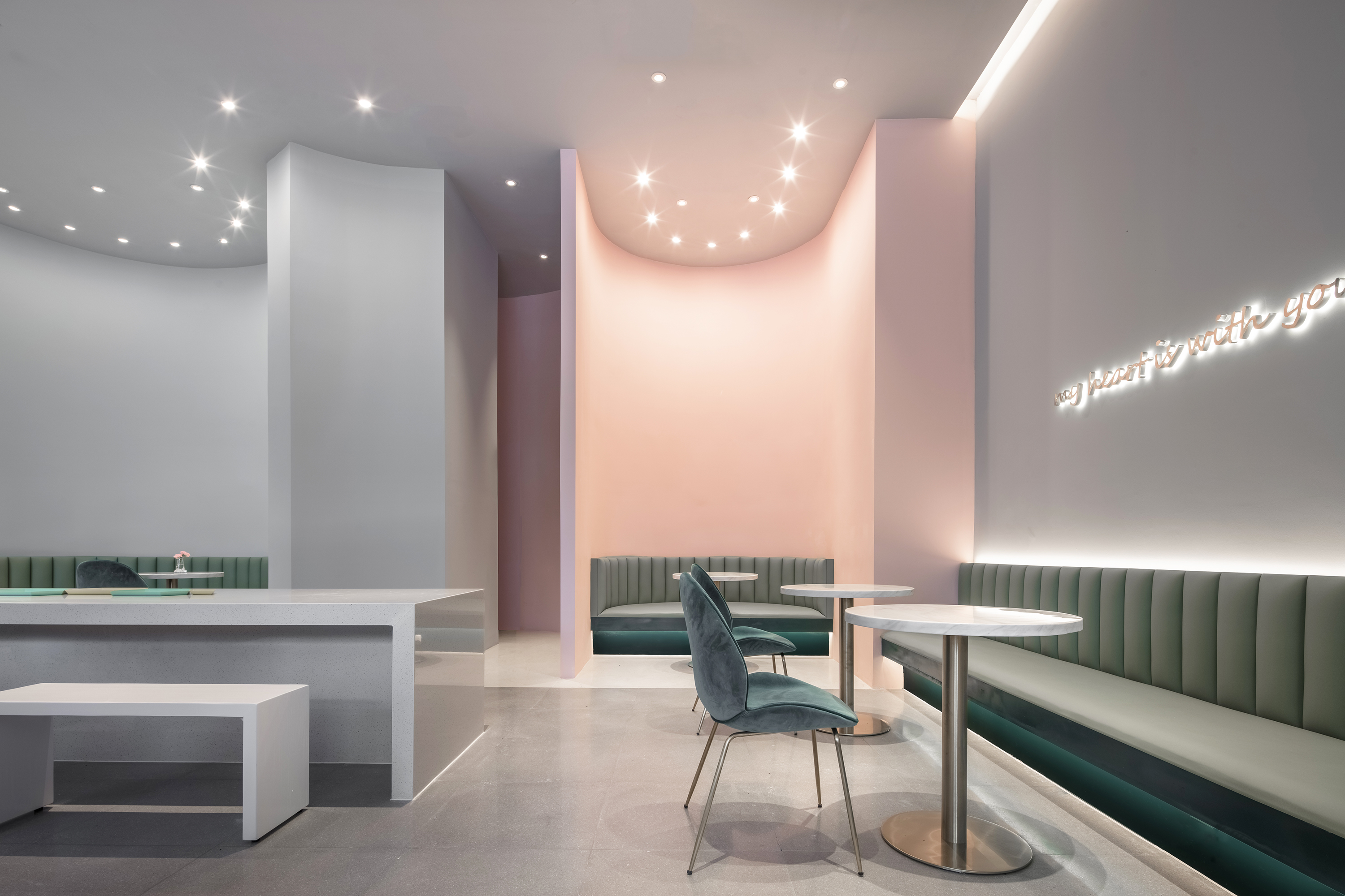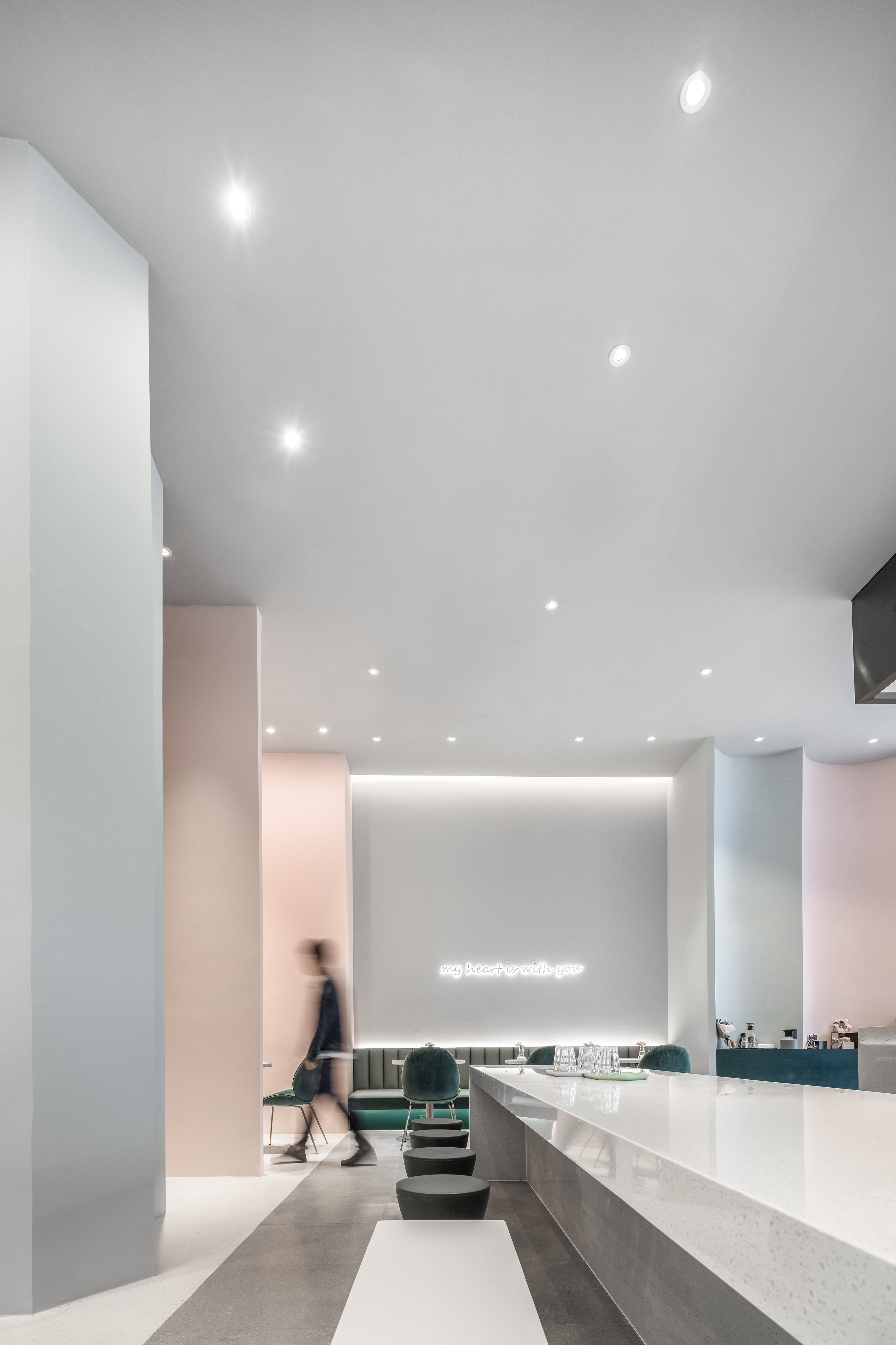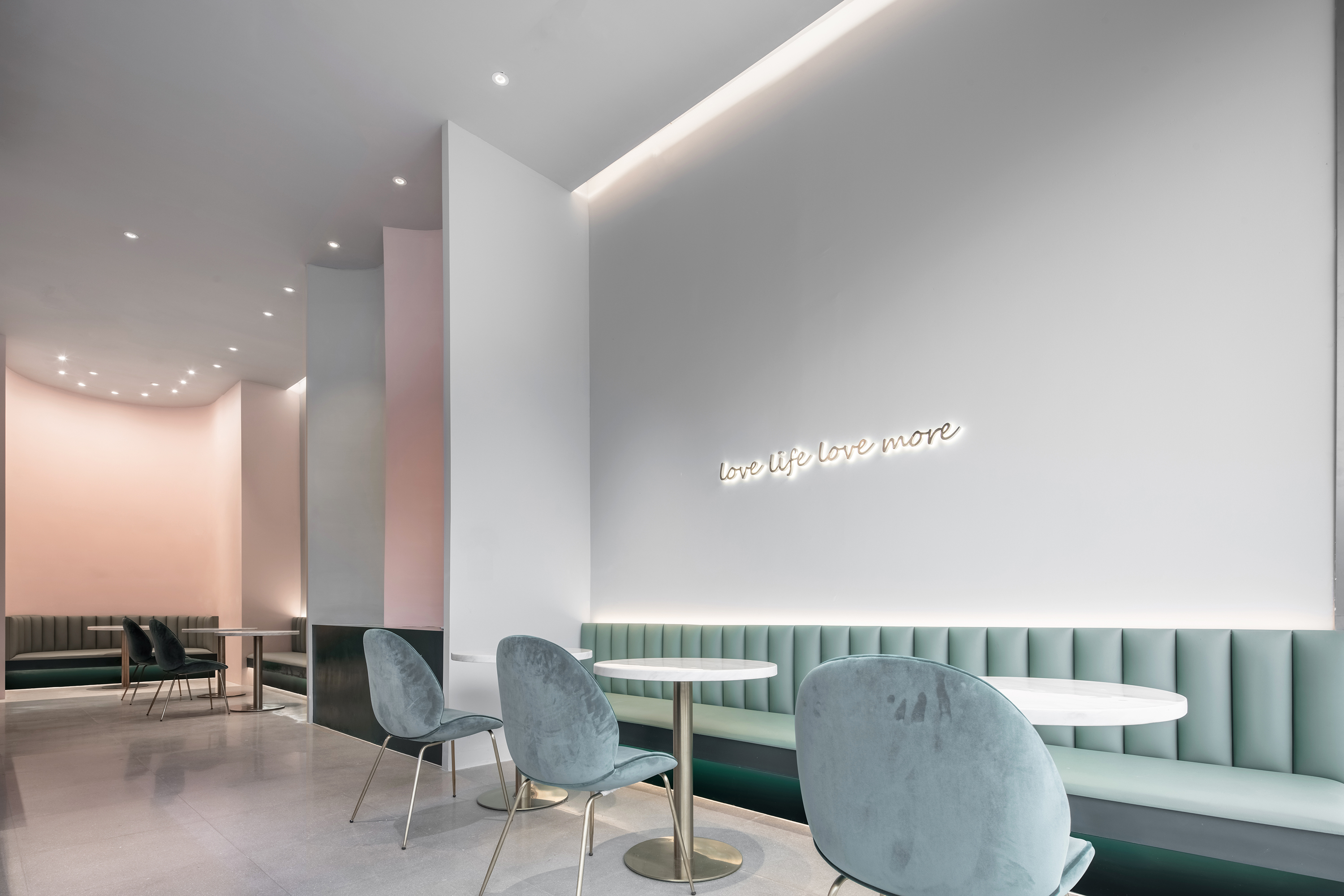 空间意境:如同与亲密的人在晨雾与日出中相视而坐度过美妙的时光一般,LOVEMORE的空间里使用了烟云色与淡红来匹配空间和主题,色彩与光晕共同营造了迷人的体验。