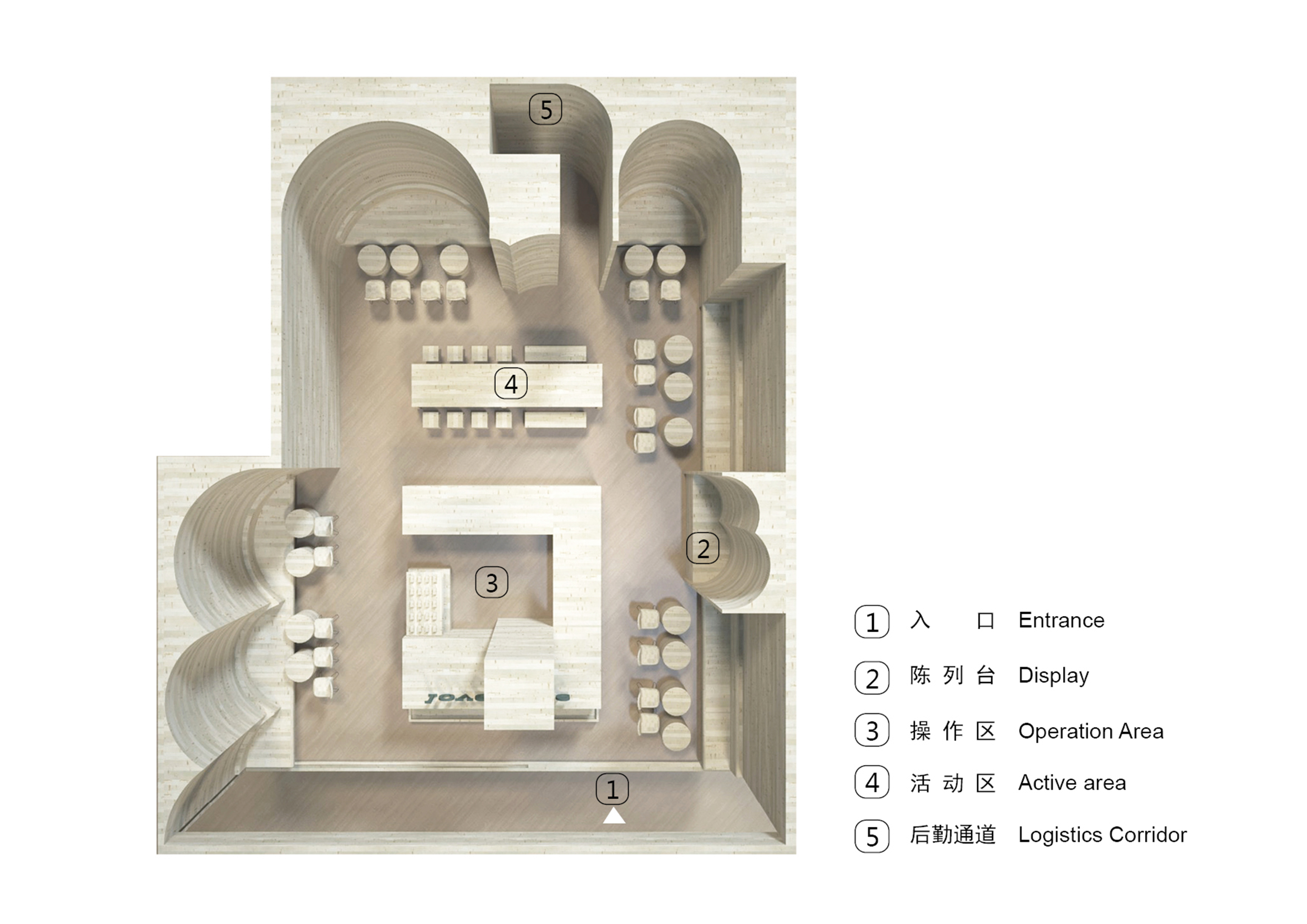 设计选材:在二维的平面中重复交叠的圆形,作为“负形”刻印出内部空间的边界,大小不一的圆洞以动线作为串联,在空间营造出围合环抱的形态,也呼应品牌的特质。