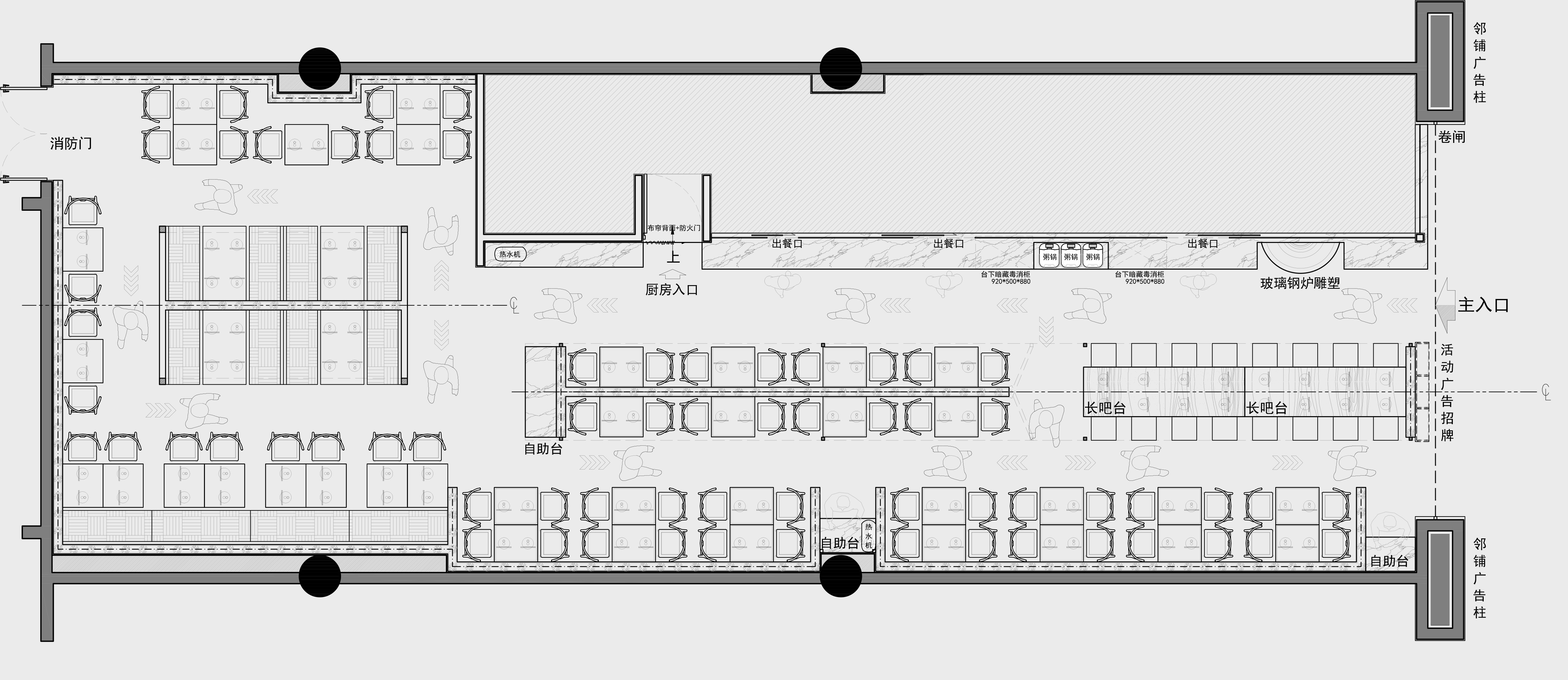 空间布局:此空间狭长,为了让顾客更直观的了解长安味道,我们把厨房设计为明档厨房,并且把西安美食之一烤羊肉串放到了门口,那烟火气和羊肉的香味立马让整个餐厅活了起来,这才是生活;另外一个进门口旁边我们还设计了一个大大的肉夹馍缸,向每一位用餐的顾客传递着专业,专注并传承着传统烤馍的手艺;