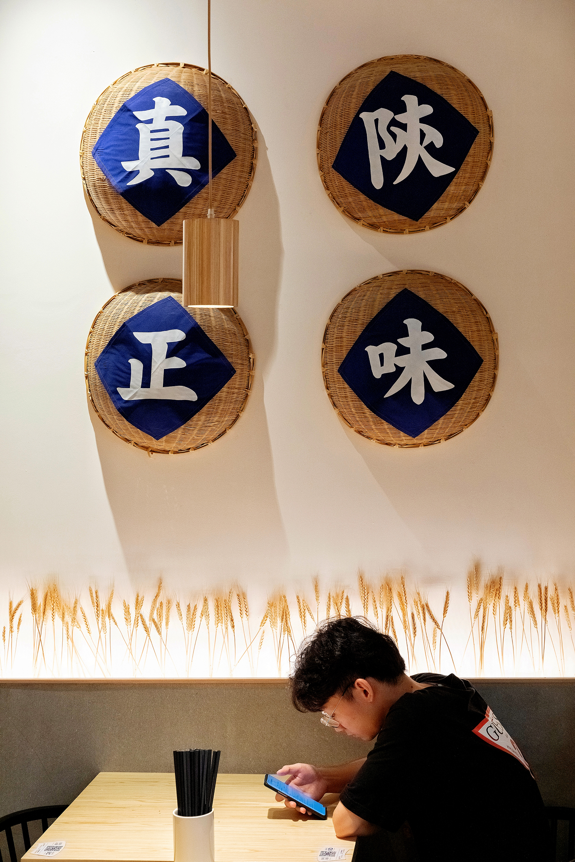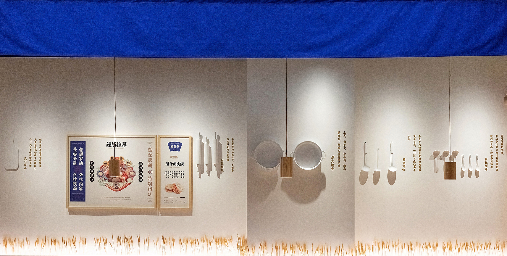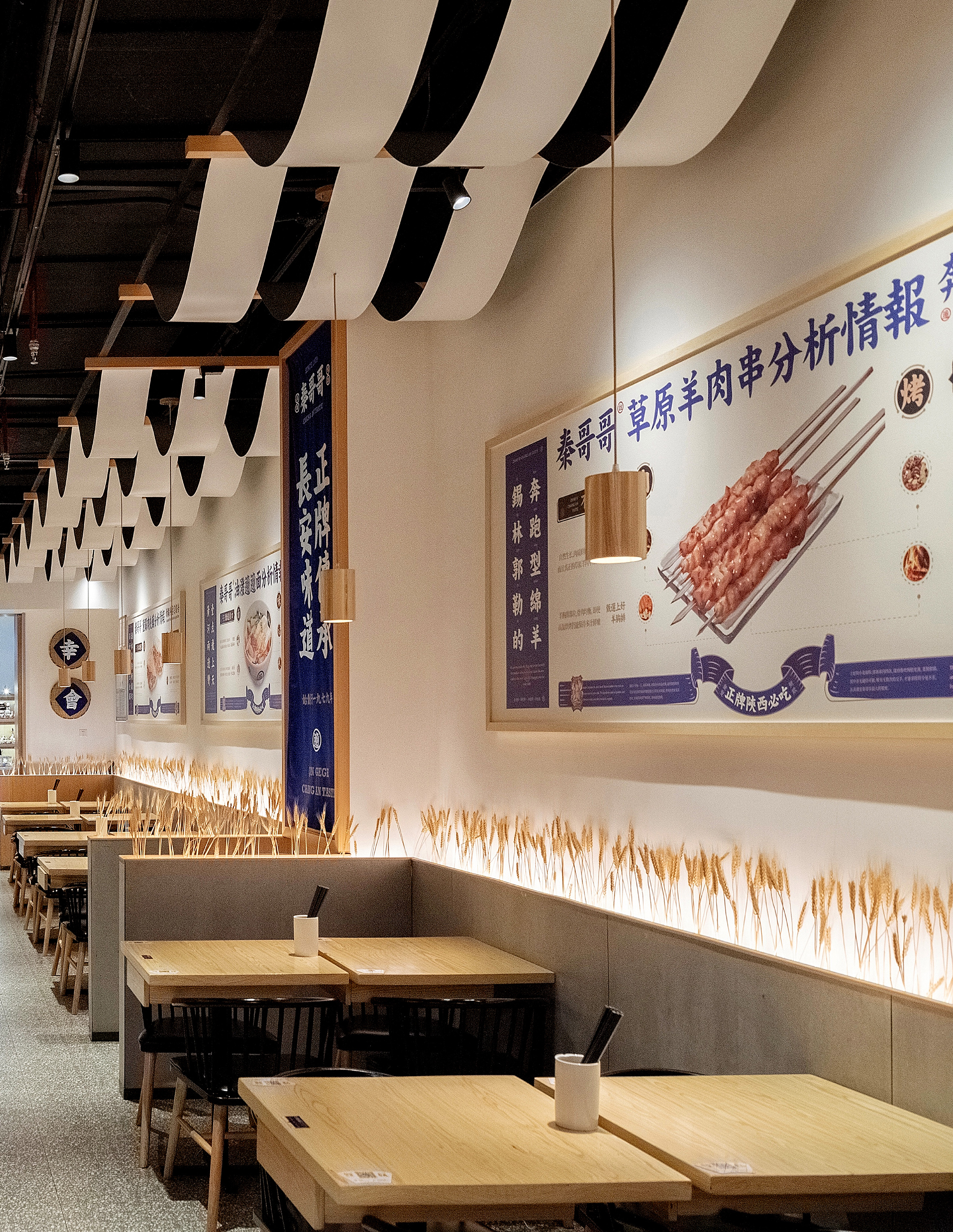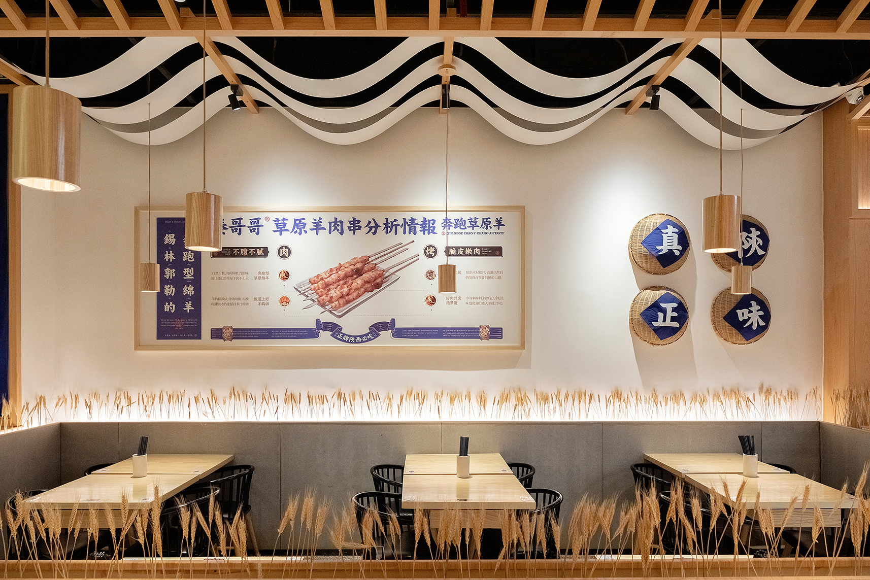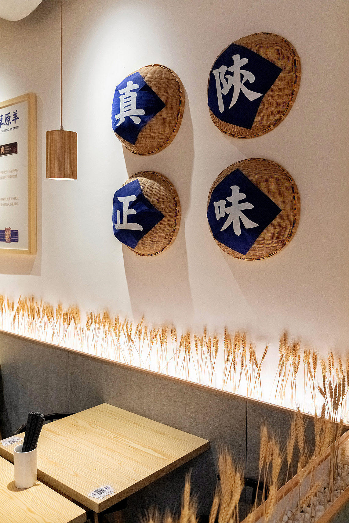把当地装配料的簸箕挂在墙上再贴上几个大大的纸字,围着墙裙还插了一乔的麦穗,很接受地气但又不会显得廉价感,相反给人还有种亲近自然的感觉;