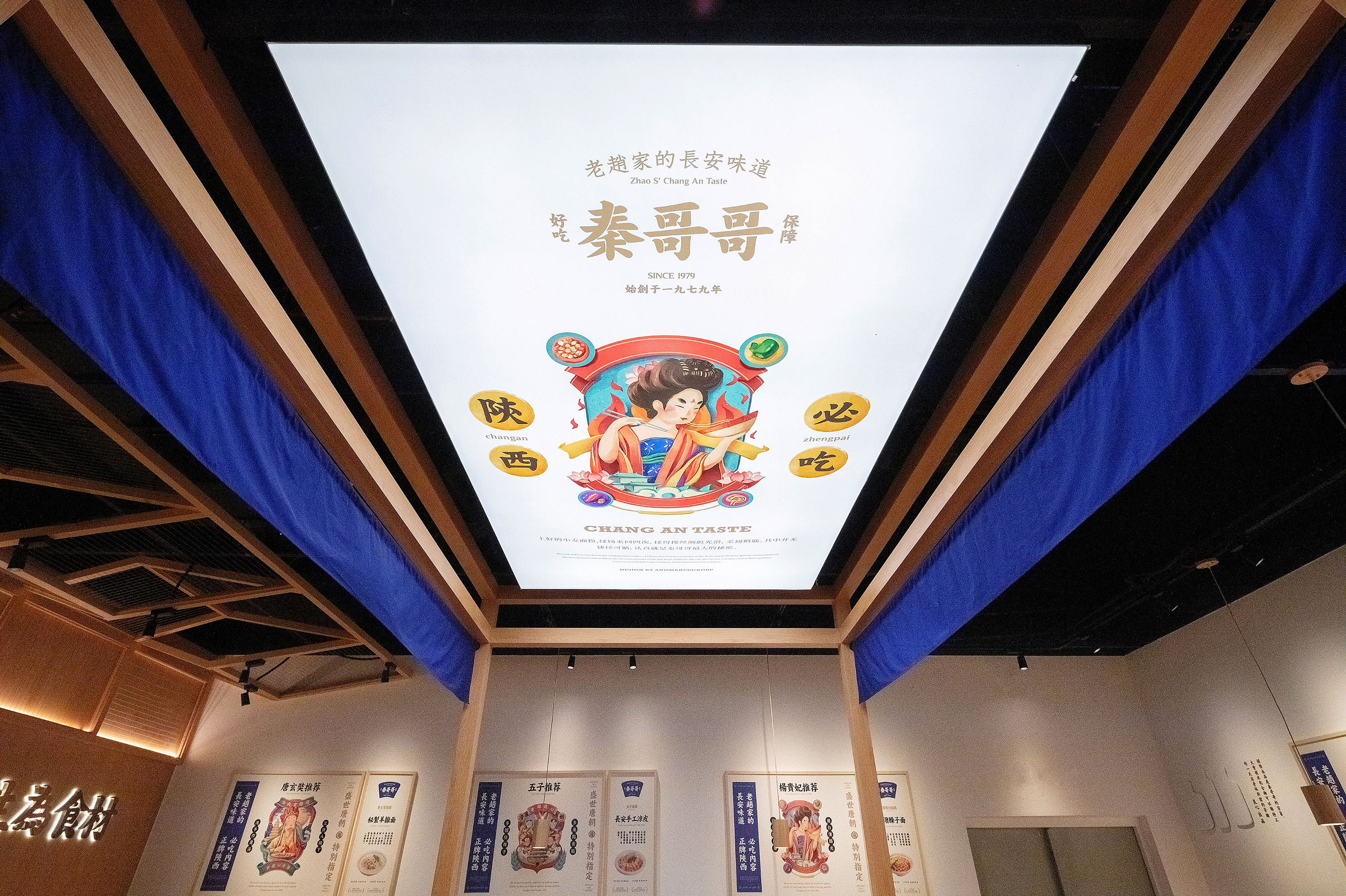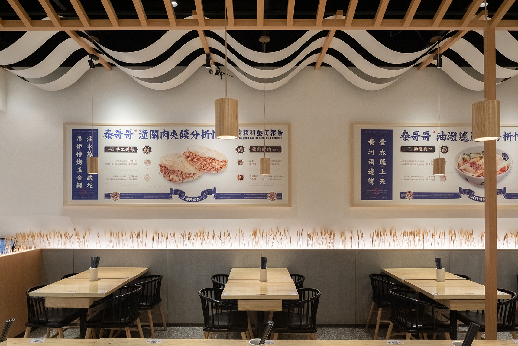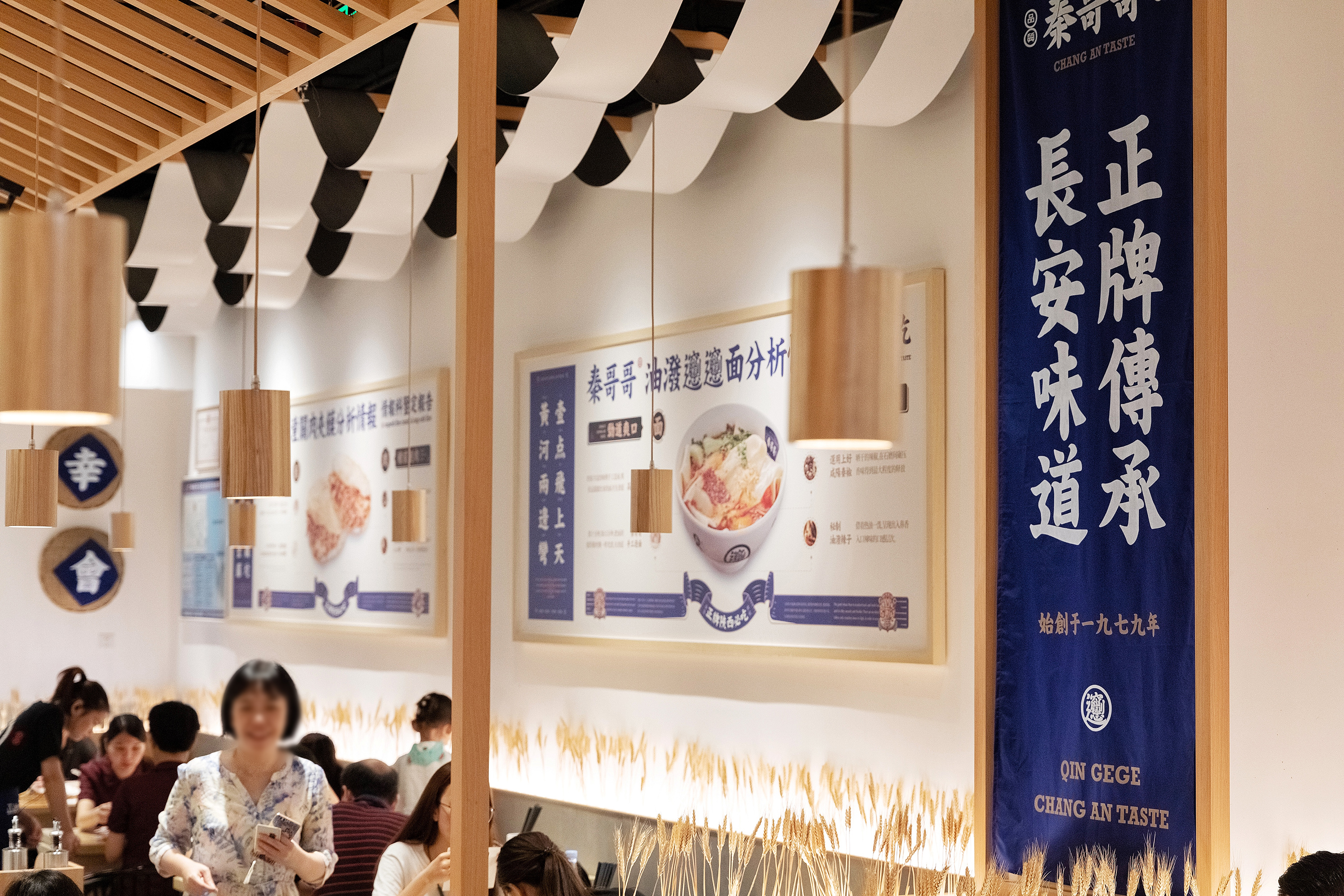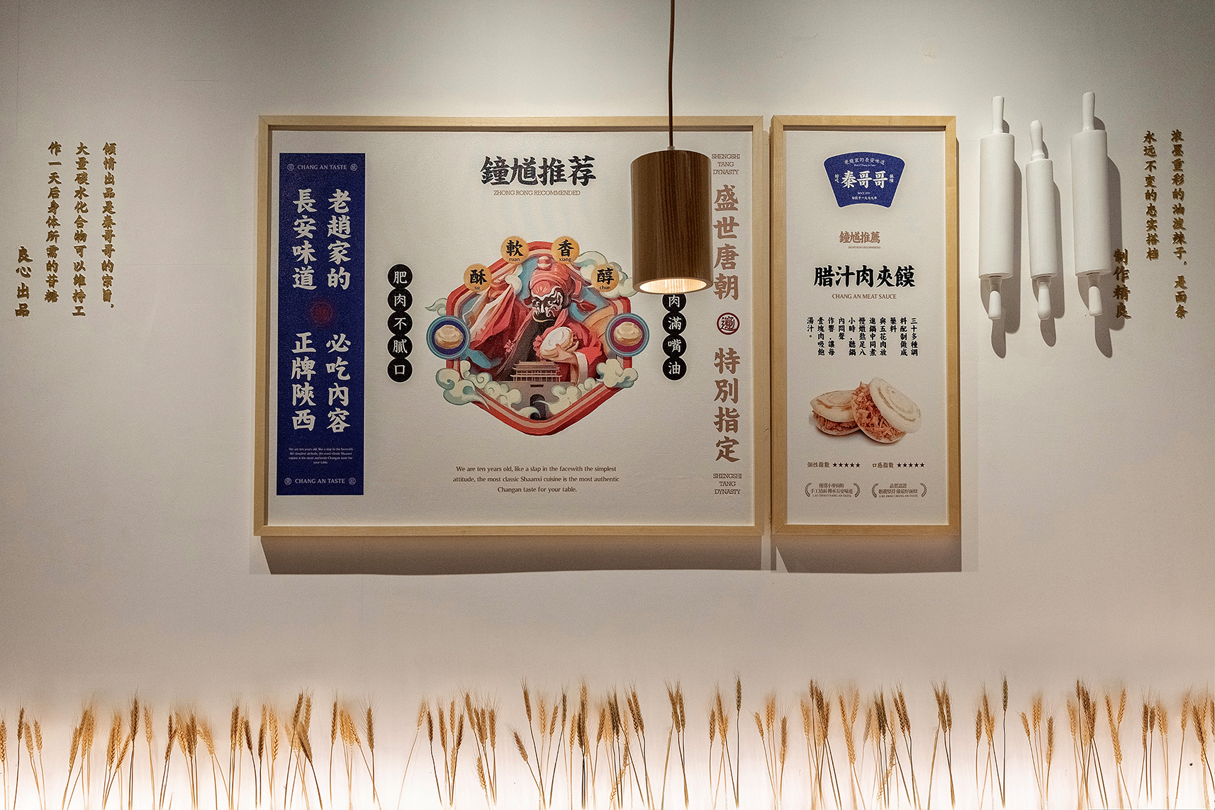 餐厅最核心的是什么?是产品,对于在广州CBD的首店,首先得让顾客知道你是吃什么的,所以我们把长安味道的几款主要产品设计成挂画的形式放在墙面上,第一起到传播作用,第二解决了顾客点餐的困难症,我只需要点餐厅推荐的爆品,错不了;