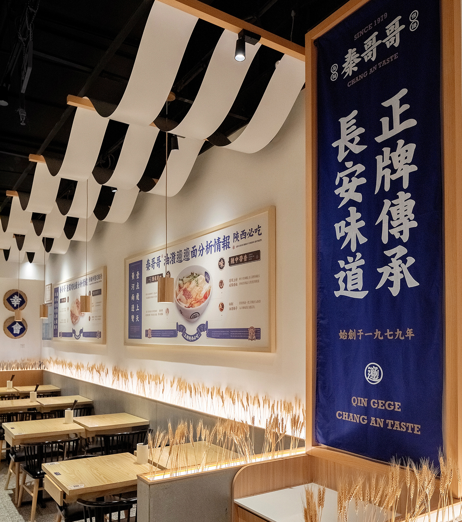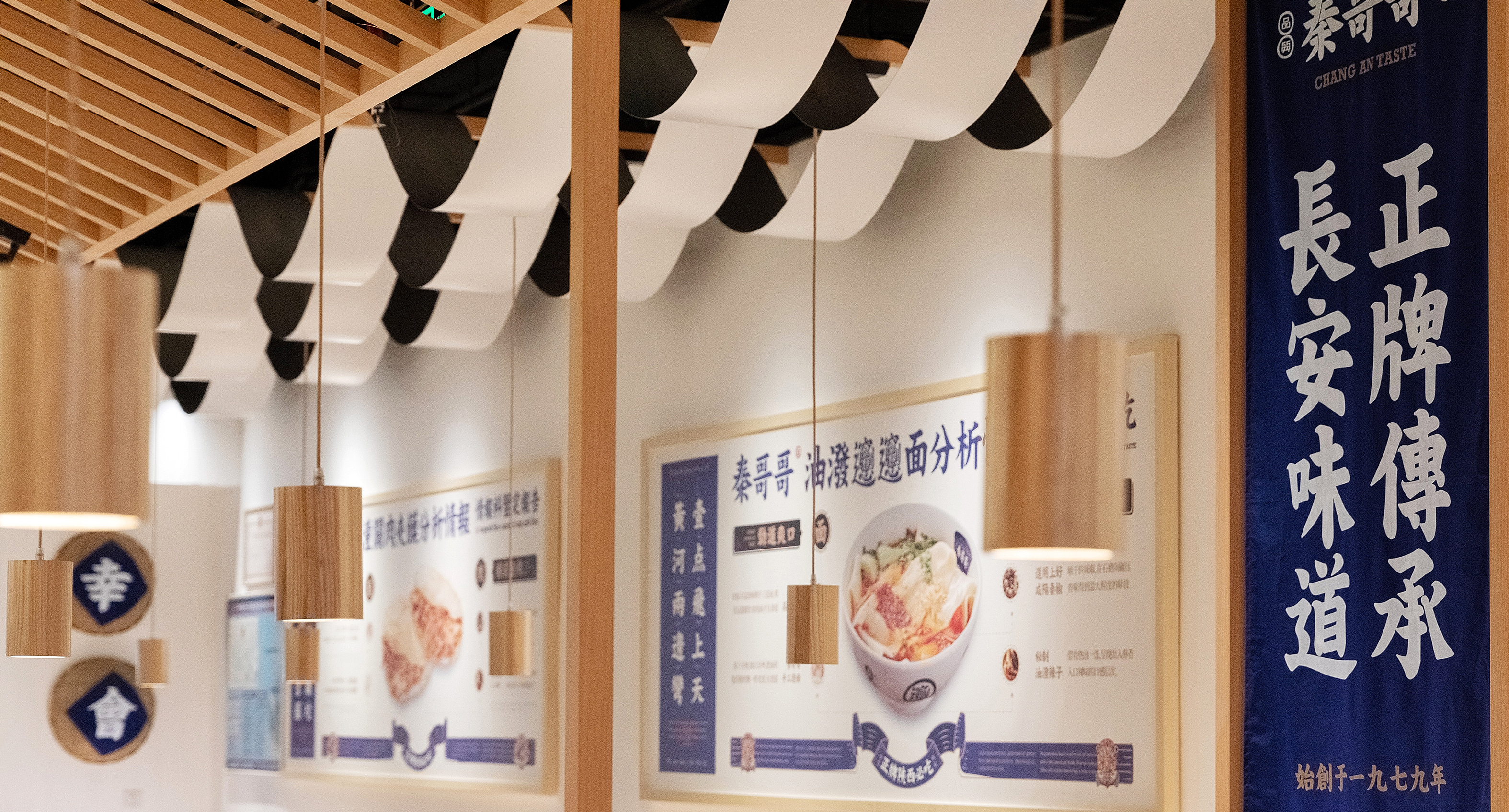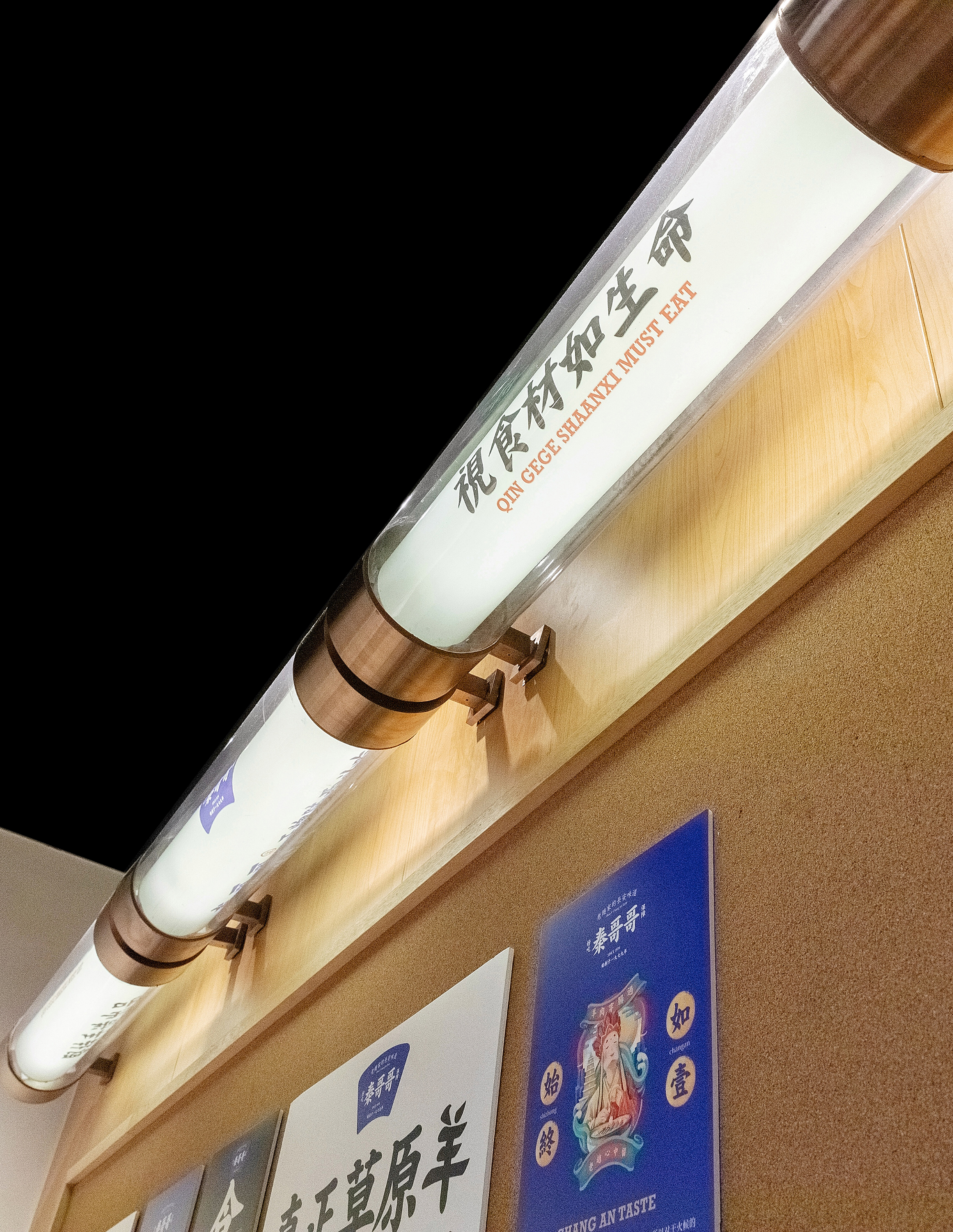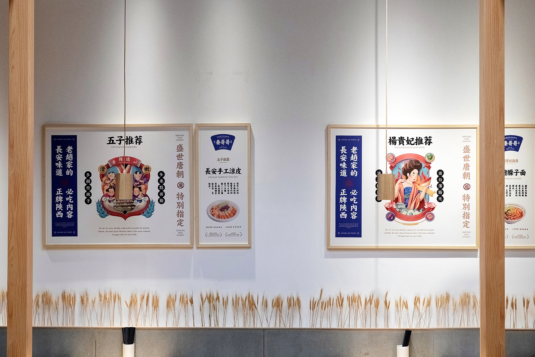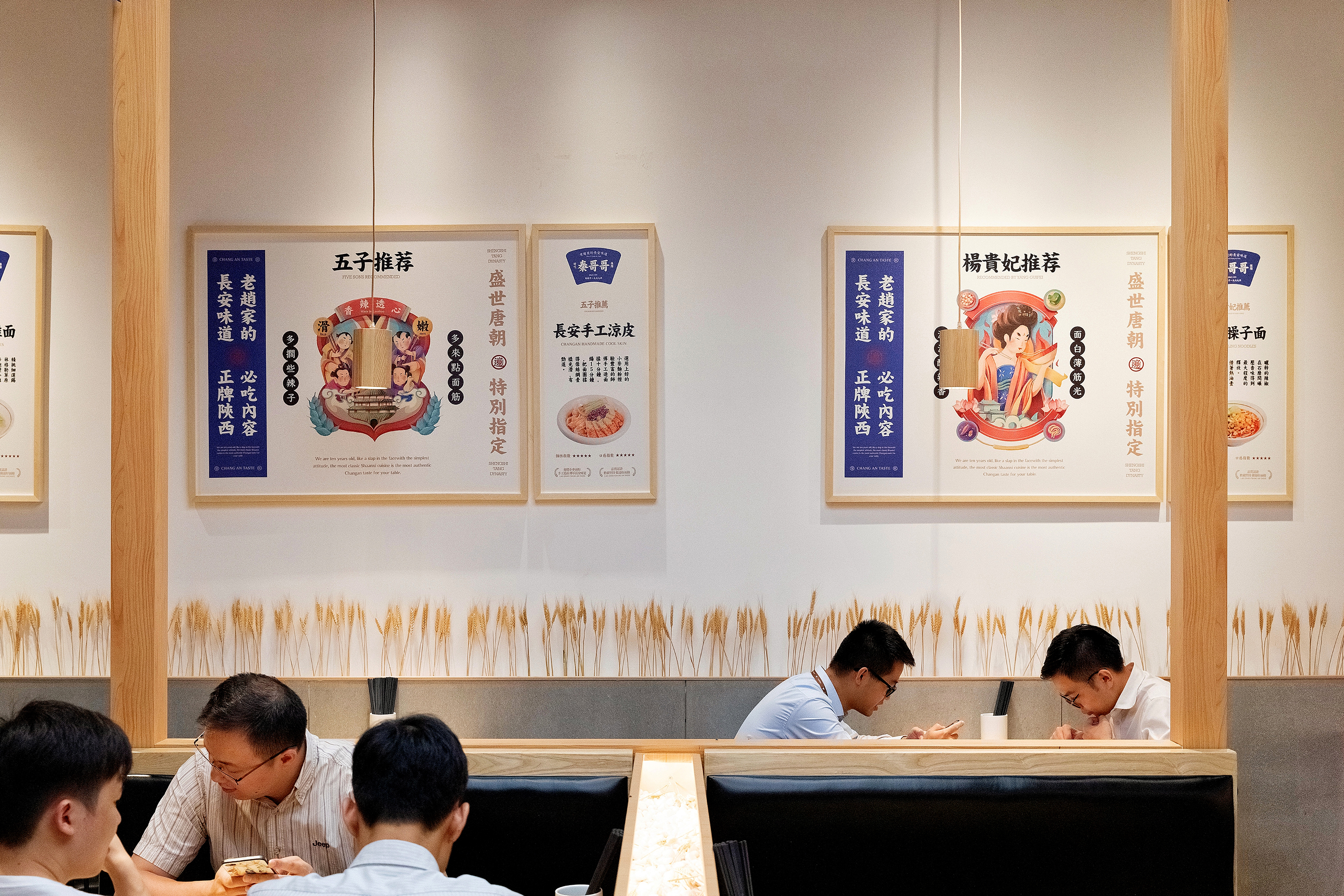 餐厅最核心的是什么?是产品,对于在广州CBD的首店,首先得让顾客知道你是吃什么的,所以我们把长安味道的几款主要产品设计成挂画的形式放在墙面上,第一起到传播作用,第二解决了顾客点餐的困难症,我只需要点餐厅推荐的爆品,错不了;