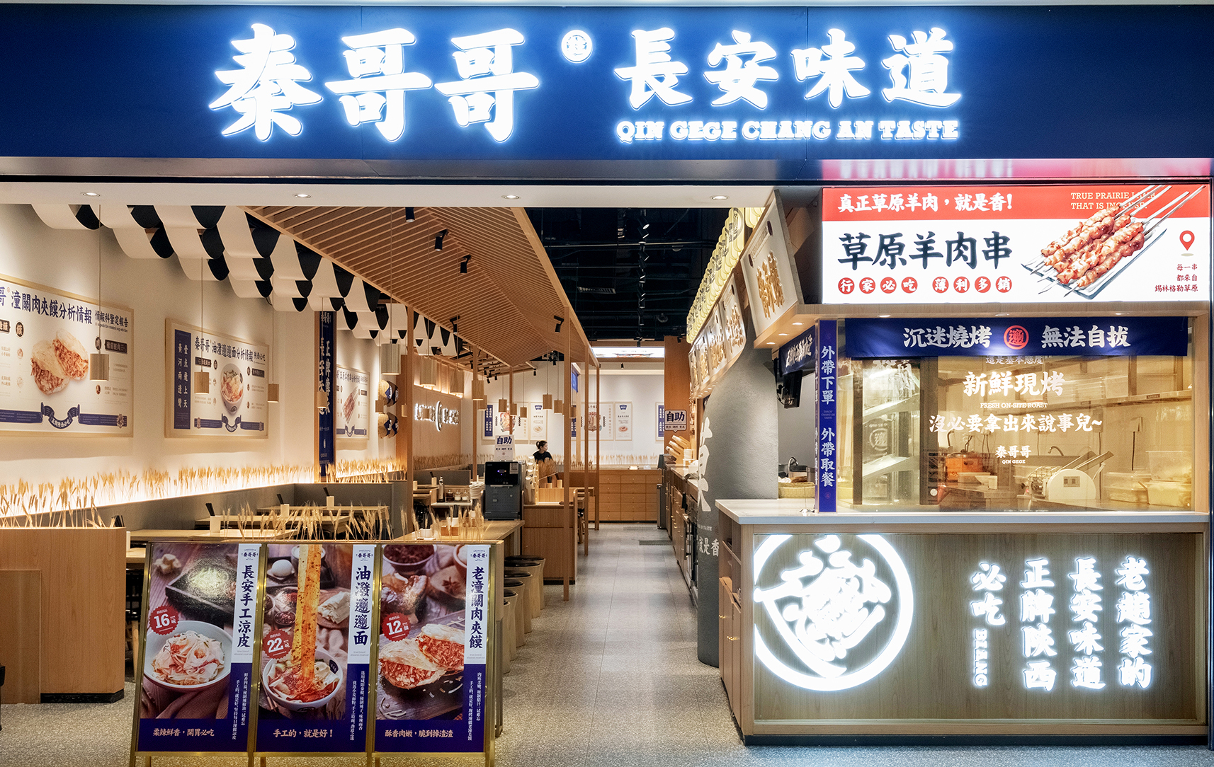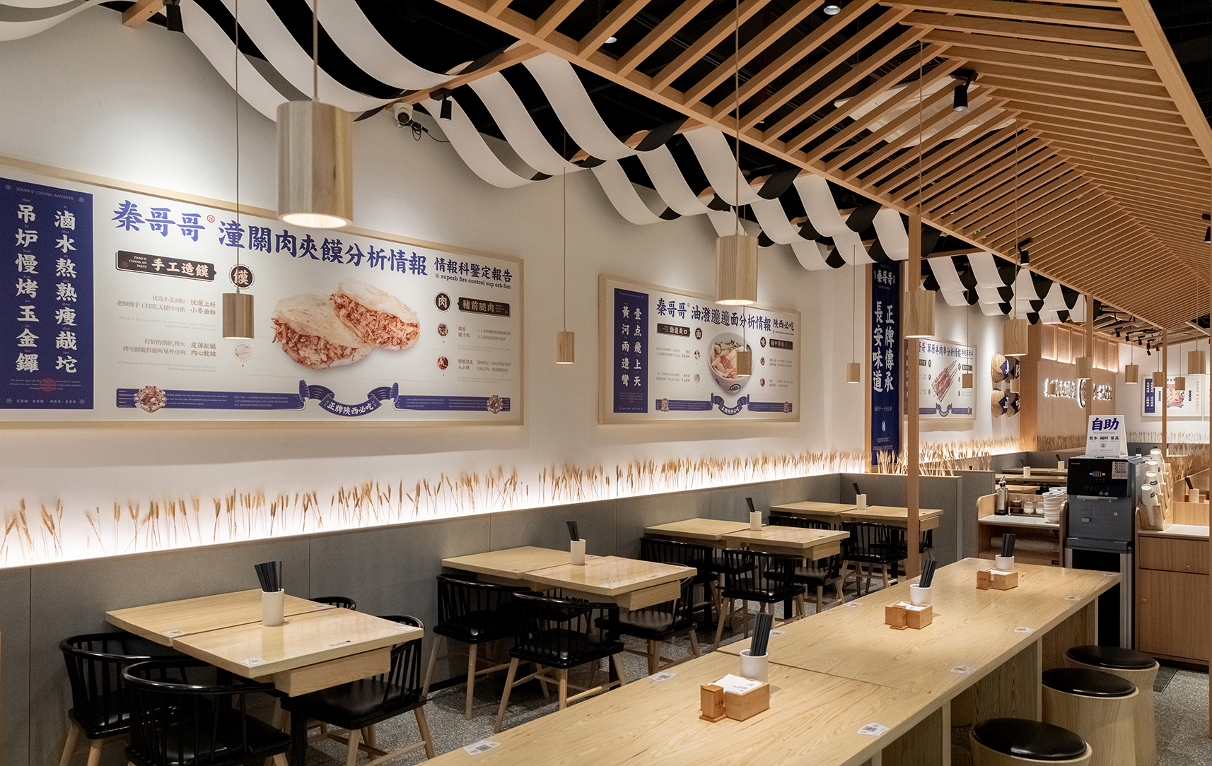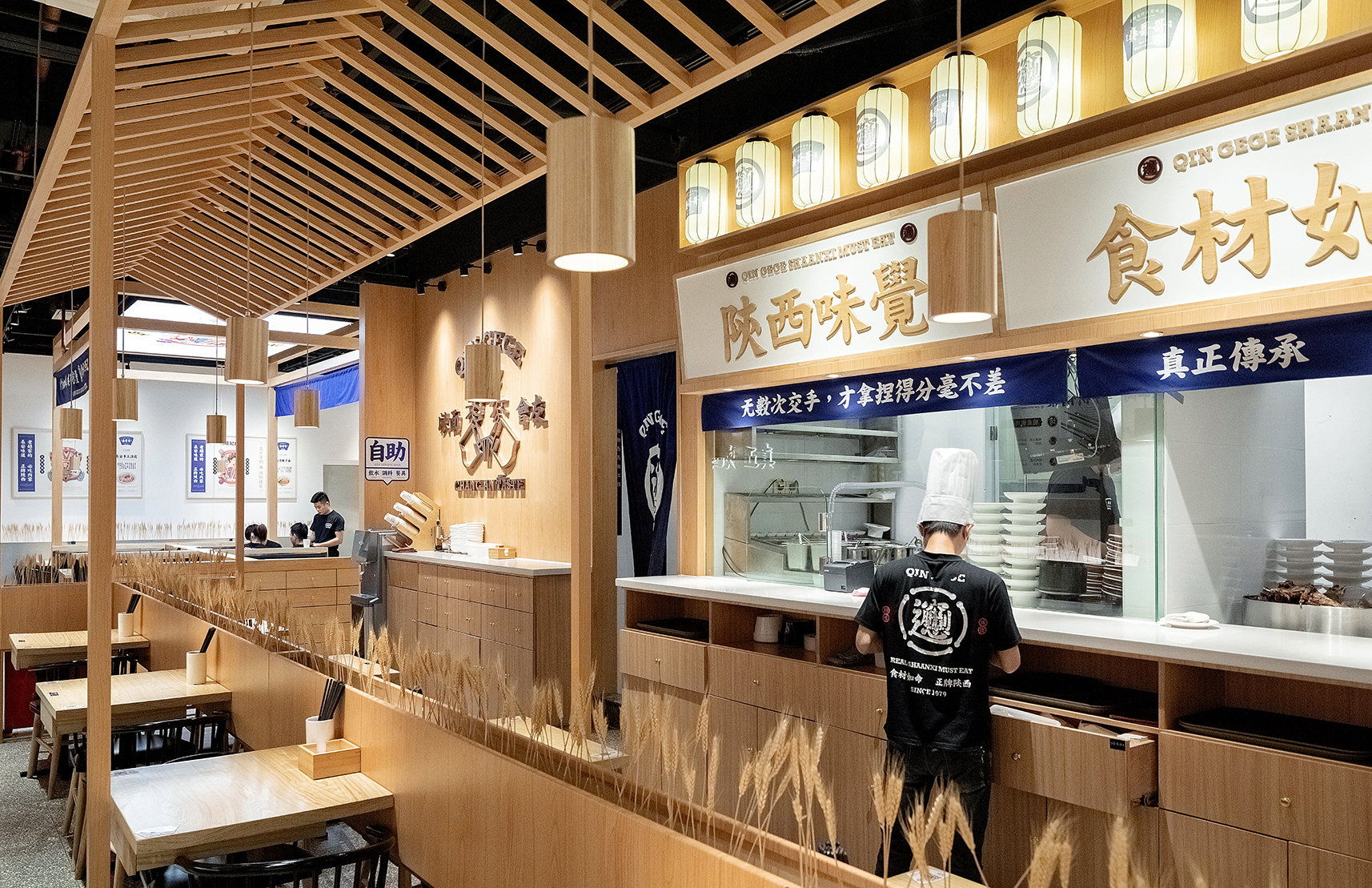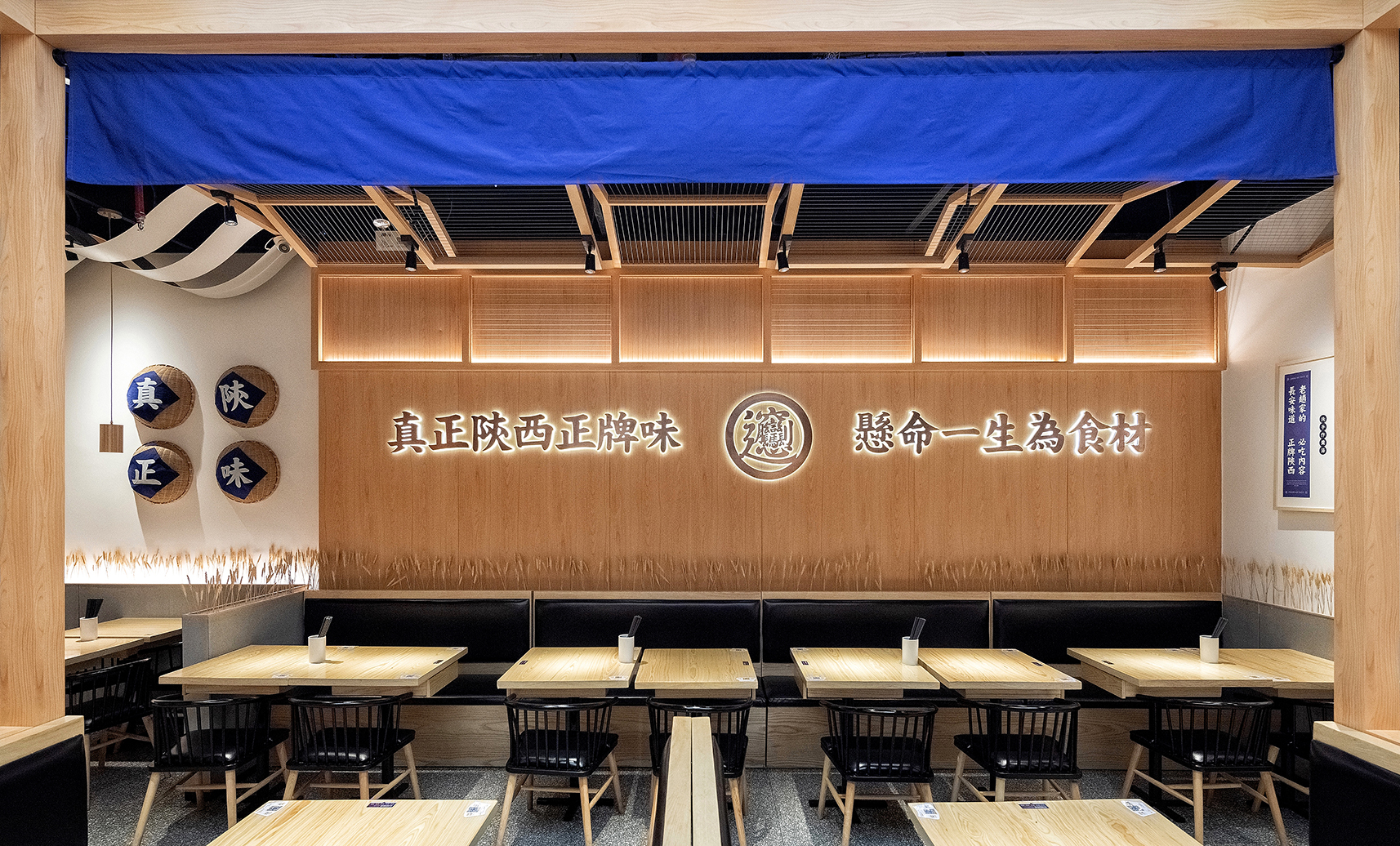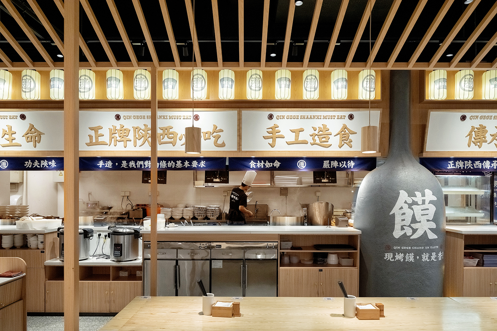 开放式明档设计,中间一个大大的馍缸,做为装置,也是产品的一部分,明档上方的牌匾和灯笼增加了整个明档的氛围感;