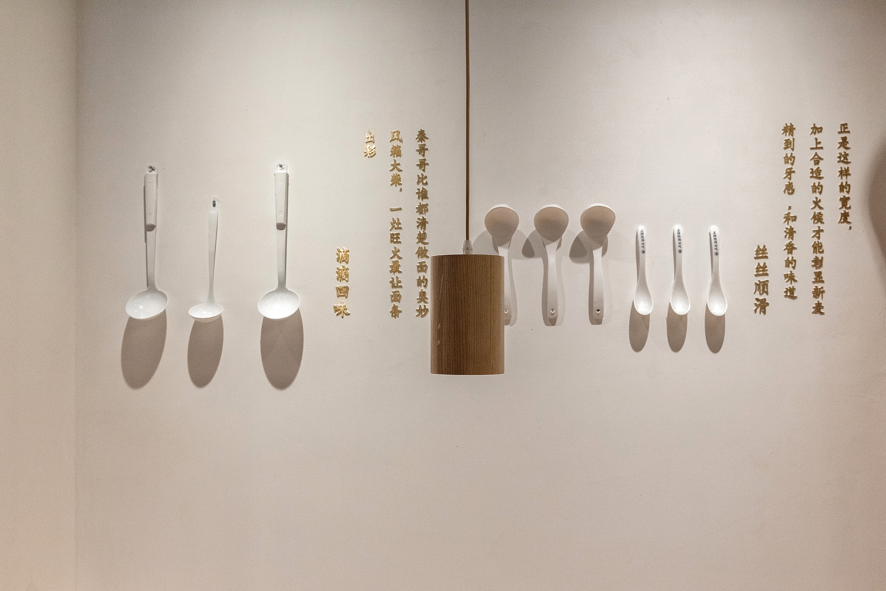 个别墙面上我们把做面吃面的各种器具挂在墙上,边上加上一些小小的金属字,其实生活也是可以过的很精致的;