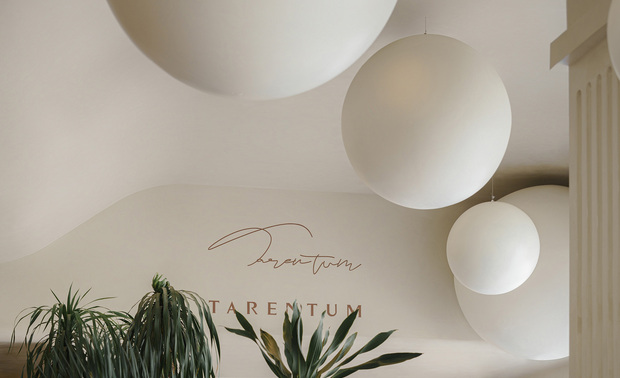 餐厅的后区我们设计了一个中岛半围合空间,上方一个发光的拉膜天花,给空间的后部做了一个聚焦点
