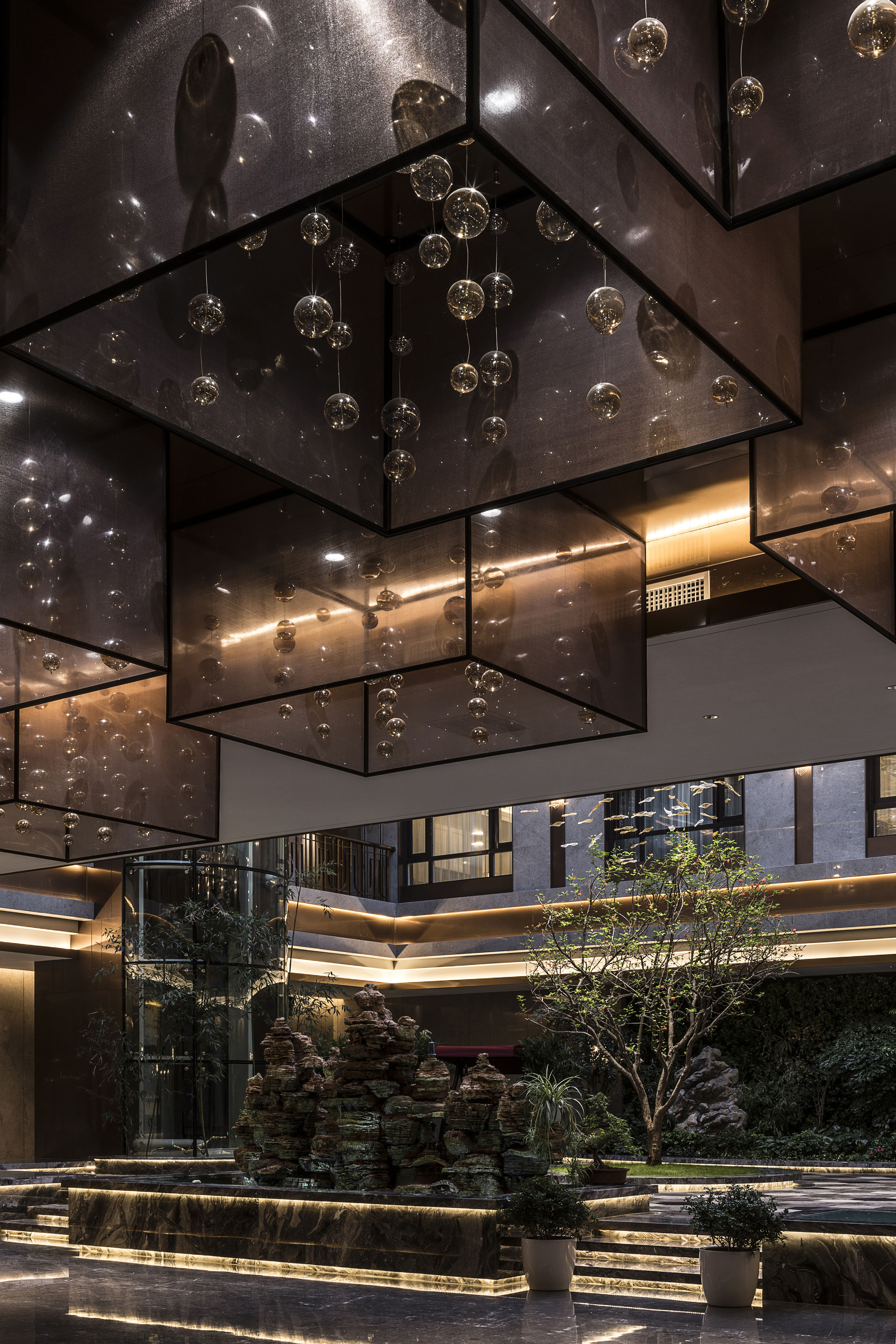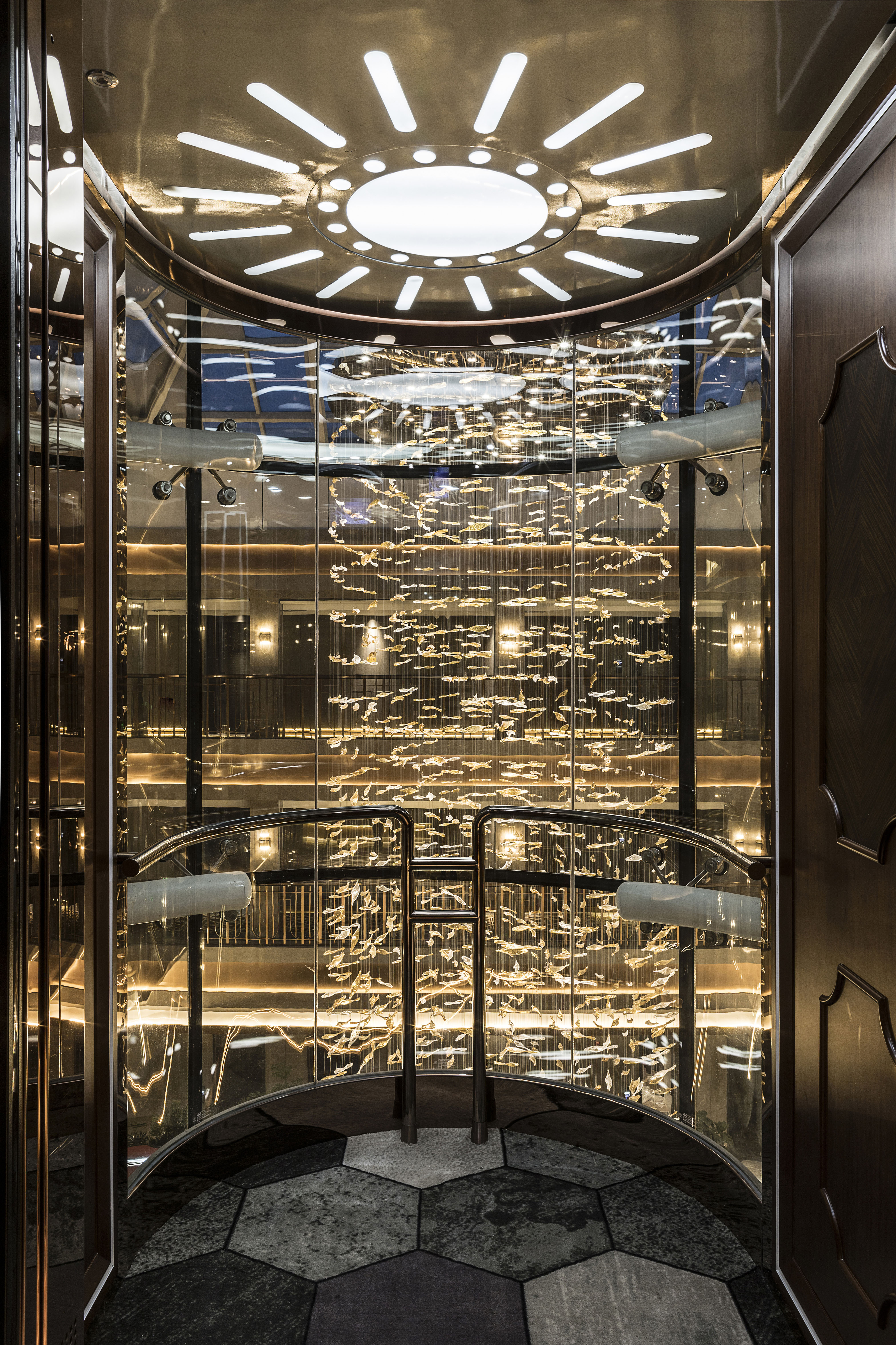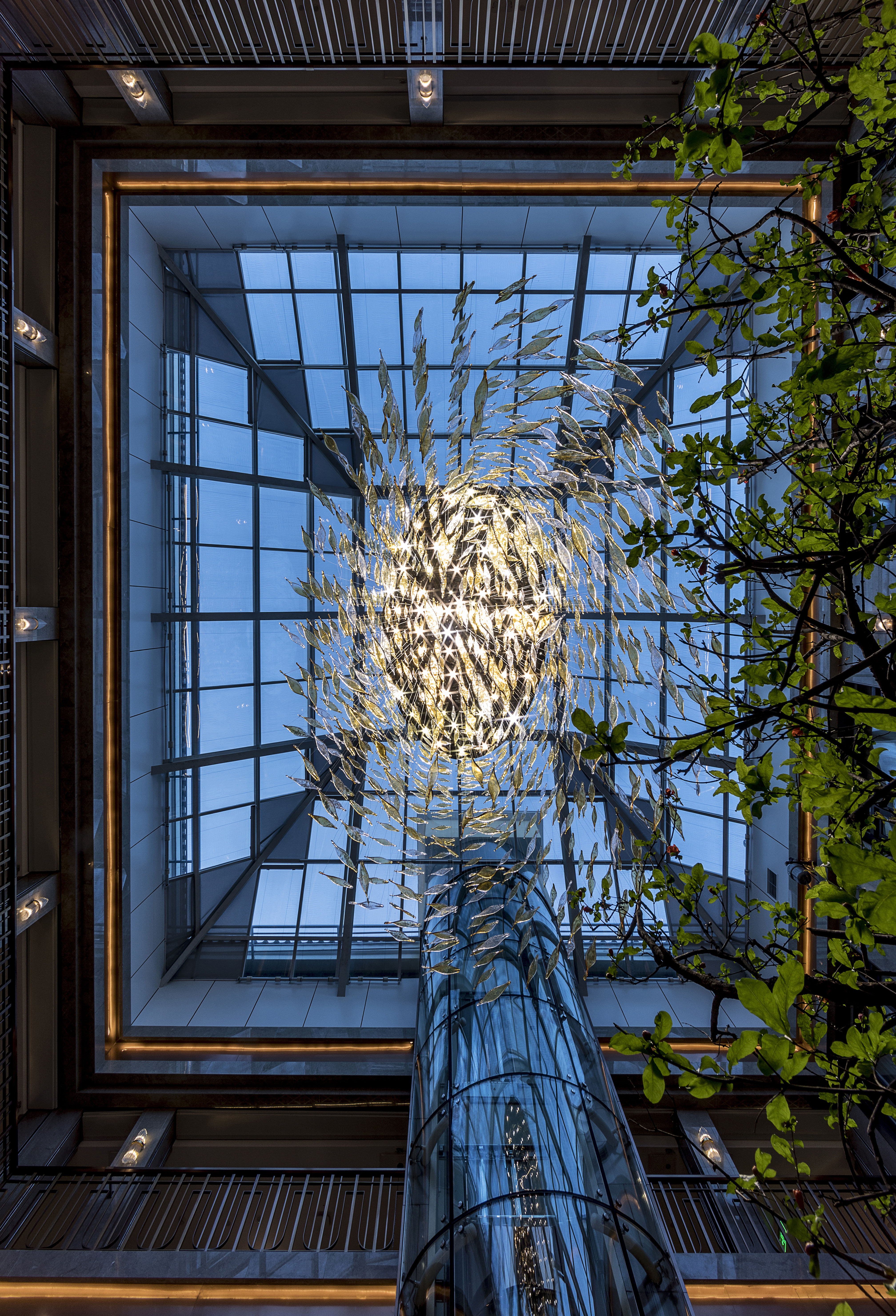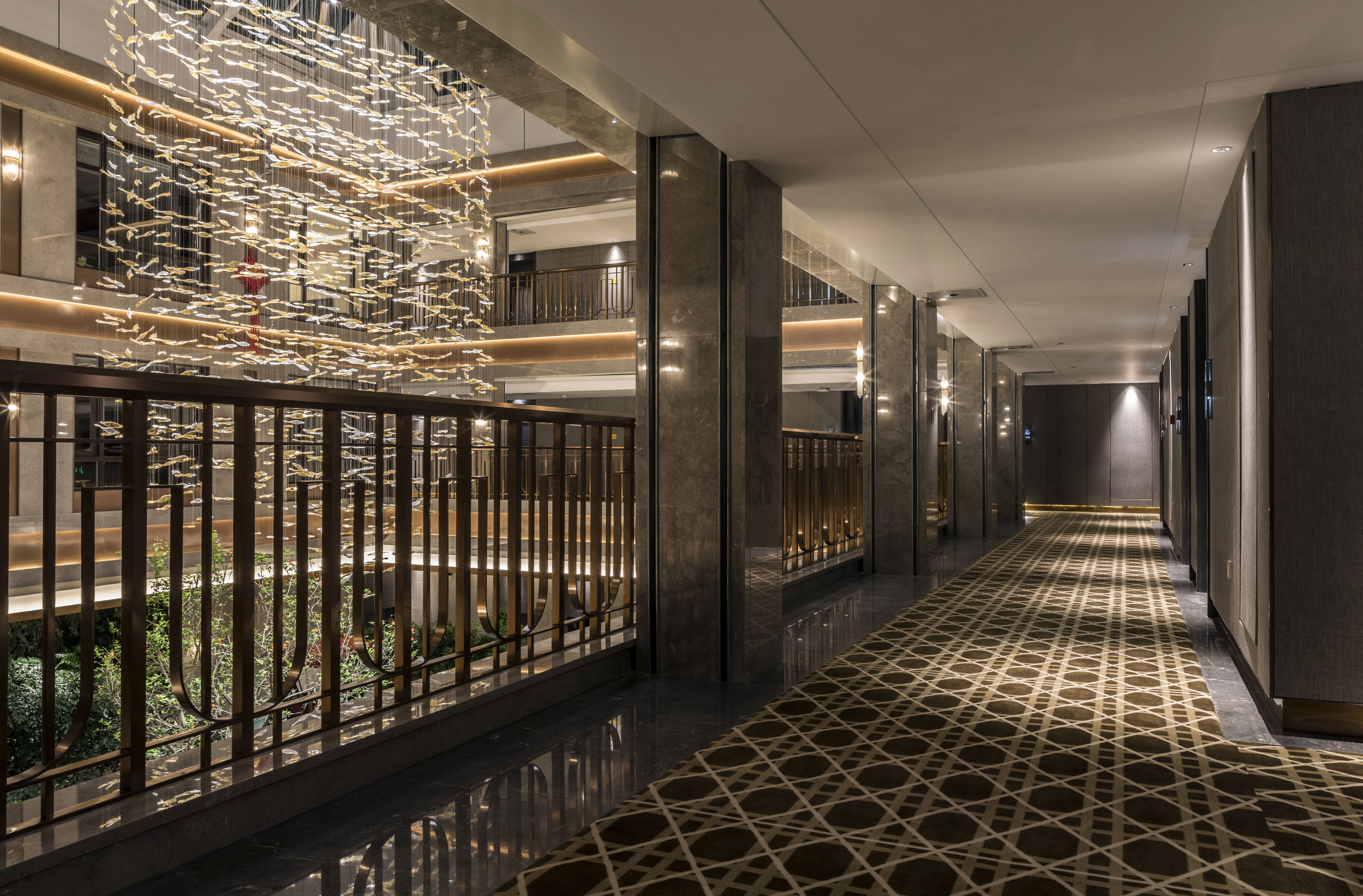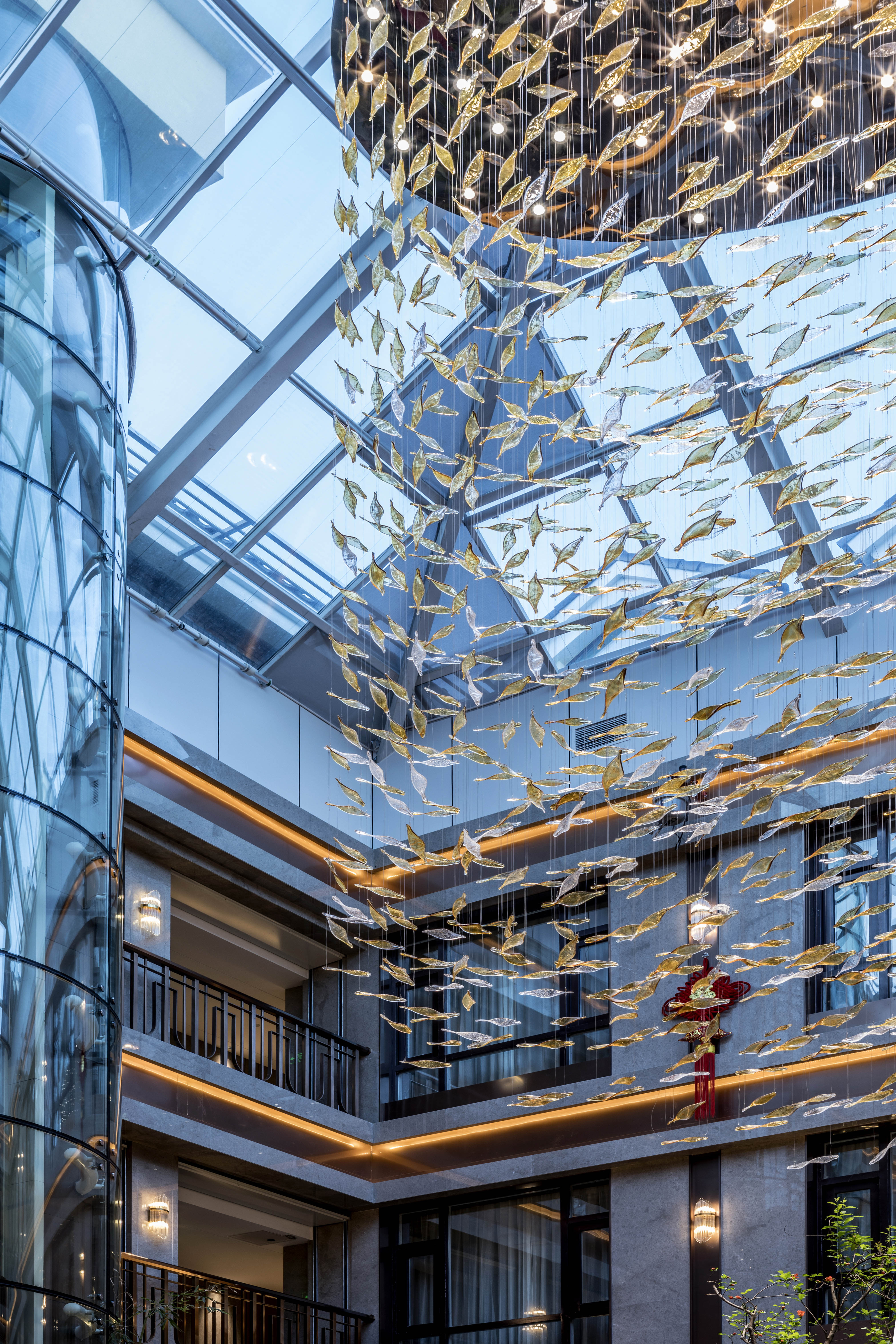空间布局:酒店中庭的设计是体现长白山自然文化最为凸显的部分。中庭挑空的围合式布局,全透明阳光屋顶是建筑原有的设计格局,设计师善用这种固有格局加以改造,让其成为引入自然天光的媒介,自然的将长白山的蓝天、白云、星空进入酒店,客人在酒店内便可轻易仰望苍穹,观尽云海。如果说通透的中庭设计完成了酒店隐于自然,融合于自然的设计概念,那么贯穿于酒店中庭上下的金属艺术装置则是体现长白山文化的艺术化符号