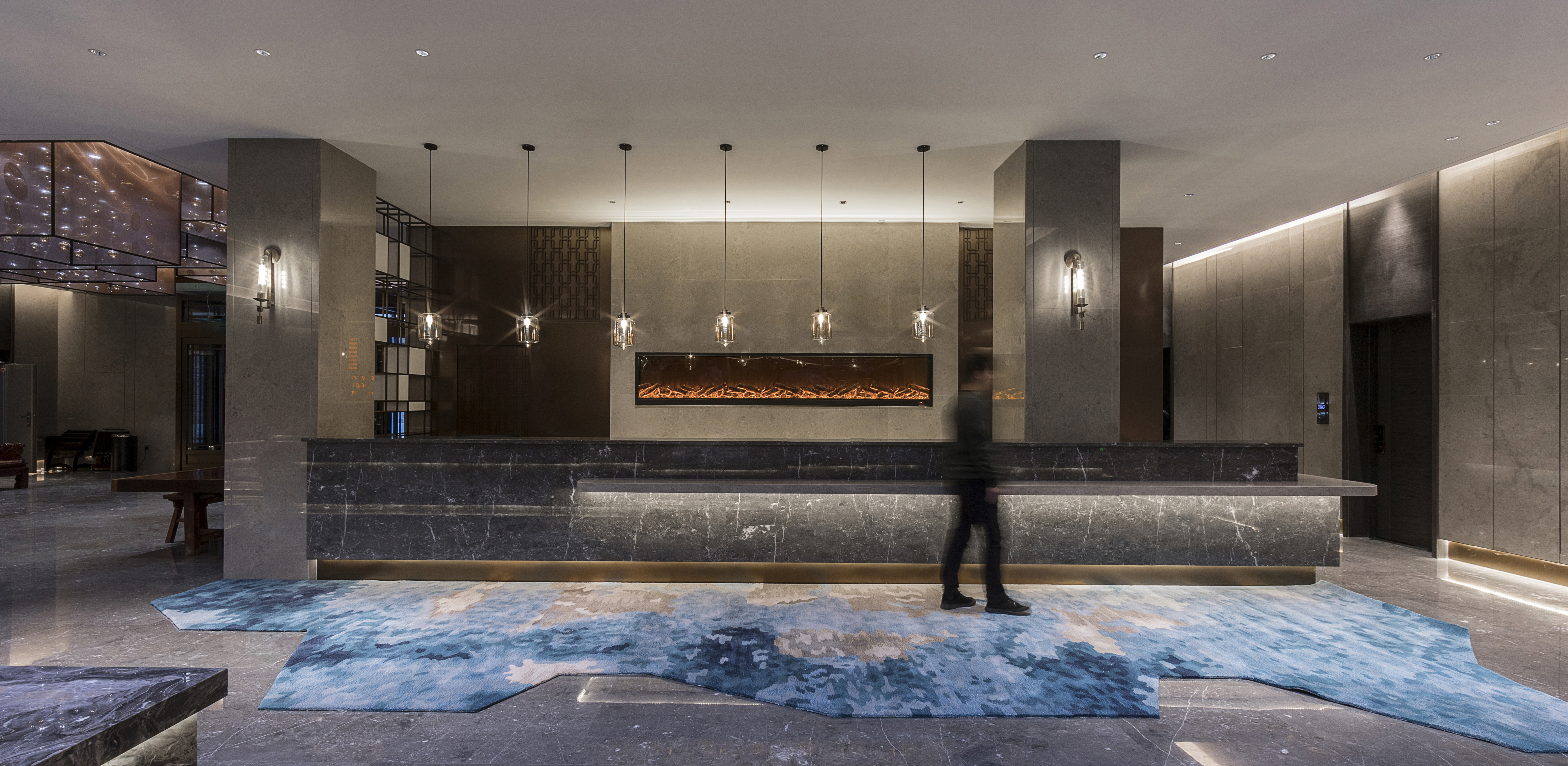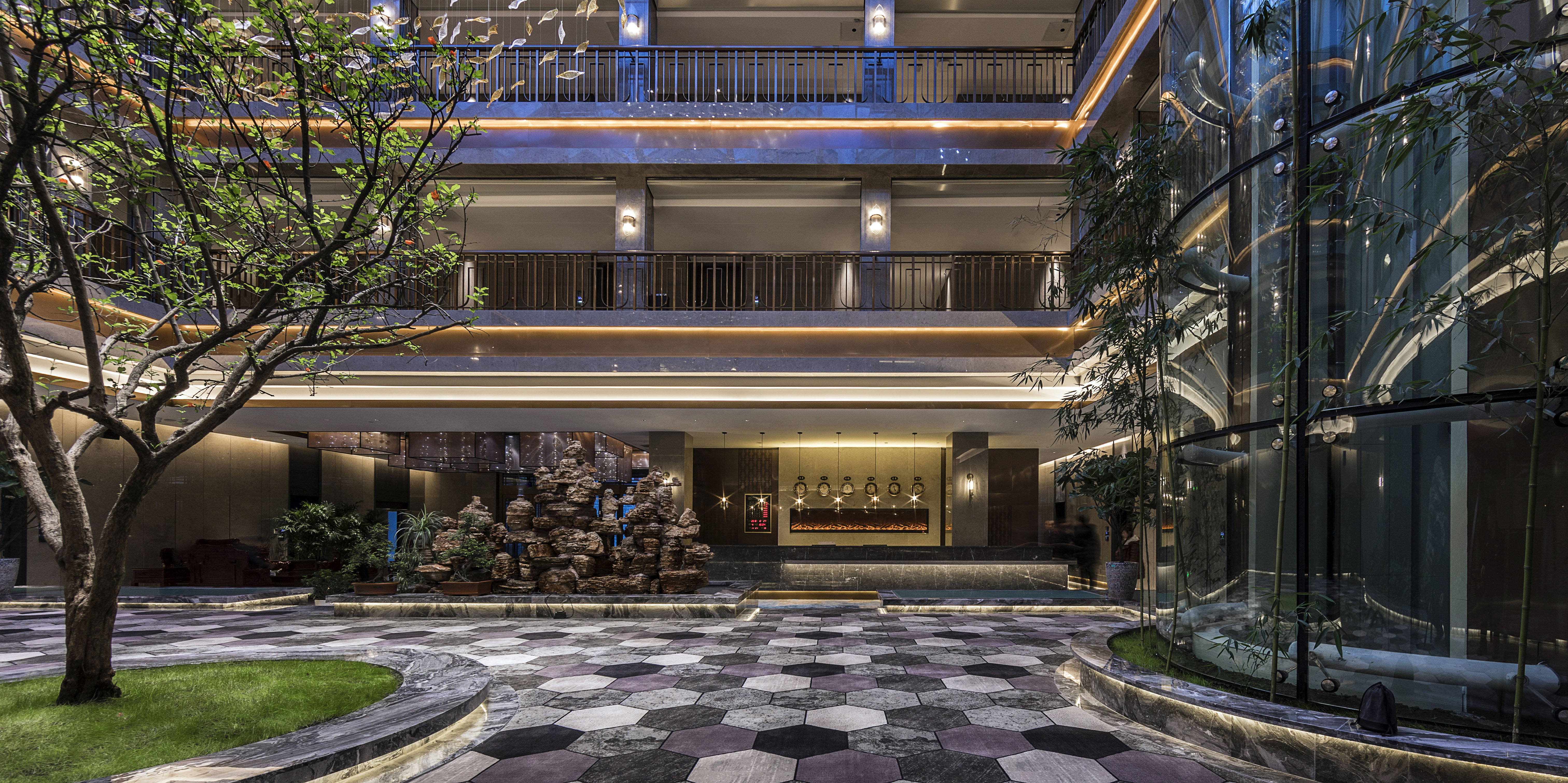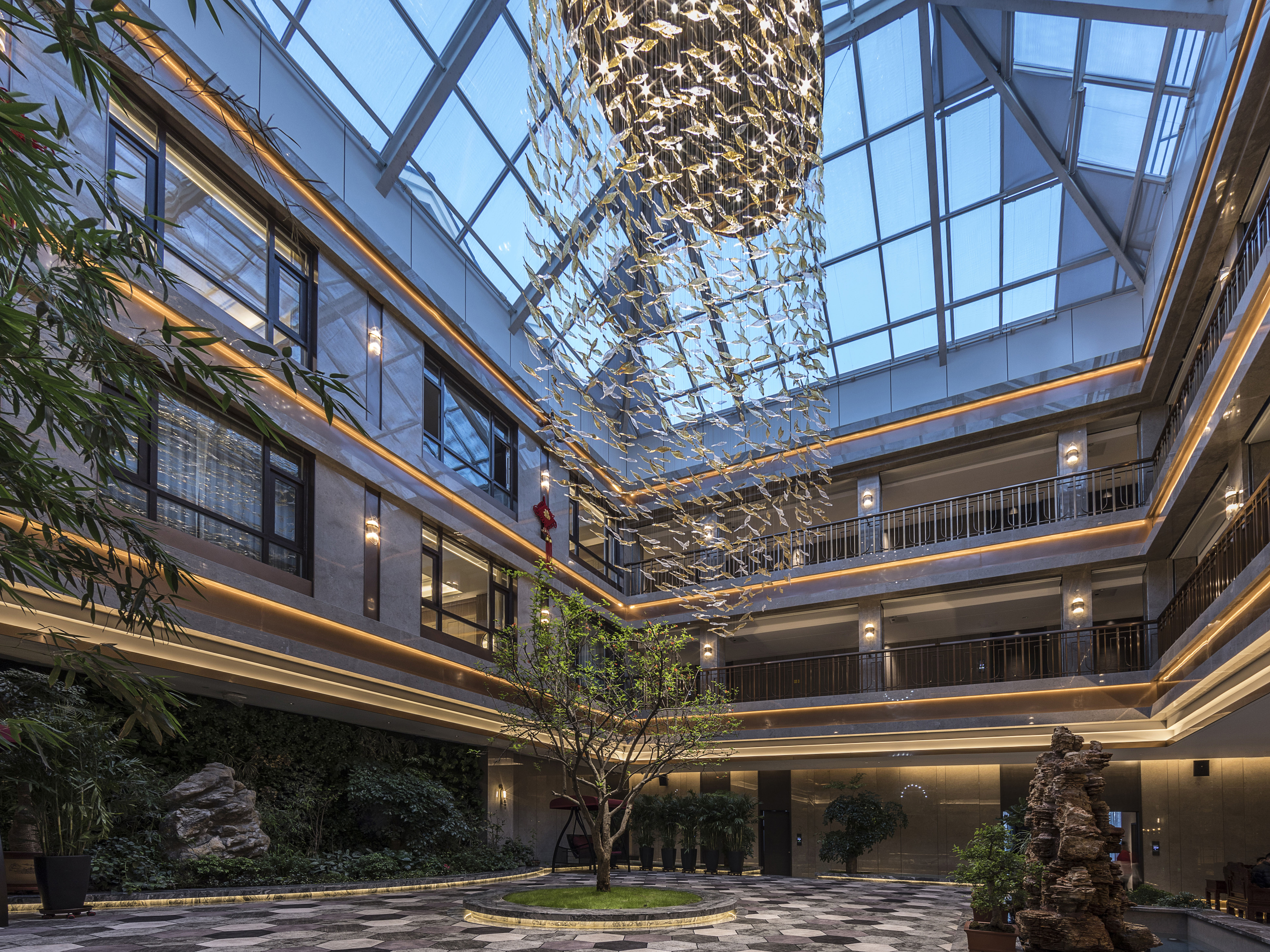 设计选材:在材质上选择了天然的石材及木材,如果说通透的中庭设计完成了酒店隐于自然,融合于自然的设计概念,那么贯穿于酒店中庭上下的金属艺术装置则是体现长白山文化的艺术化符号。这个艺术装置以长白山自然符号之一的白桦树为原型,用时尚的金属材质表现白桦叶的形态,将具化的自然物质抽象化,解构成地区符号,用现代的设计语言解读长白山特色。