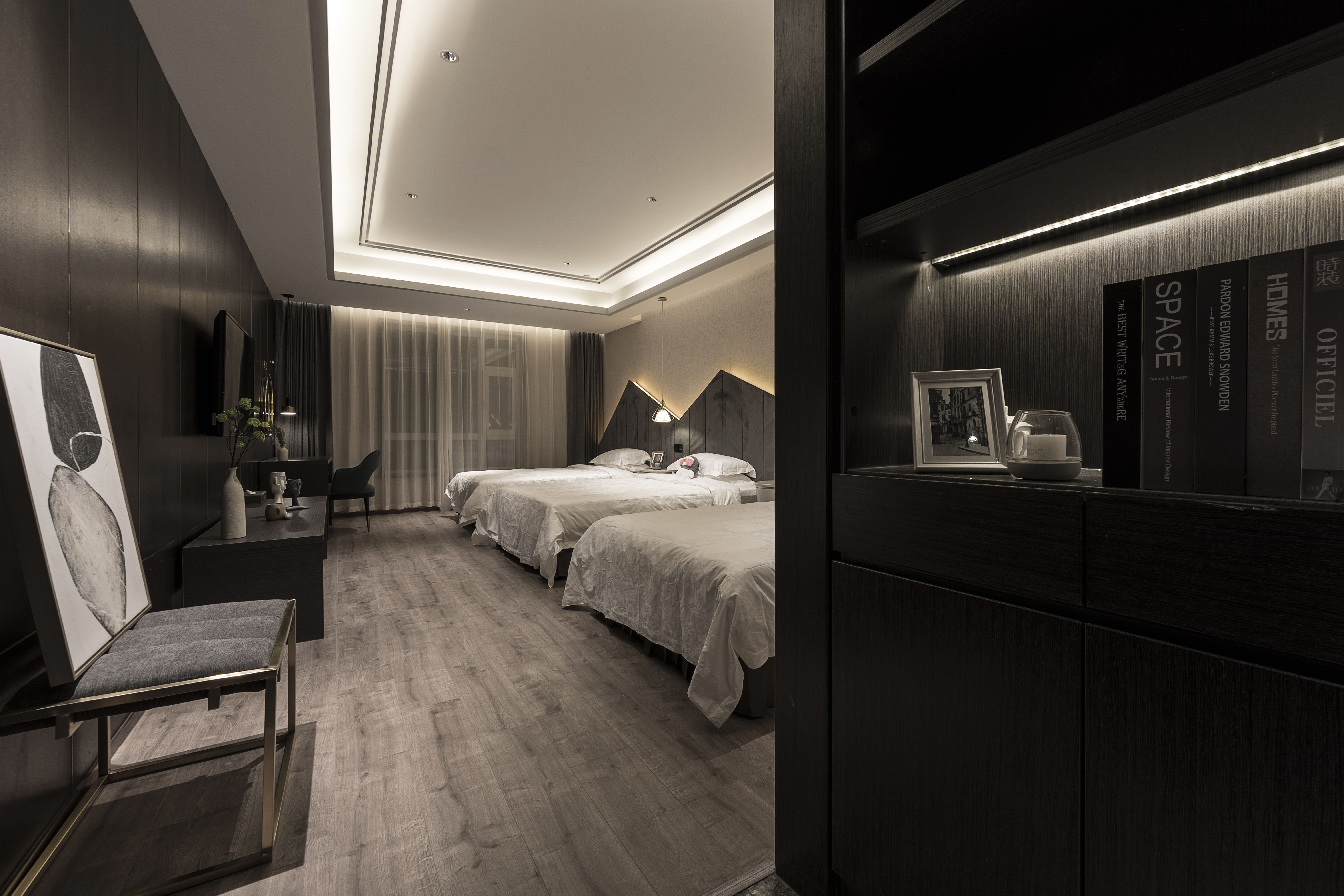 空间意境:用现代设计语言讲述长白山的千年过往,设计师对长白山自然景观的深度理解和浪漫解读,炮制出那隐居花海旁,“未闻花名,但识花香”的“花舍“情结。酒店内米咖结合的黑白灰金属基调,带给入住客人的第一感觉是现代与时尚,酒店房型以大小、功能、房间朝向、面向景观等细致划分,为不同需求、不同年龄、不同背景的顾客提供最适合他们的居住体验。