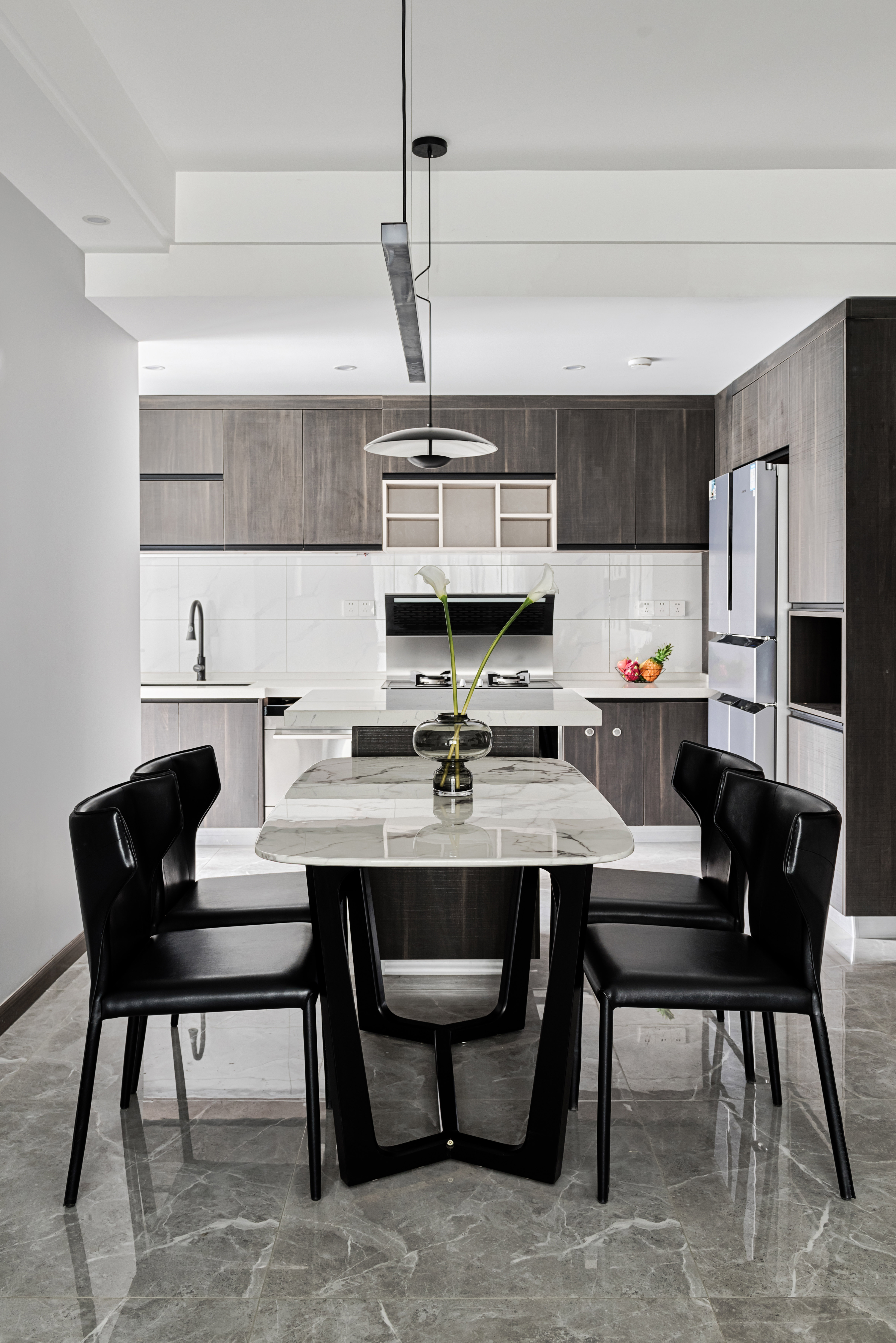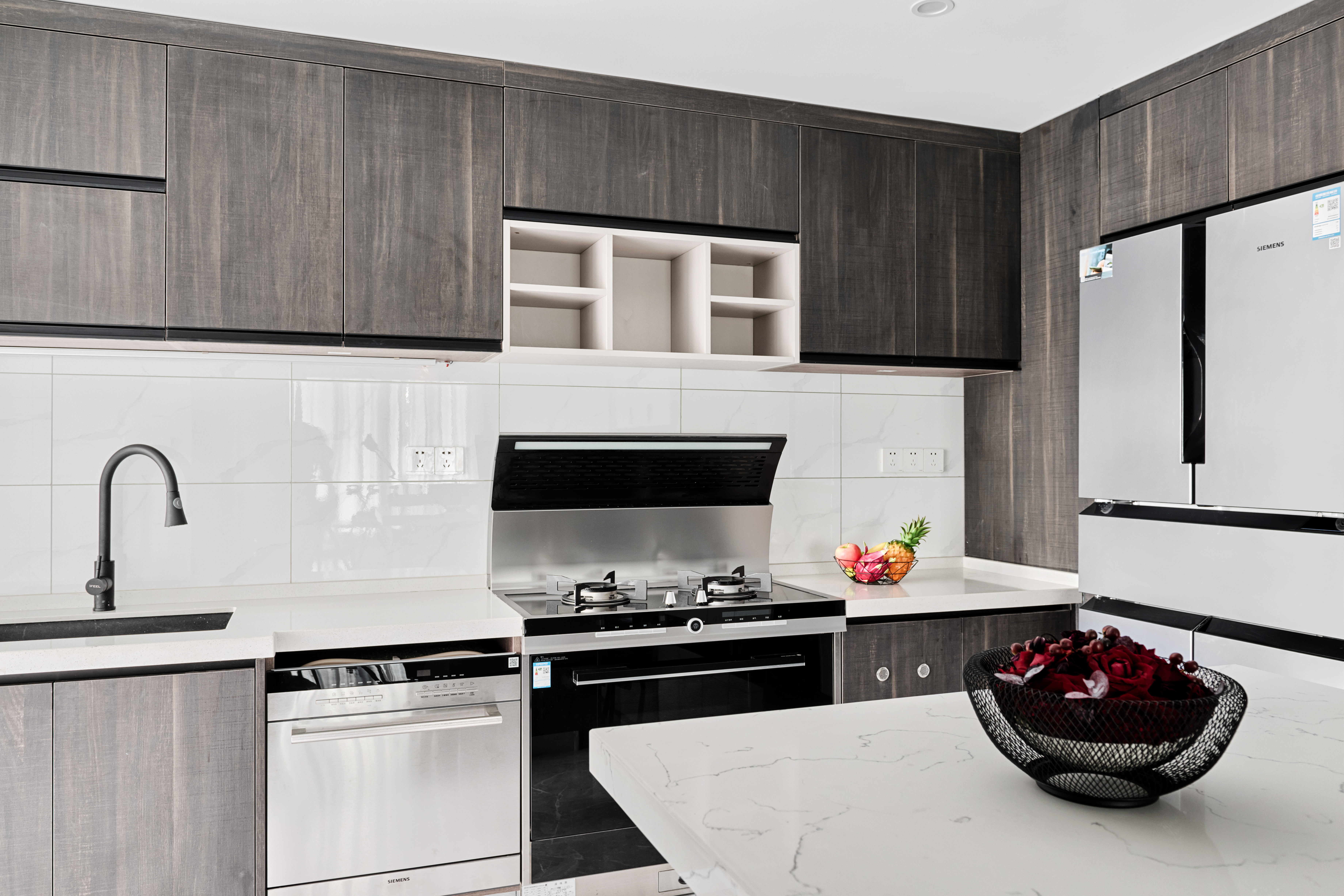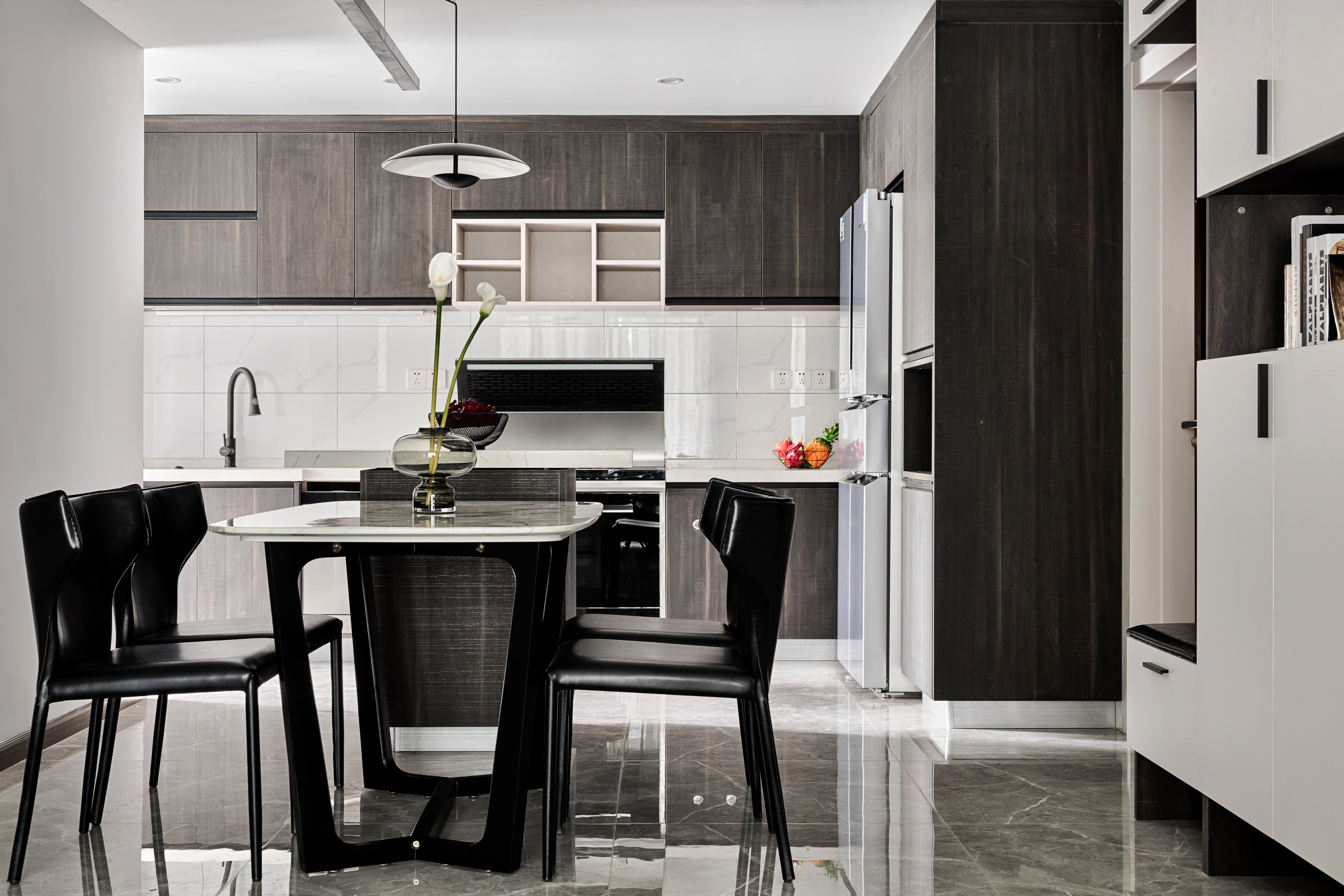 开放式的厨房质感至上。原本狭长的厨房被打通得到了释放,暗木色的橱柜平衡了空间的冷暖,颜色搭配舒适耐看,强大的储物功能让整个空间变得干净整洁,增加了岛台区域,中西厨皆可同时进行