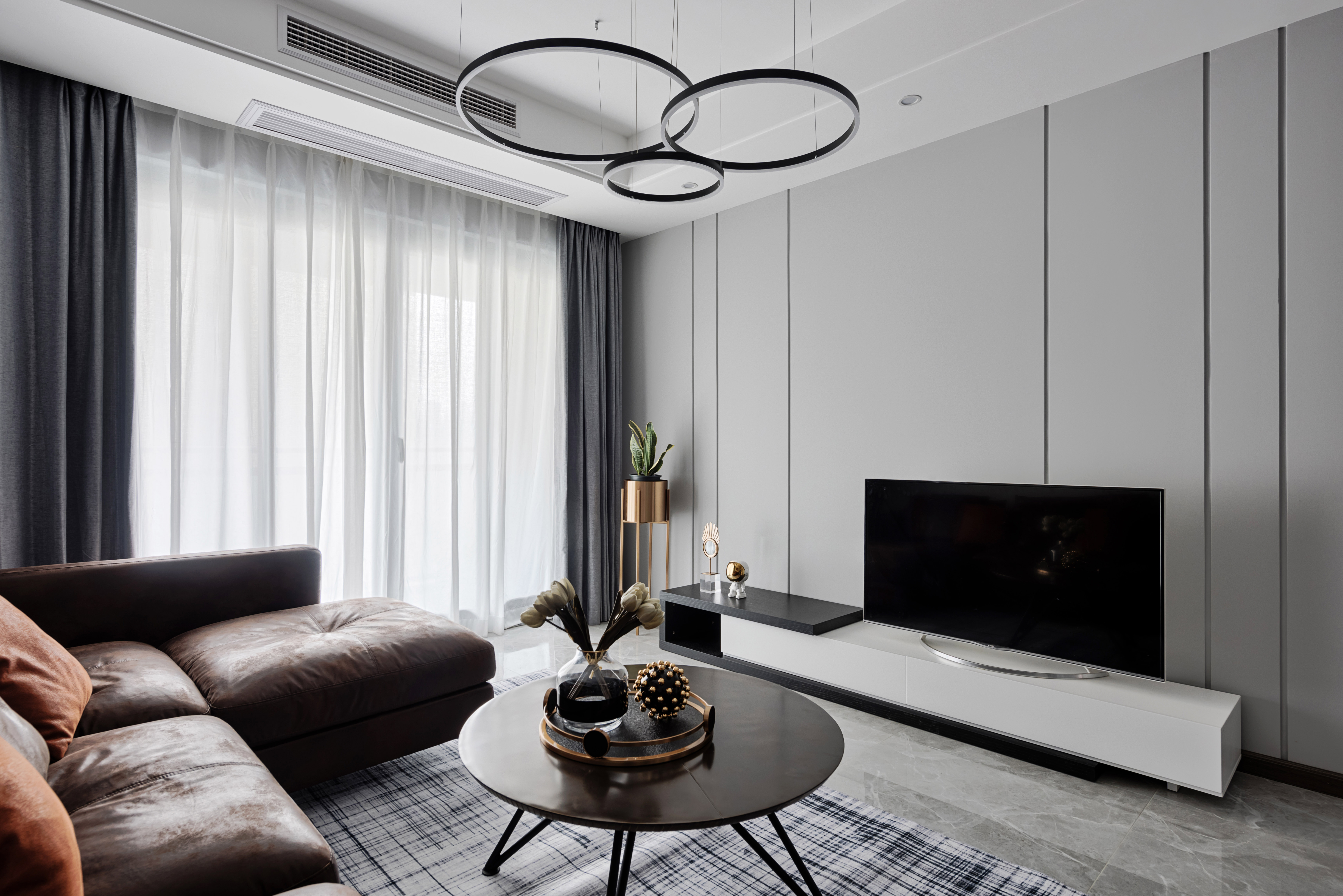 空间整体采用极简的设计手法,开放的布局,造型干净利落的顶面与墙面,以及冷暖色的相互相融,体现出追求生活品质的现代简约的家居氛围