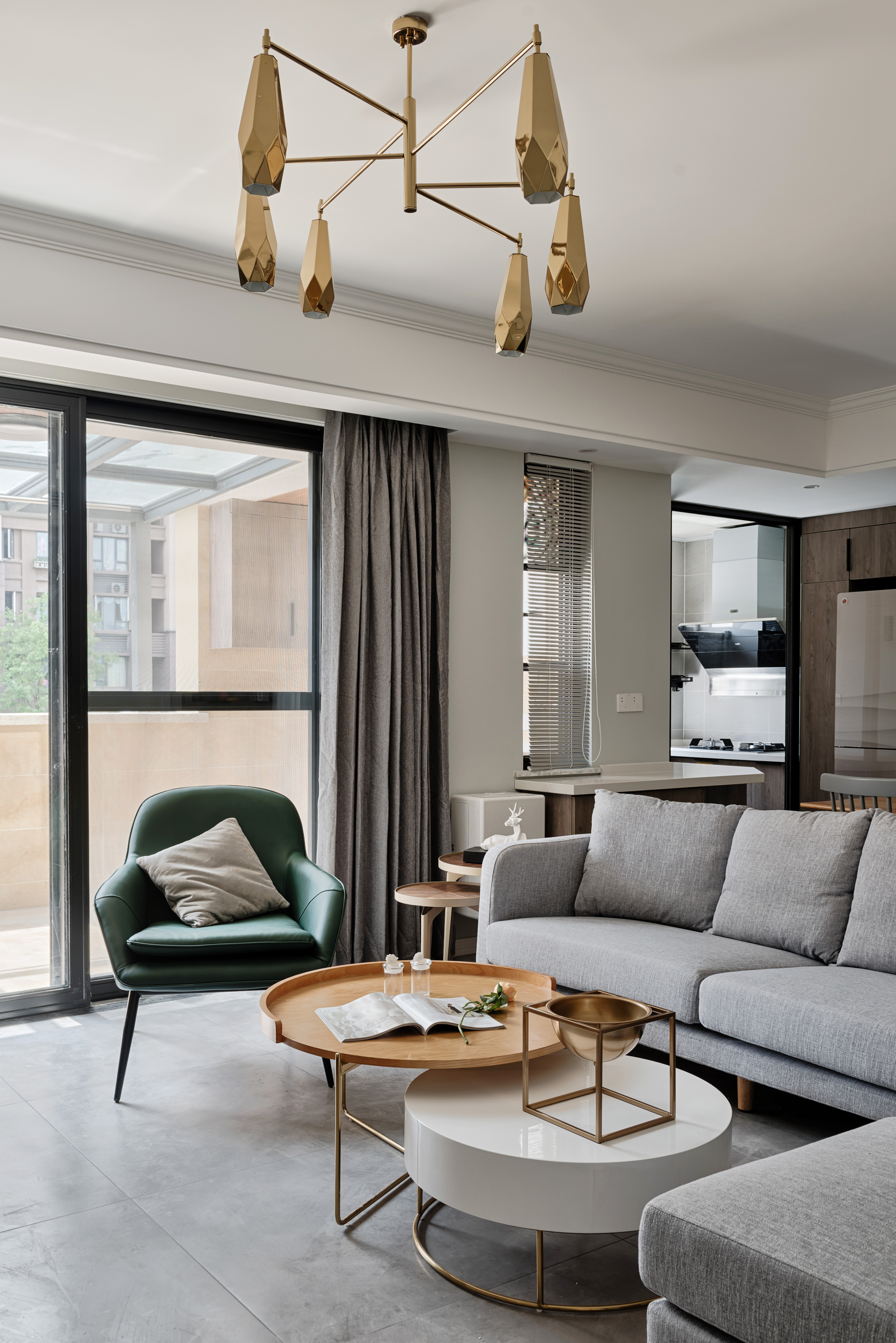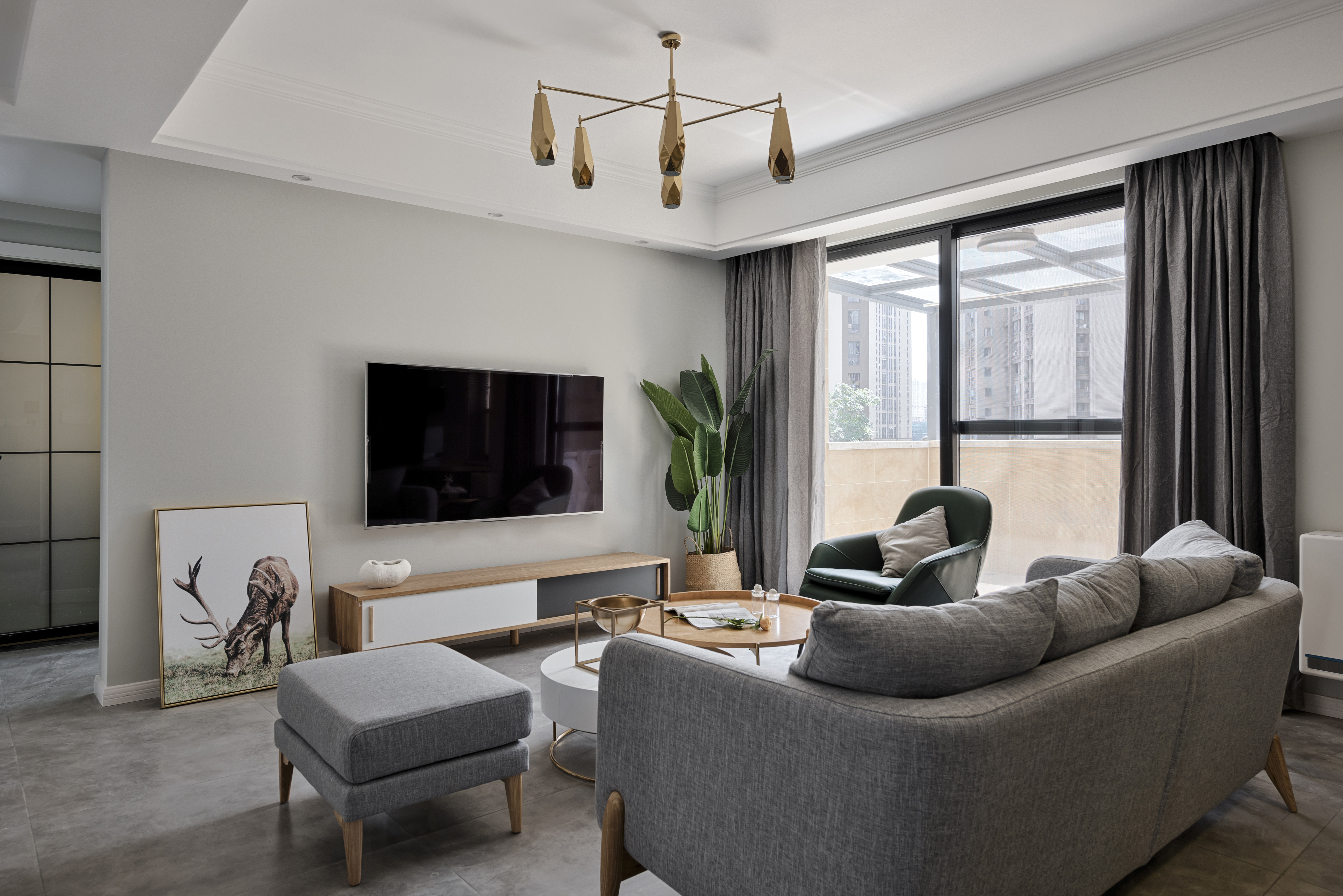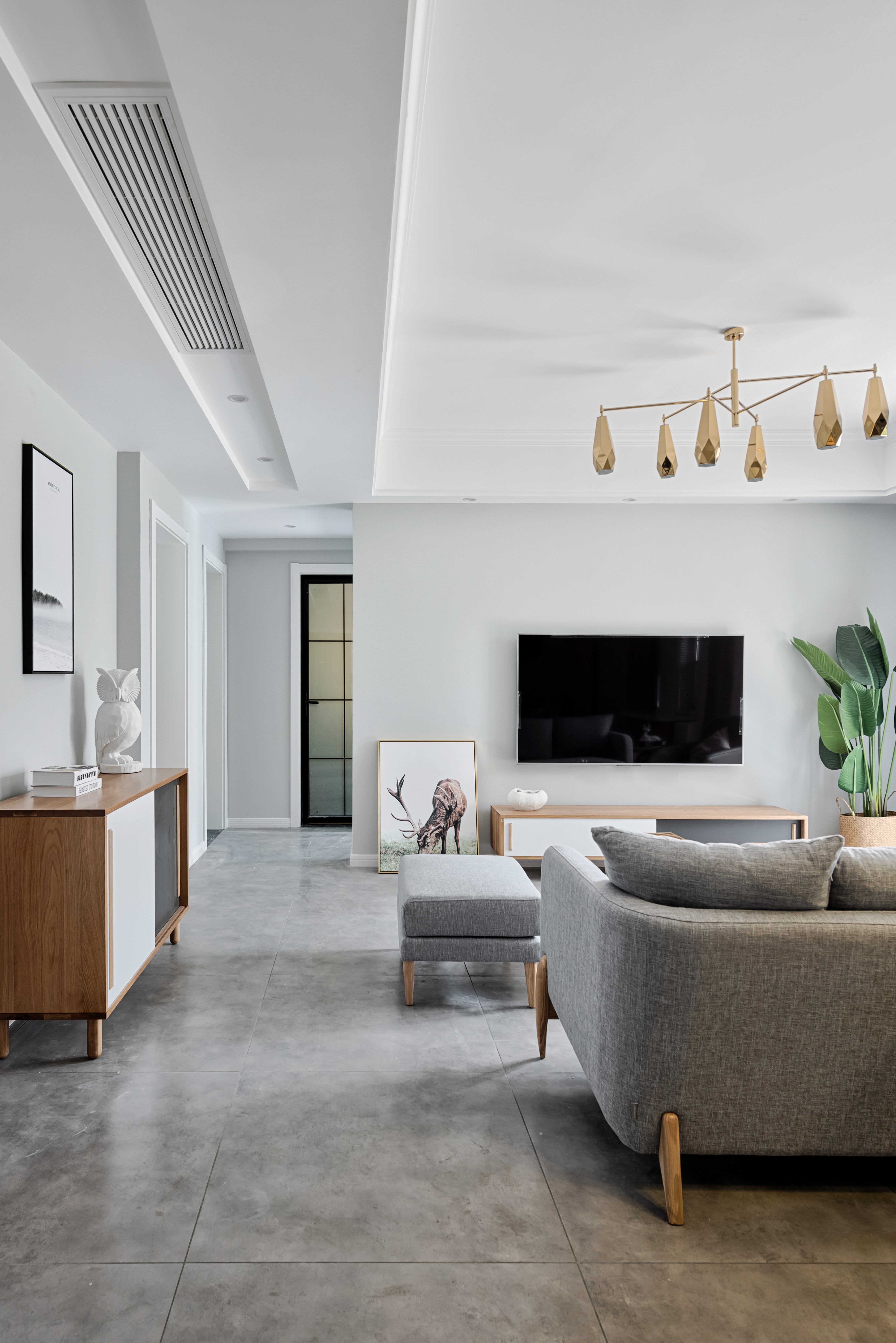 空间里每件家具都是经过设计师的精挑细选,将自然与时尚更加完美的融合在一起。菱形多边金属吊灯与木质电视柜和金属烤漆茶几,在空间当中折射出更美的光照效果