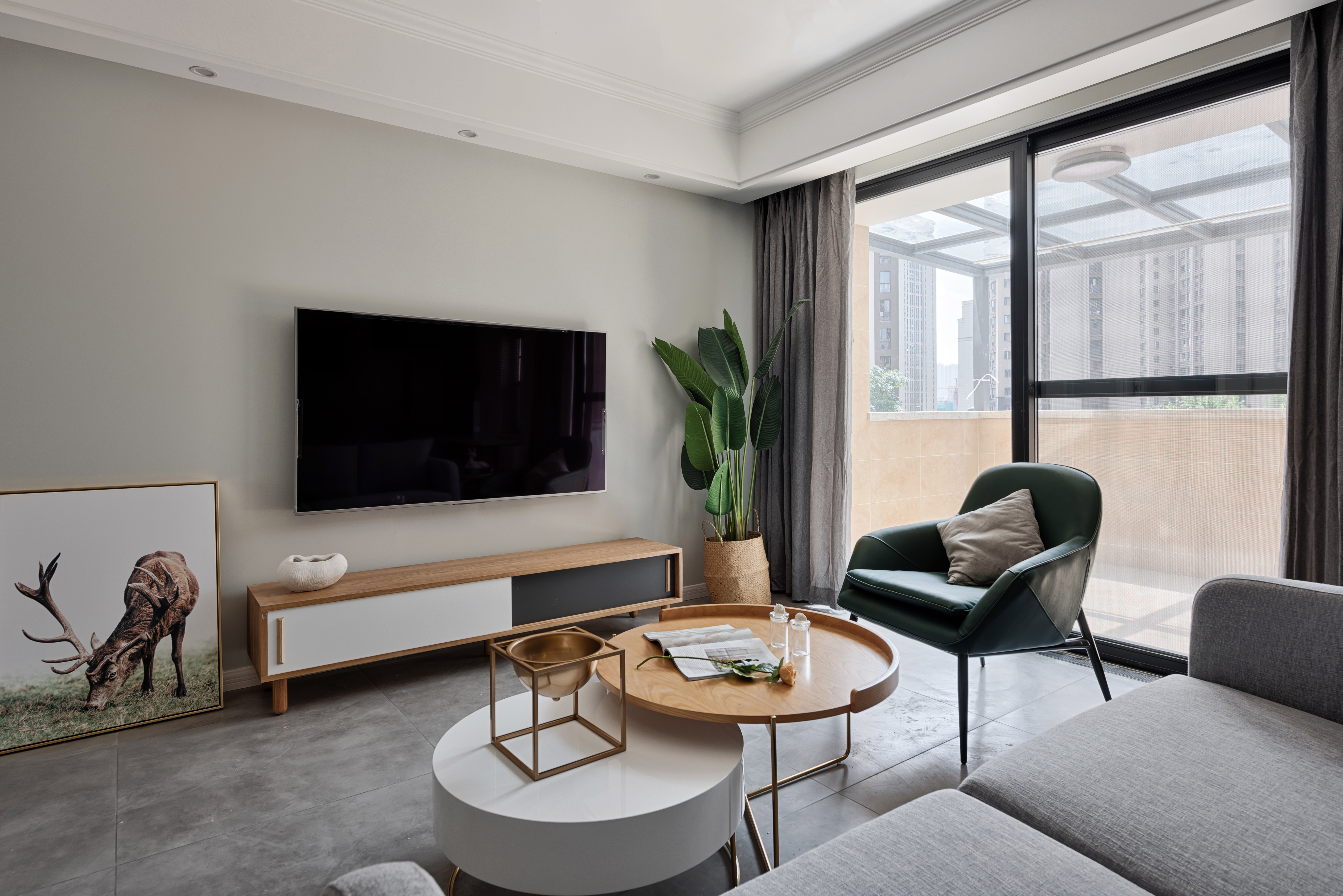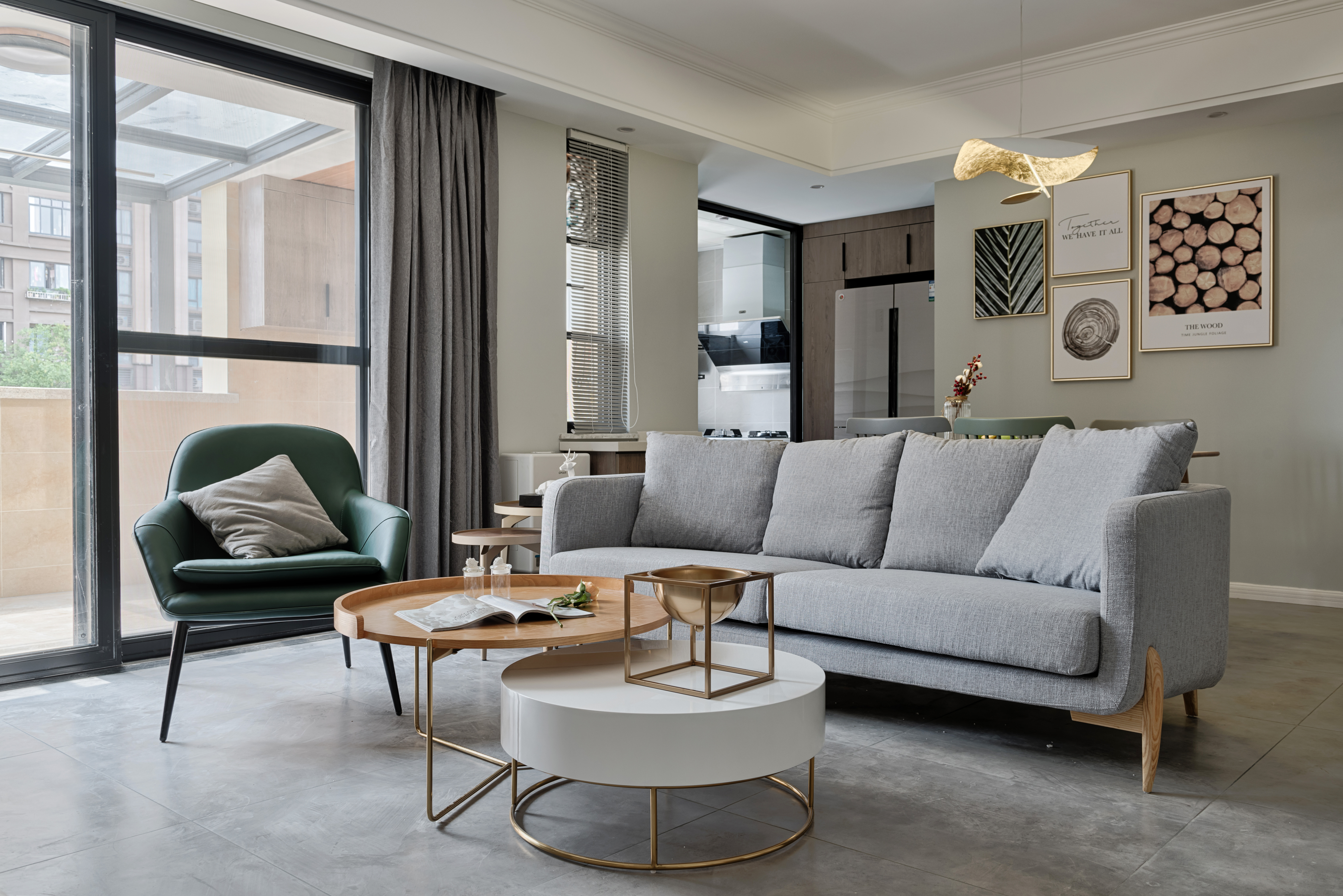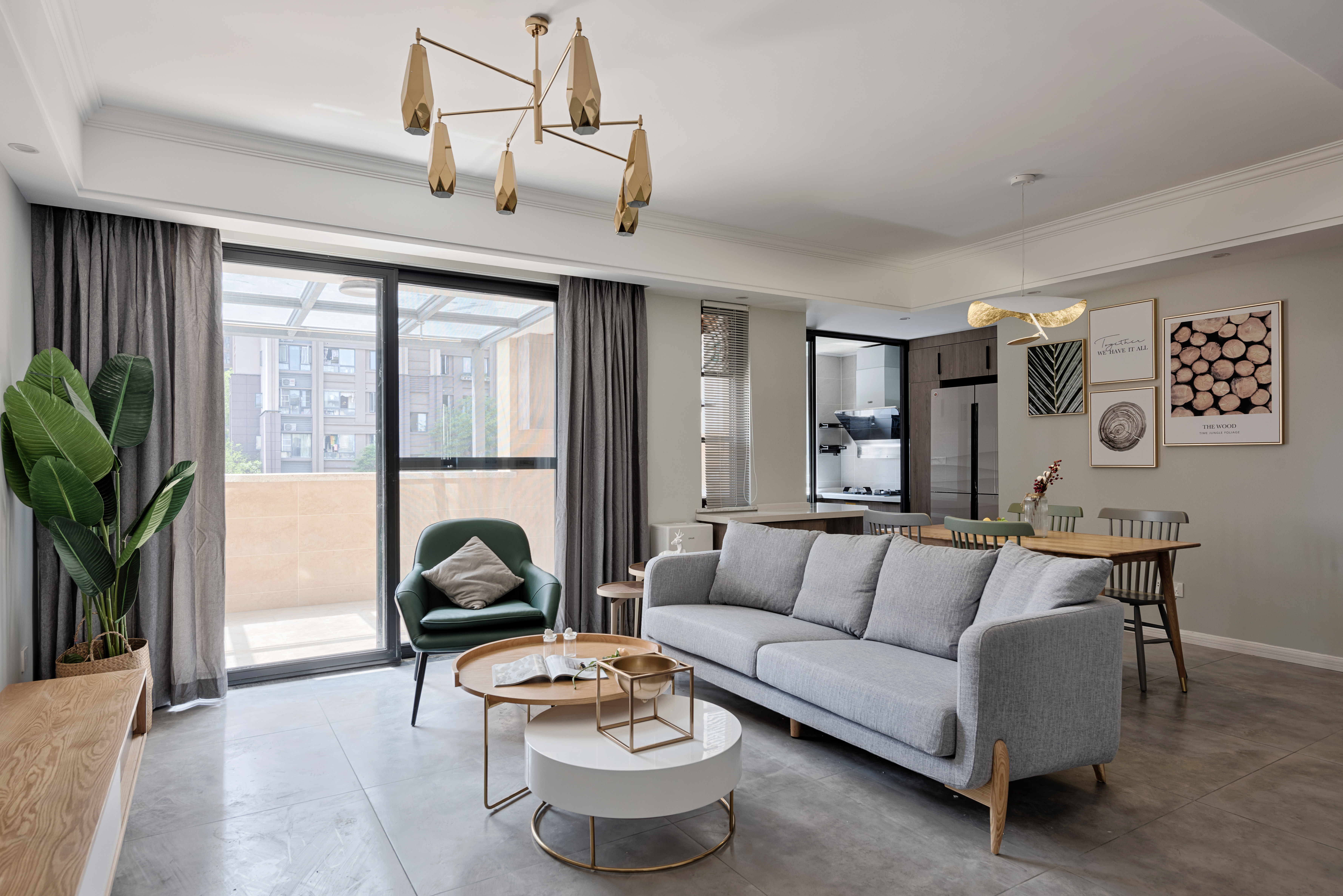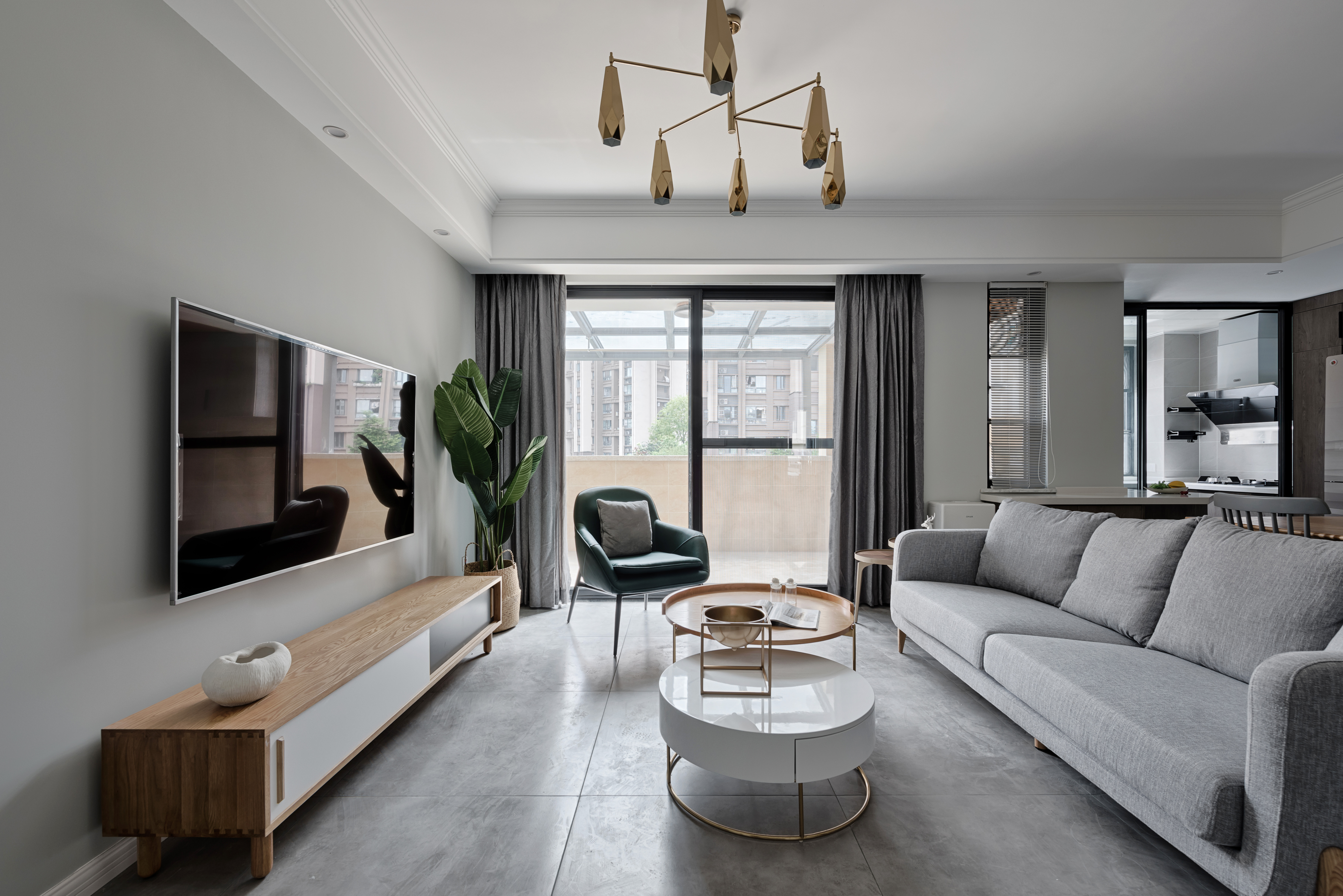 空间里每件家具都是经过设计师的精挑细选,将自然与时尚更加完美的融合在一起。菱形多边金属吊灯与木质电视柜和金属烤漆茶几,在空间当中折射出更美的光照效果